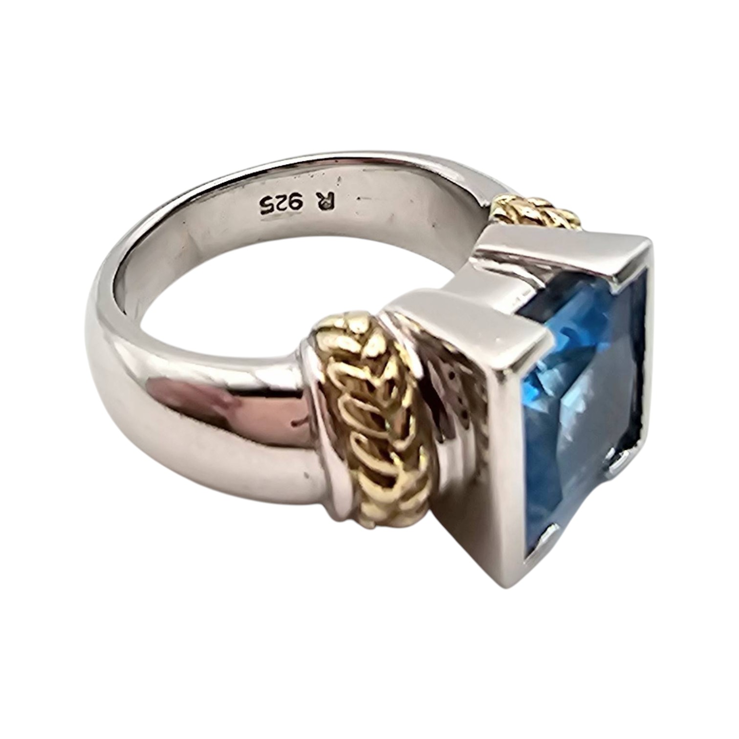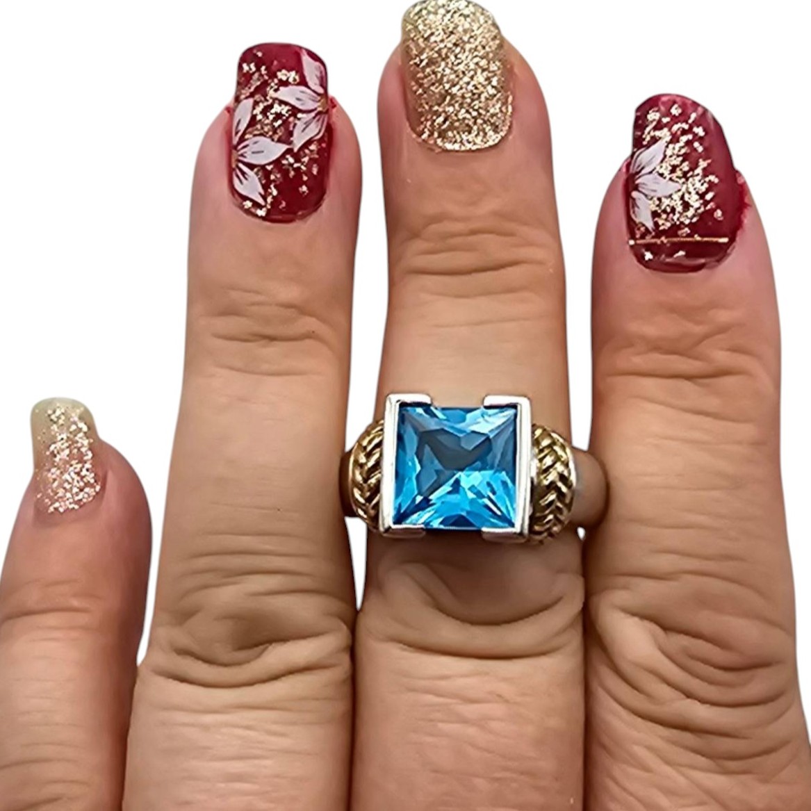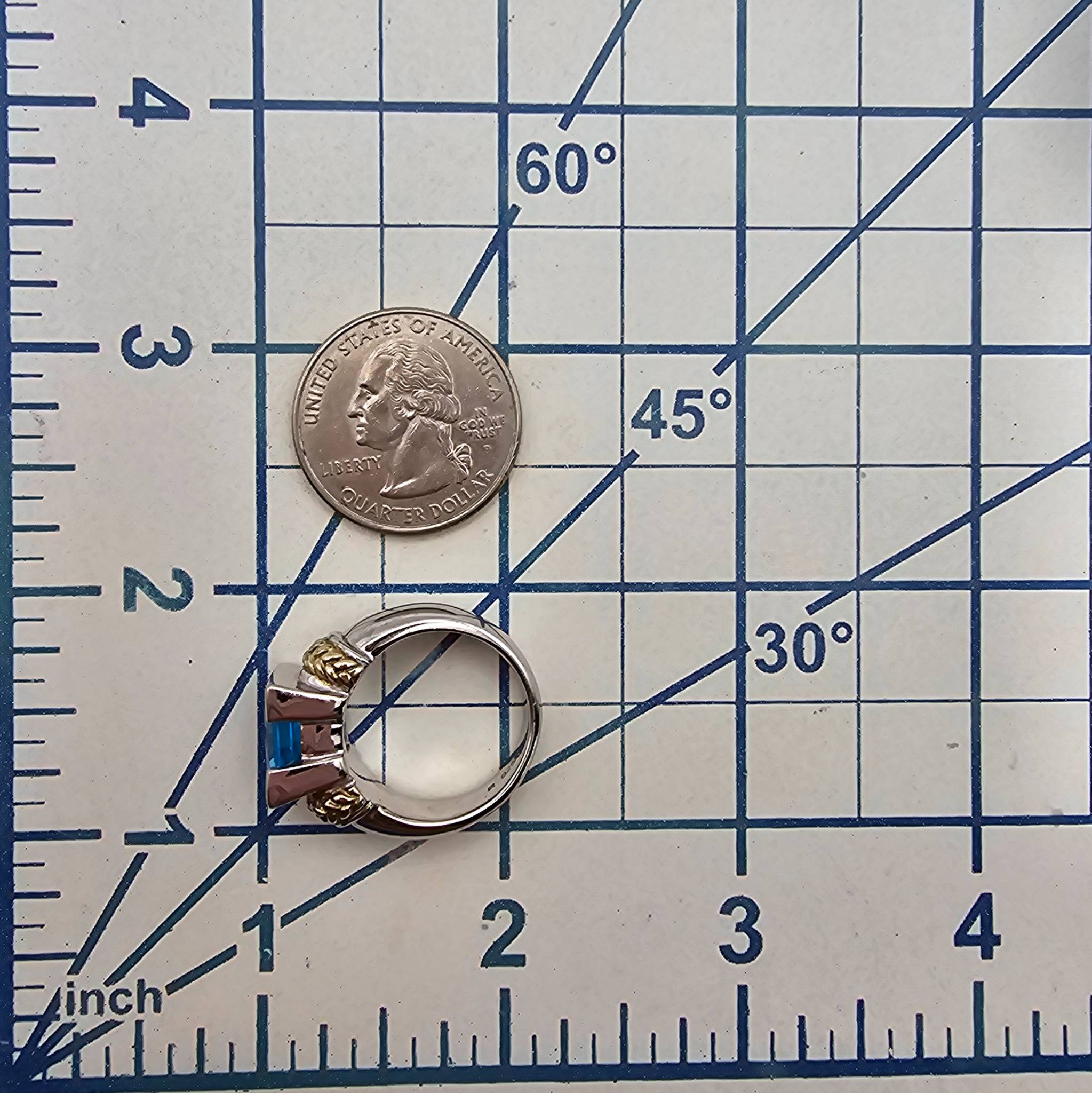 Sterling silver ring featuring a square-cut blue topaz center stone. The band is marked with “925” for sterling silver and includes gold-tone accents flanking the gemstone. Size is 7.75, and the total weight is 14.7 grams. The piece is in good condition, displaying elegant craftsmanship and vibrant stone clarity.
