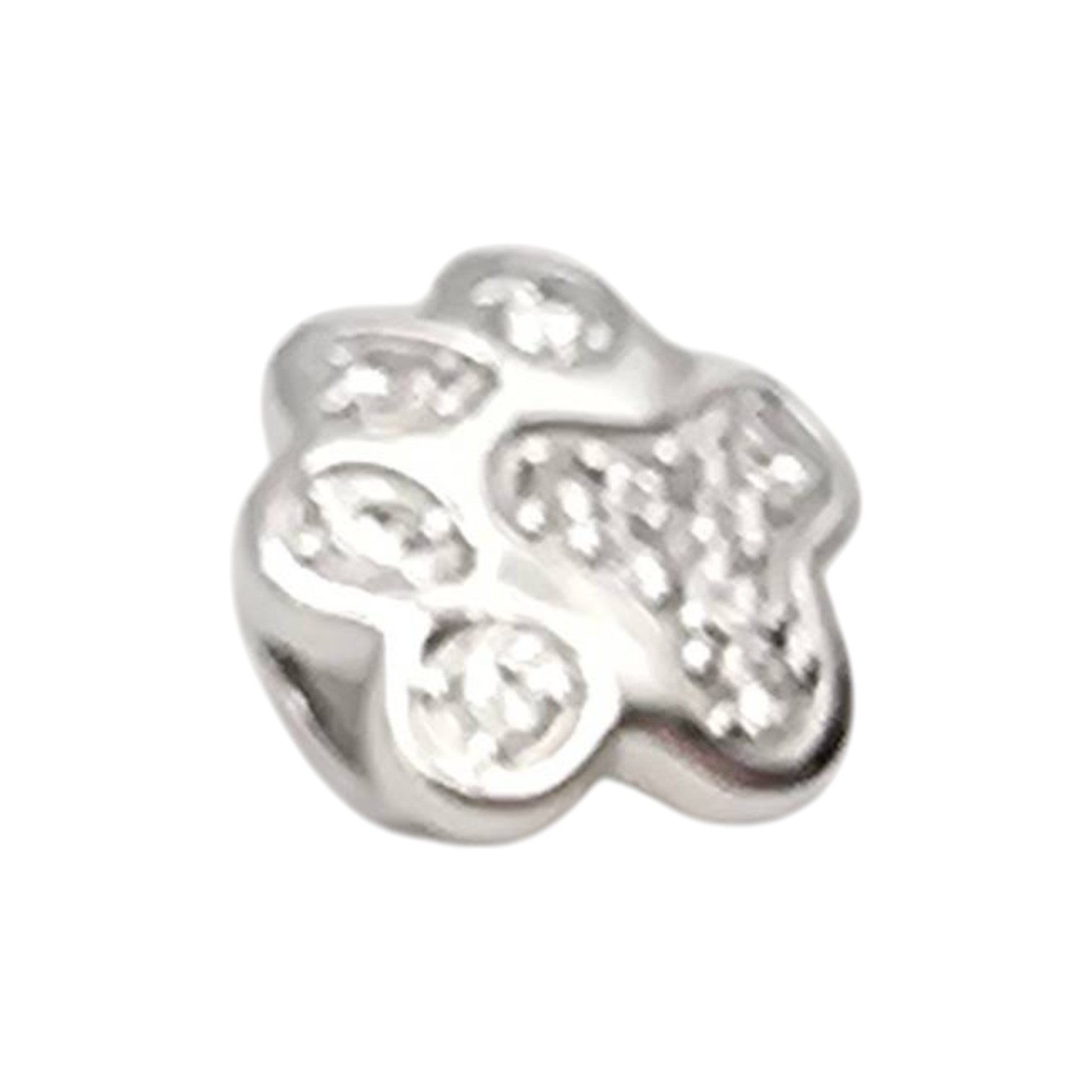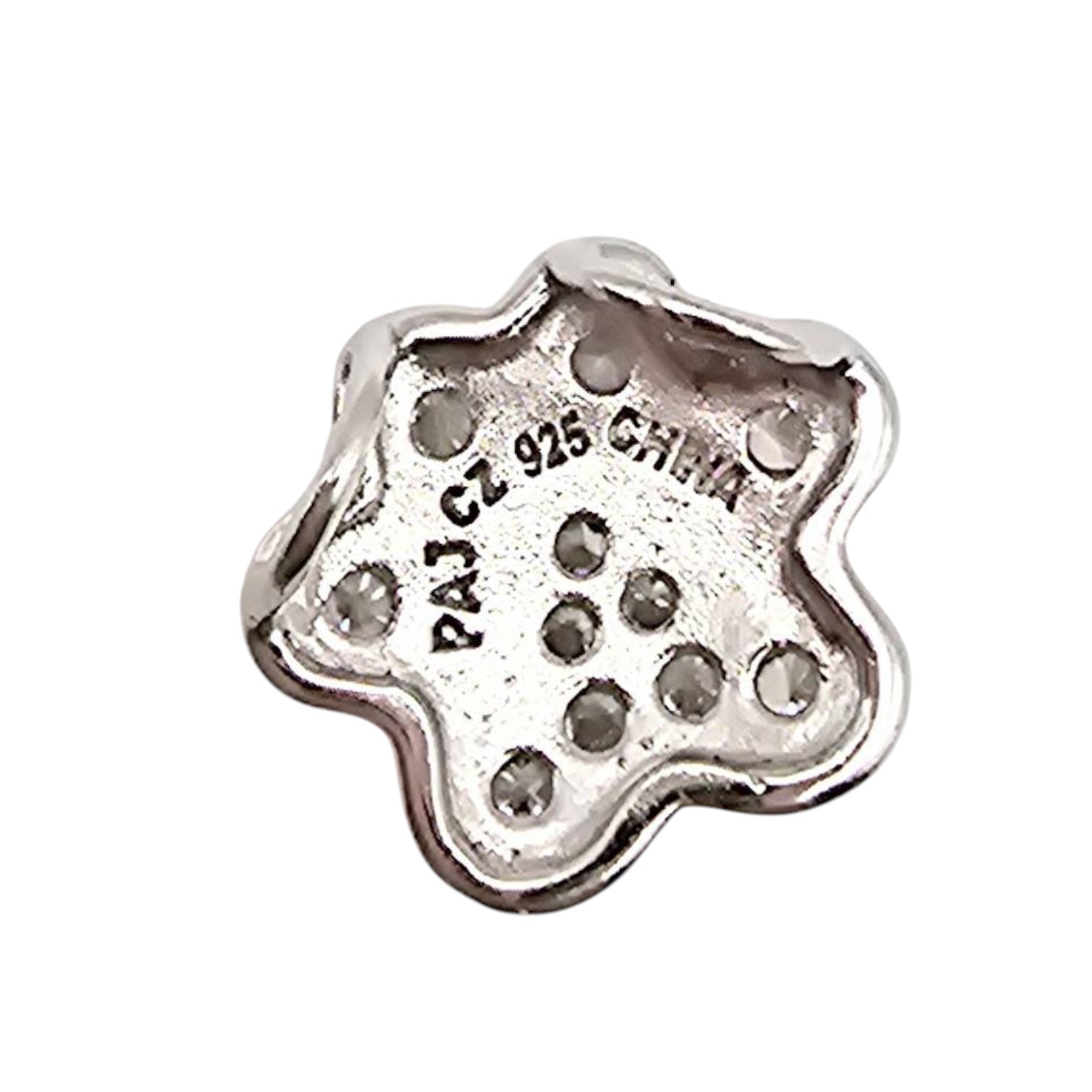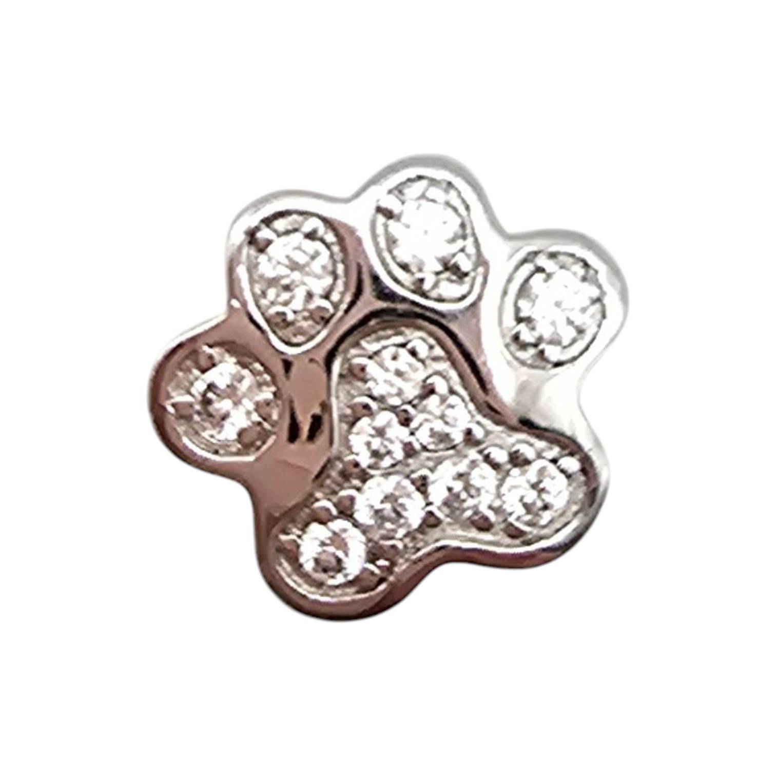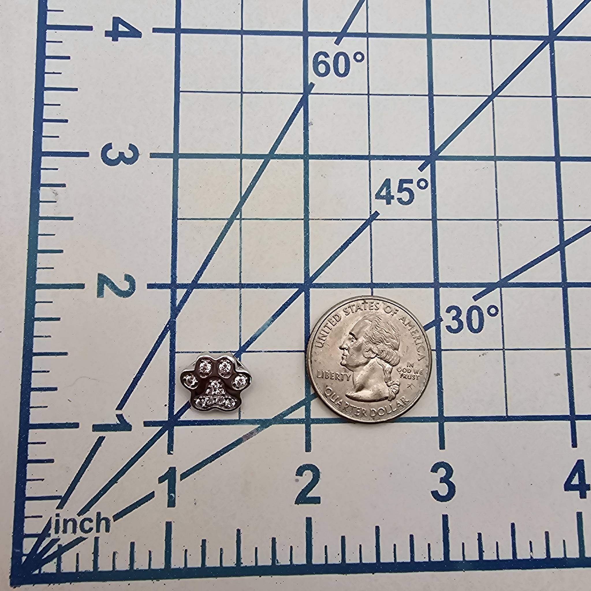 Sterling silver paw print pendant by PAJ marked ‘PAJ CZ’ on the reverse. Accented with CZ stones for added sparkle. Weighs approximately 1.5 grams. Compact size as shown against a quarter for scale, making it ideal for charm bracelets or necklaces.