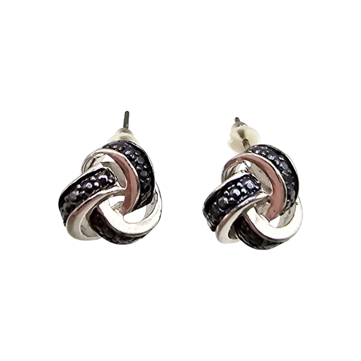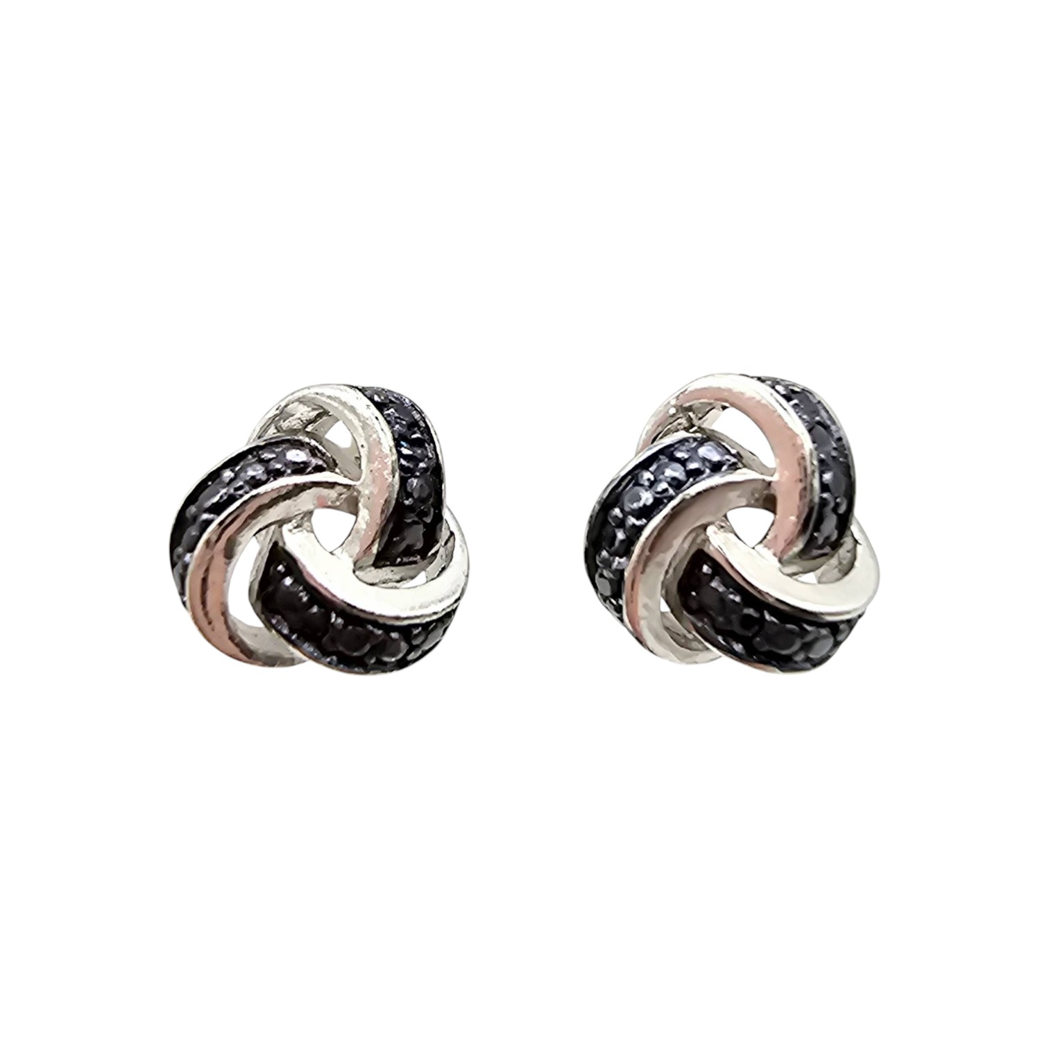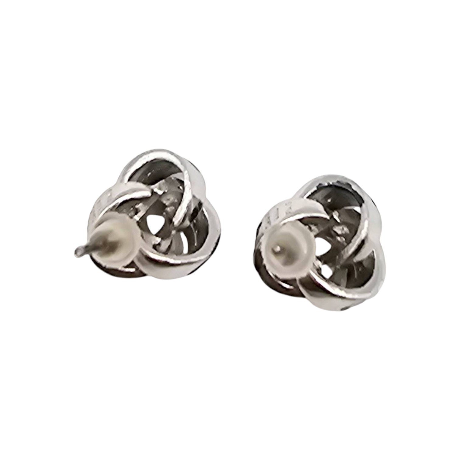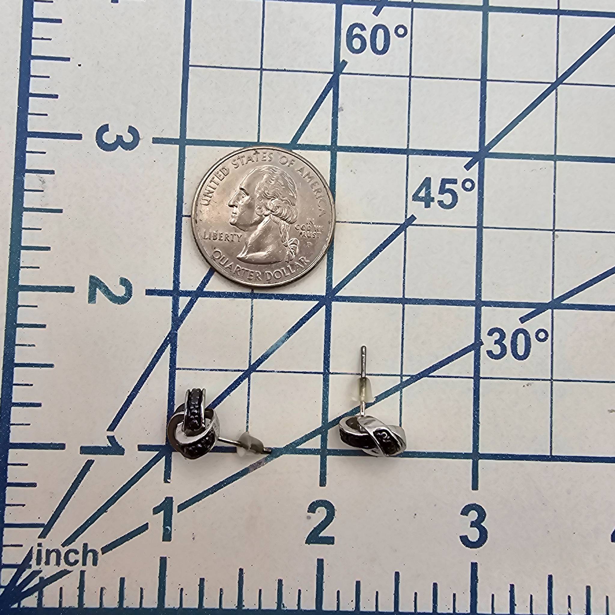 FAS knot-style earrings crafted from sterling silver, featuring diamond accents. The earrings weigh approximately 3.1 grams in total and include secure backs for wear. Elegant design suitable for various occasions. Diameter and additional dimensions noted against scale in images.