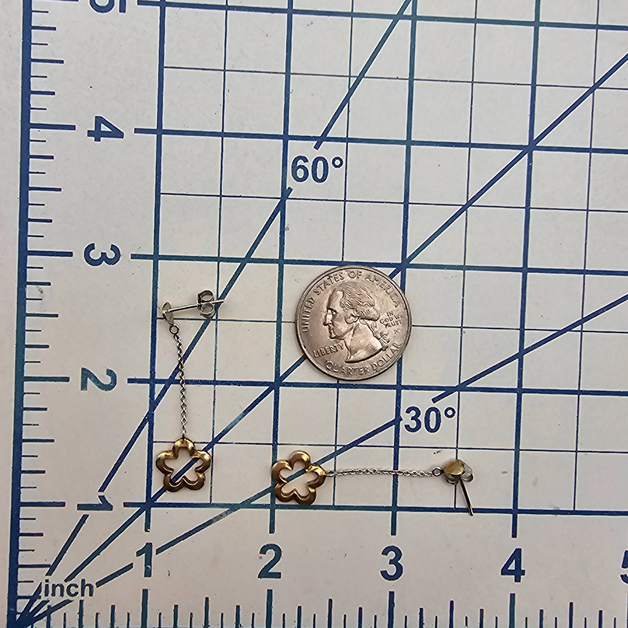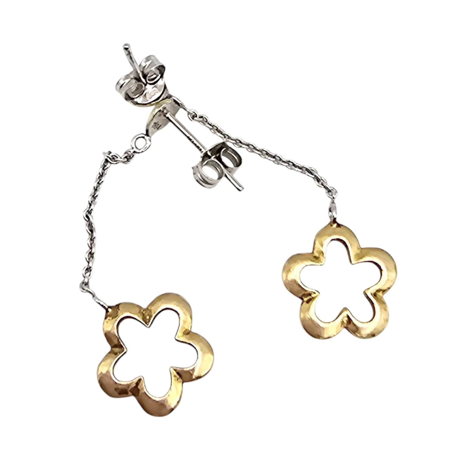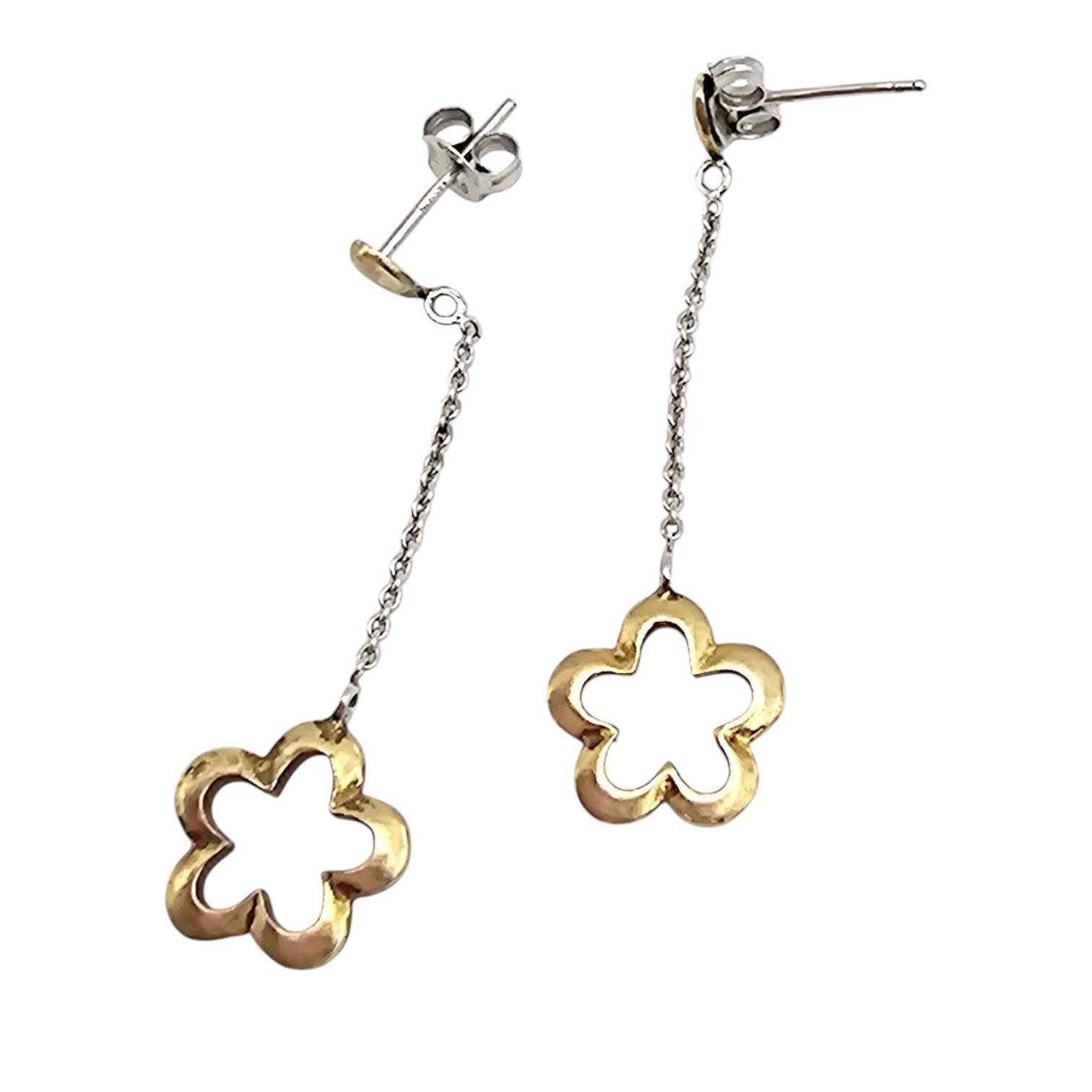 Dangle earrings marked FAS crafted from sterling silver with gold over floral charms. Each earring features a delicate chain connecting the stud to the floral charm. Total weight is indicated as 2.1 g. Excellent for jewelry collectors or casual wear.