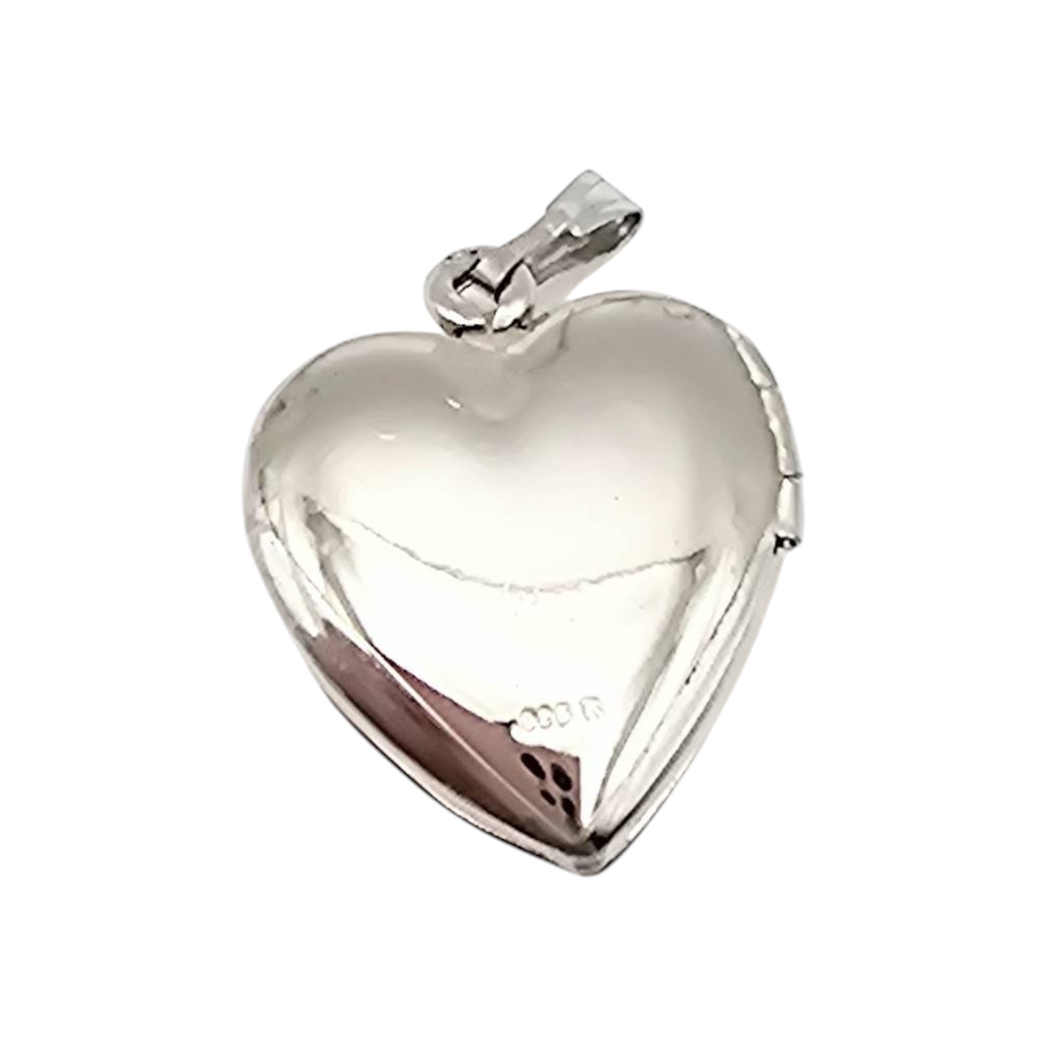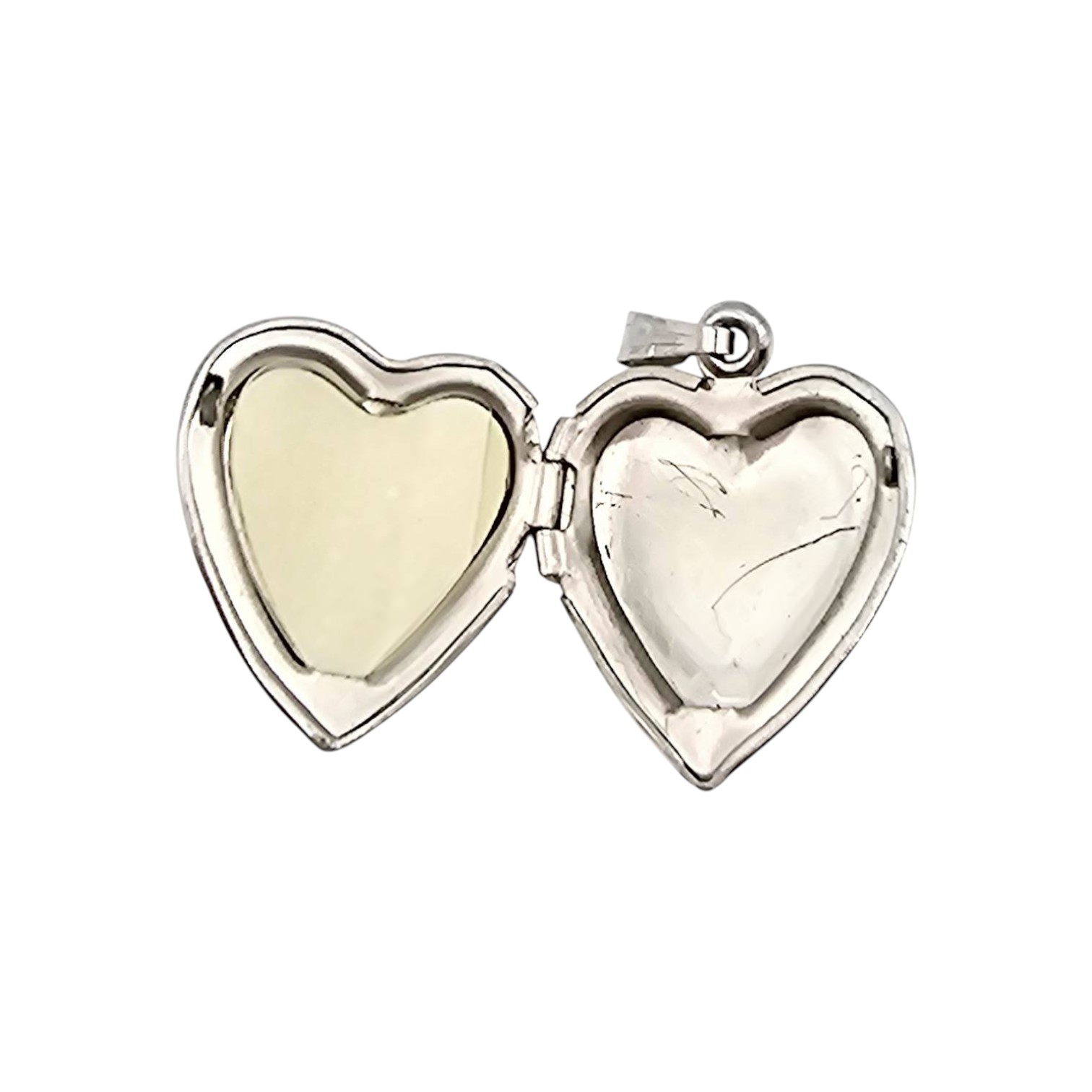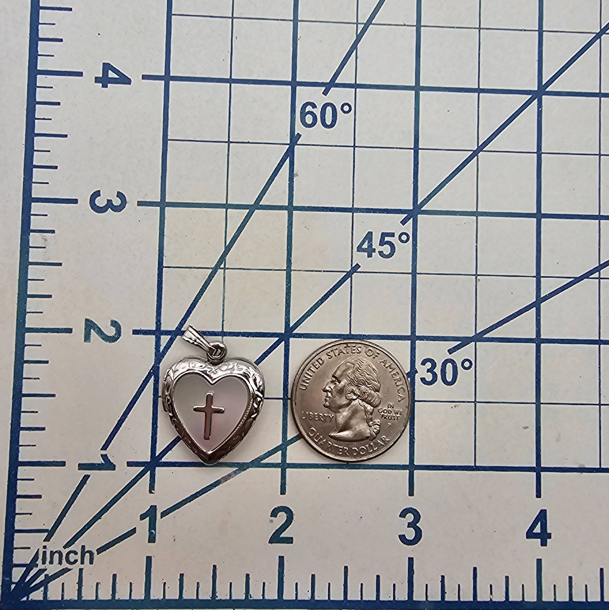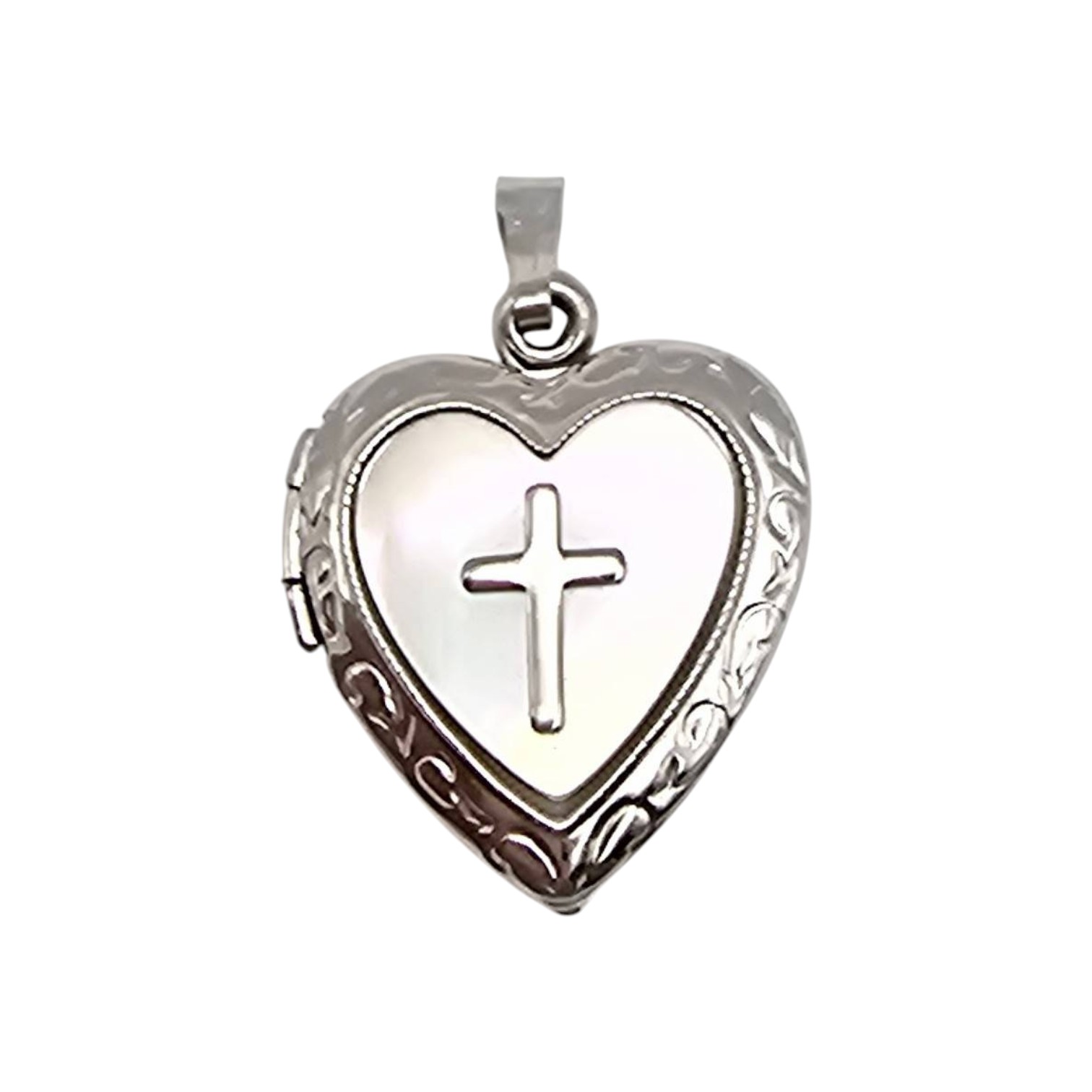 Sterling silver heart-shaped locket pendant featuring a mother-of-pearl front inlay with a cross design. The pendant weighs 3.5 grams and has intricate details on the edge. It includes a hinge mechanism, allowing it to open and hold small keepsakes inside. The reverse side is polished silver.
