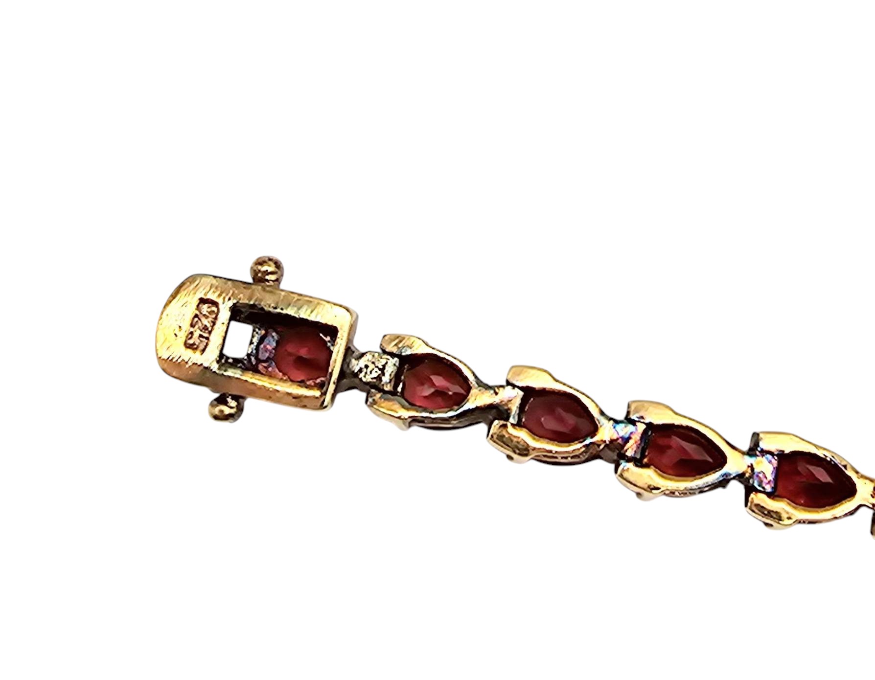 Gold over sterling silver tennis bracelet featuring rhinestones set in a stylish pattern. Weighing 12.7g, the bracelet has a secure clasp marked ‘925’. Features gold plating over the sterling silver, adding a refined touch.
