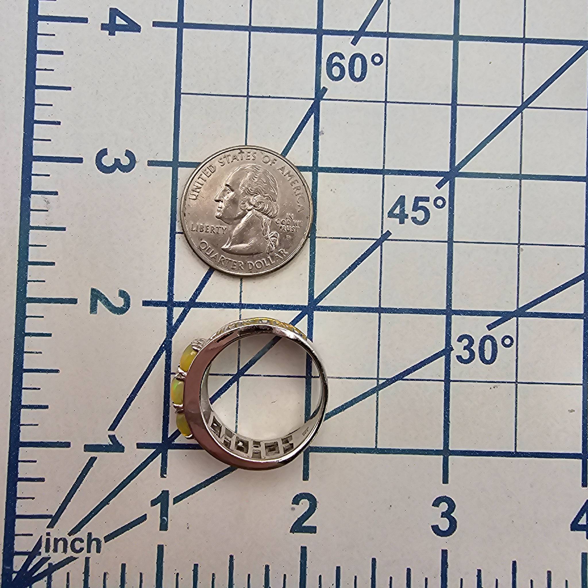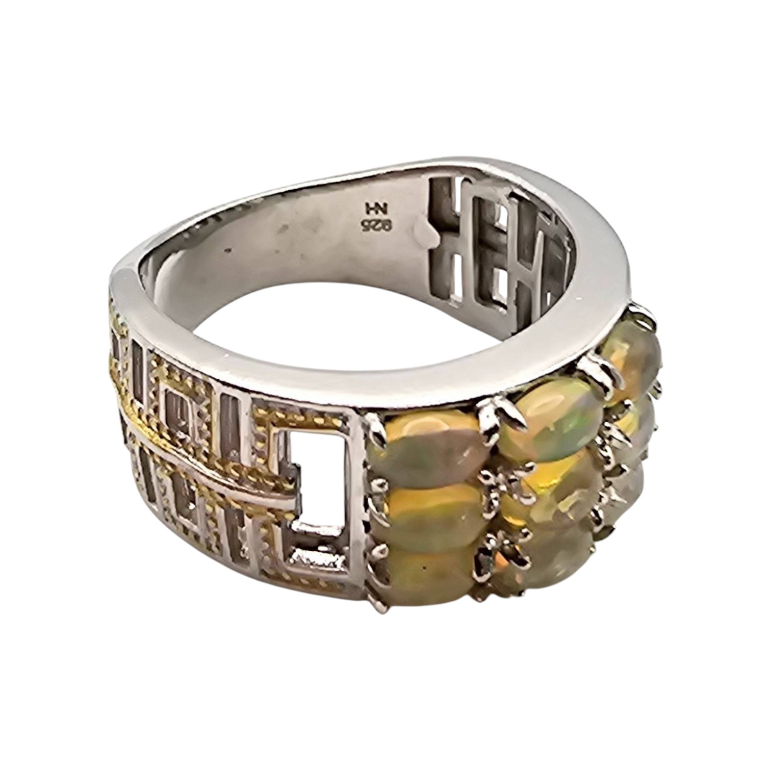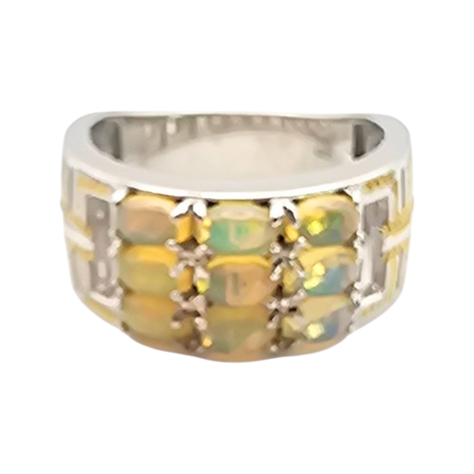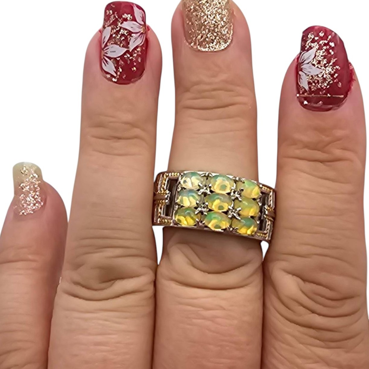 Sterling silver ring marked ‘NH’ featuring opalite stones in a rectangular grid arrangement. The ring is size 9.5 and weighs 8.3 grams. The geometric design on the band complements the iridescent opalite stones. Suitable for a variety of occasions.