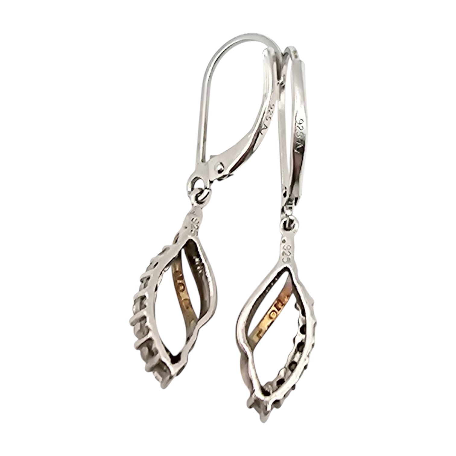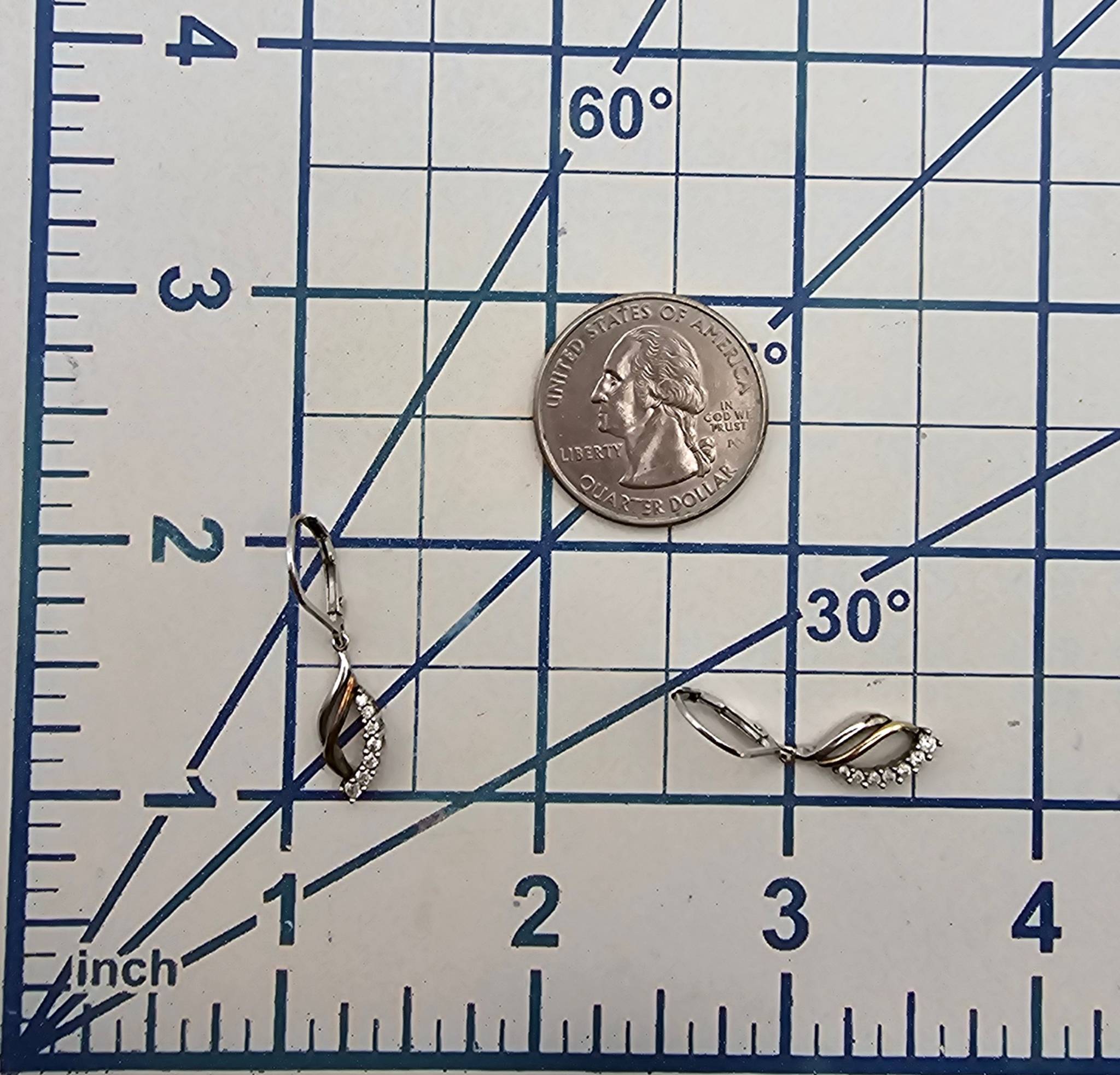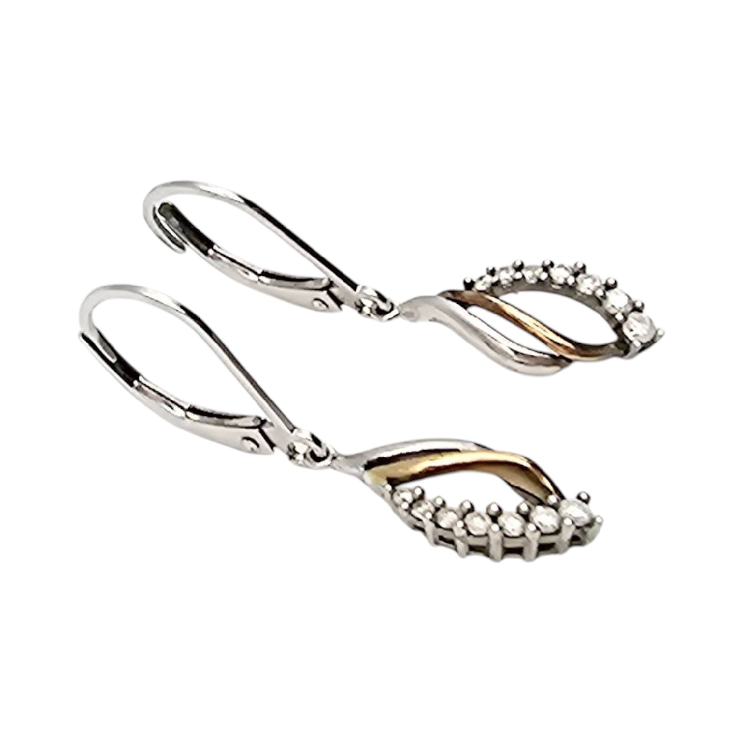 Earrings crafted from 14k gold and sterling silver, featuring an elegant design with a diamond-accented motif. Each earring is equipped with lever-back closures for secure wear. The combined weight is approximately 1.8 grams.