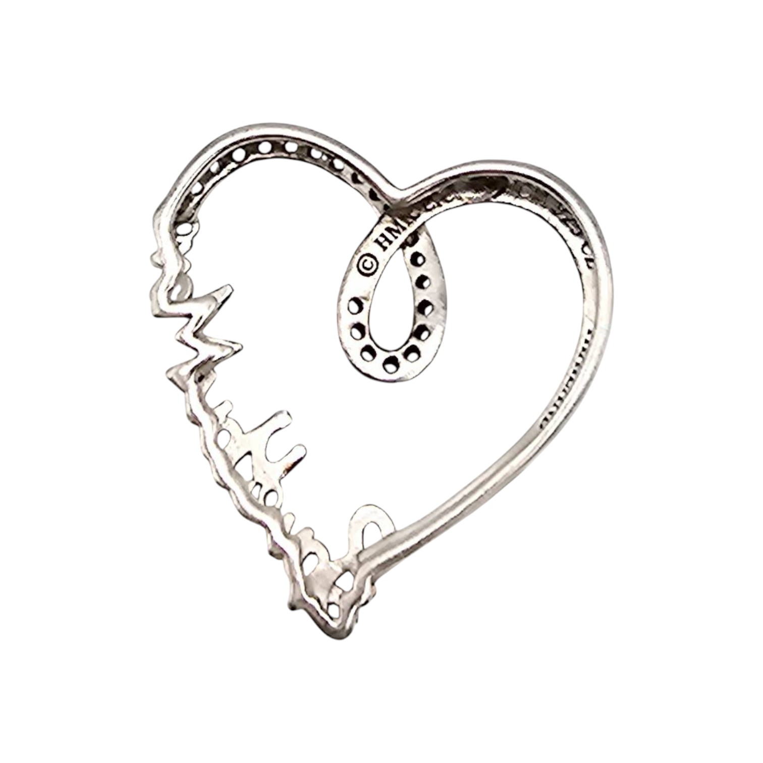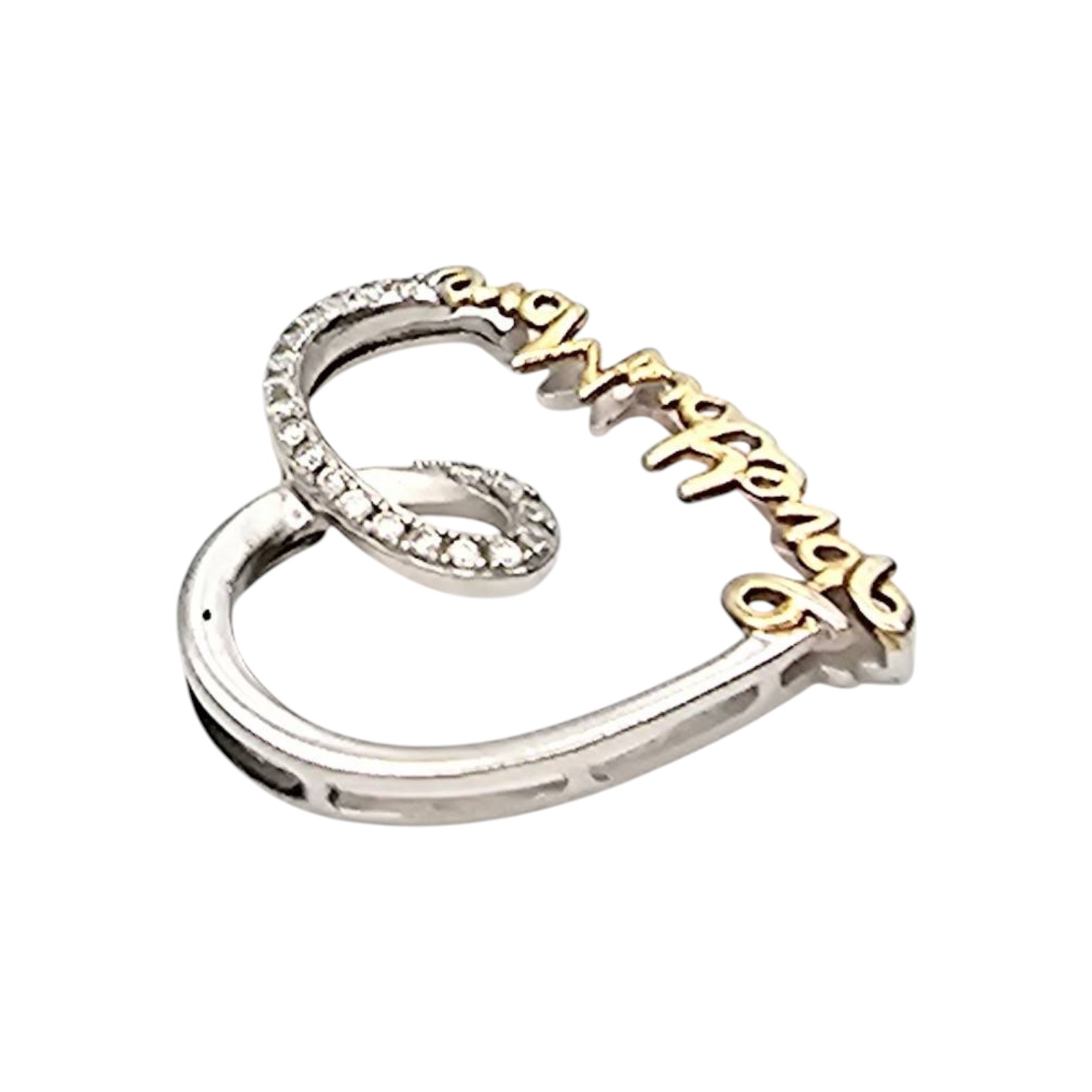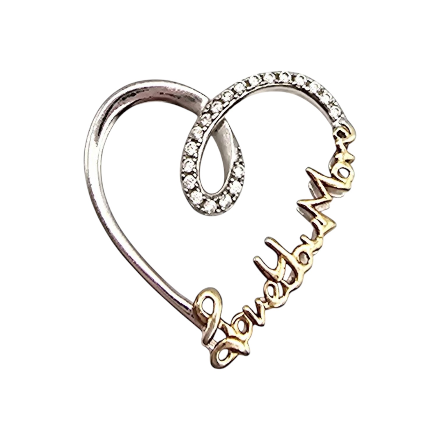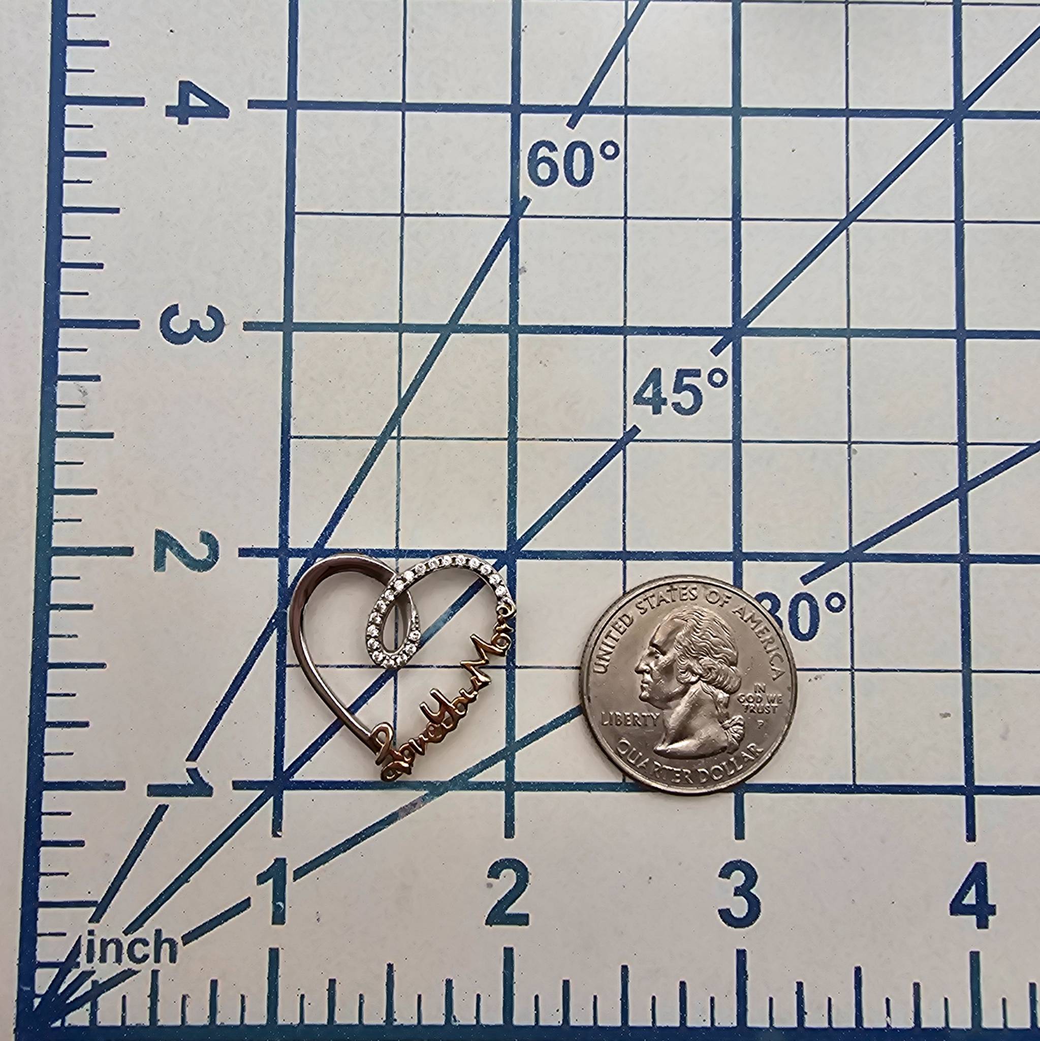 JCM Cubic Zirconia sterling silver ‘Love You More’ heart-shaped pendant featuring cubic zirconia accents. The design incorporates the phrase ‘Love You More’ in gold-tone lettering within the openwork heart. Weighing approximately 2.4 grams, the piece is stamped ‘925’ signifying sterling silver. Suitable as a standalone piece or as part of a necklace.