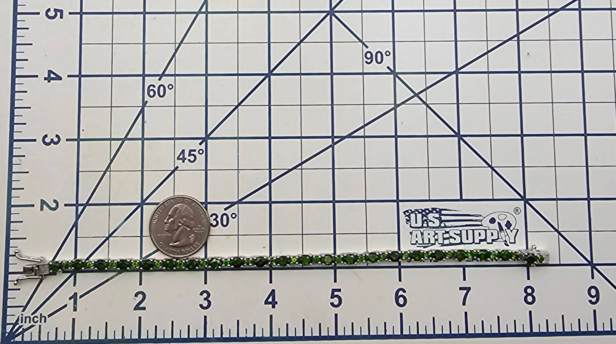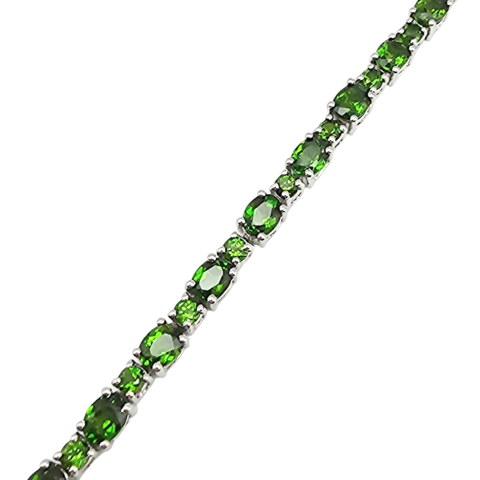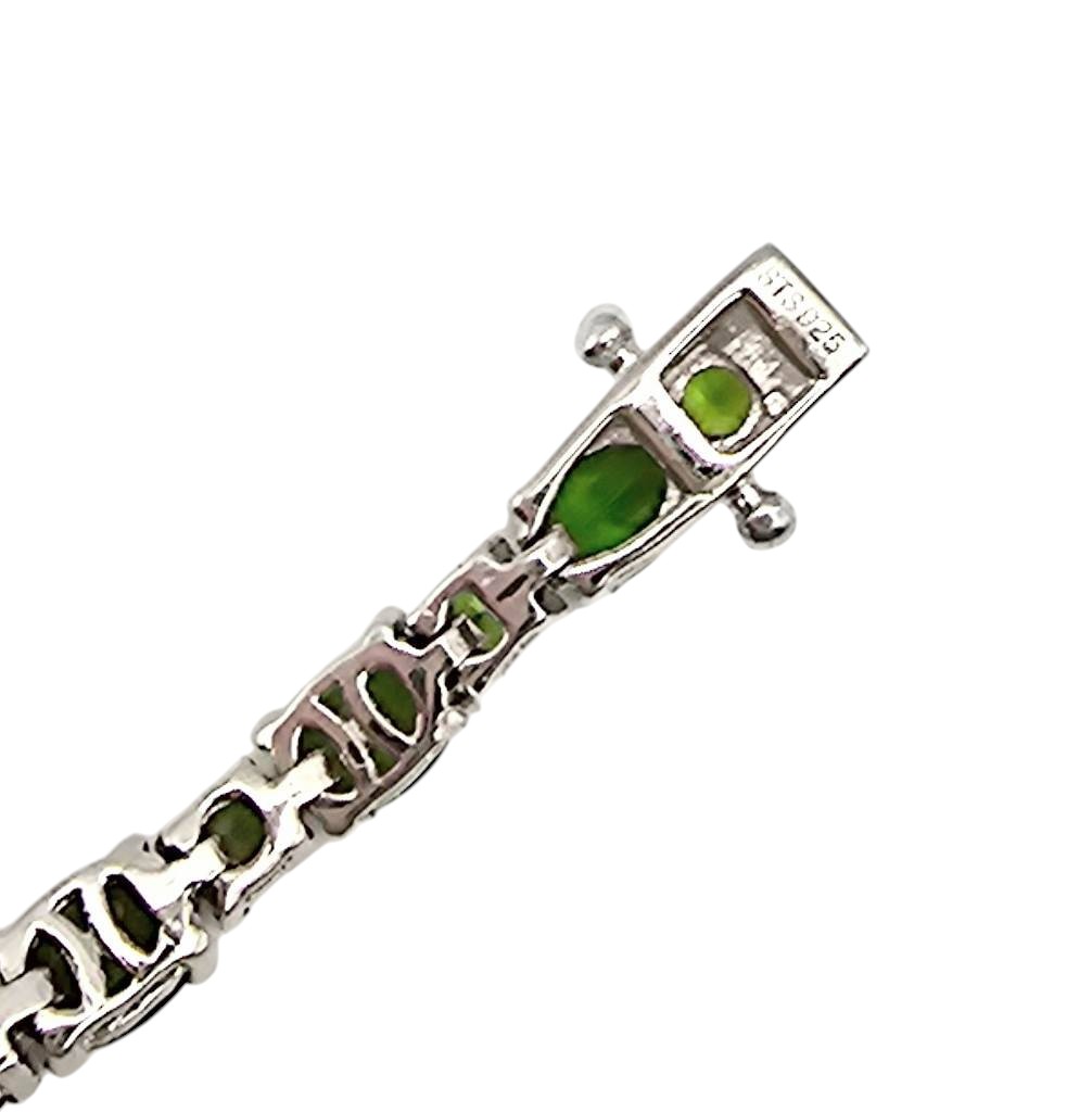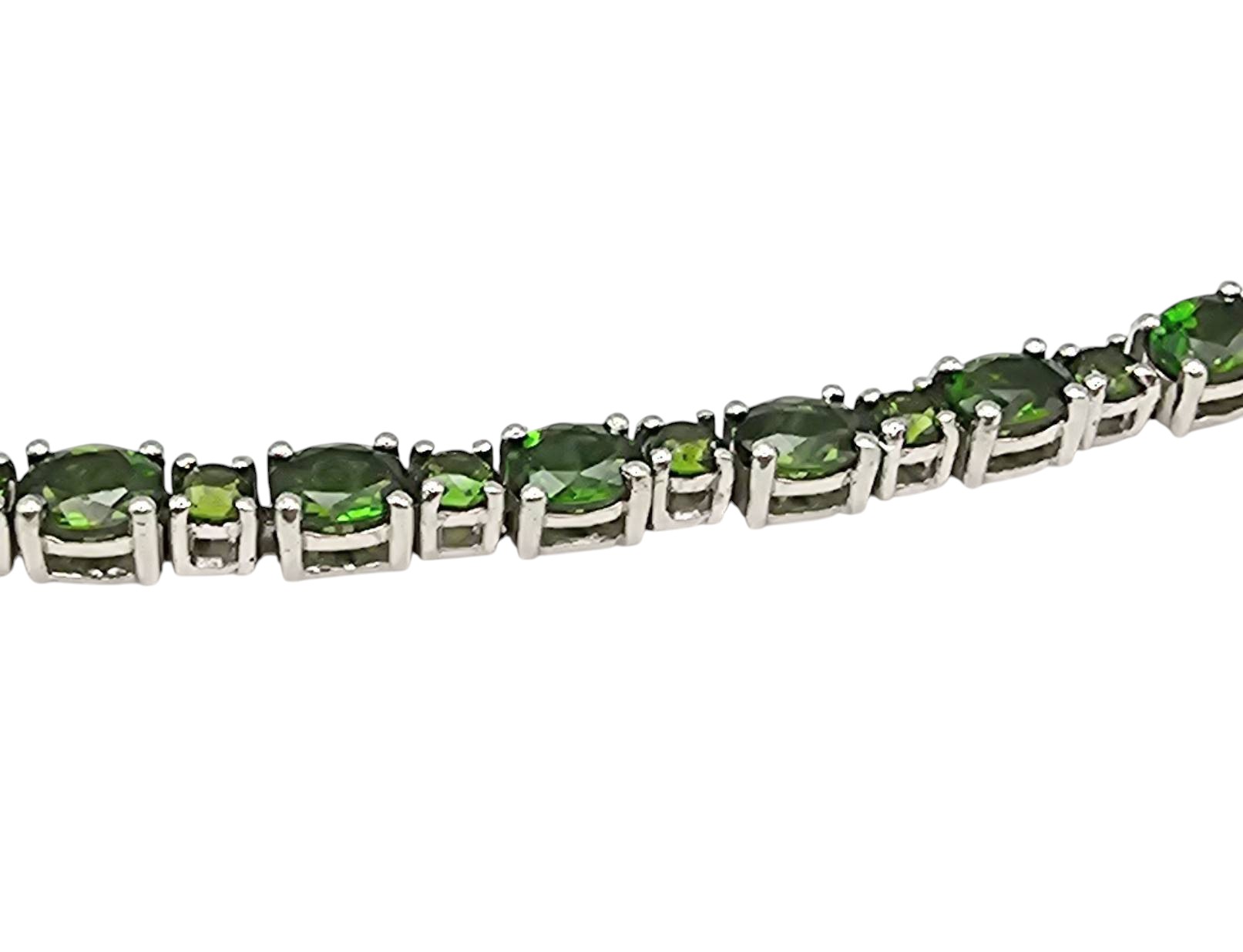 STS | sterling silver tennis bracelet featuring vibrant green tourmaline gemstones. The bracelet weighs 13.1 grams, and the design includes linked settings showcasing oval-cut tourmalines. Stamped with ‘925’ for sterling silver authenticity and equipped with a secure clasp closure. Classic and elegant accessory with high-quality materials.