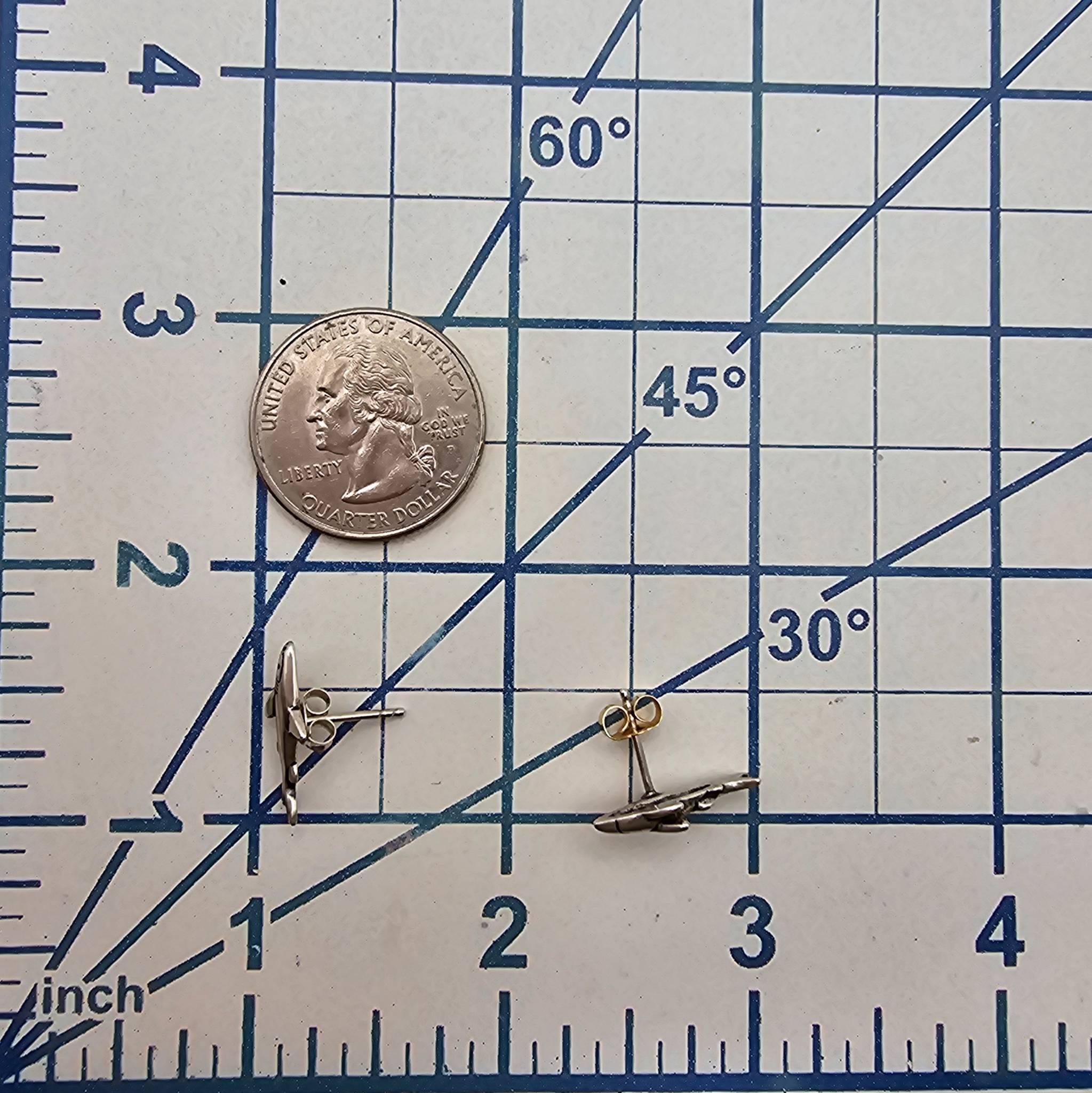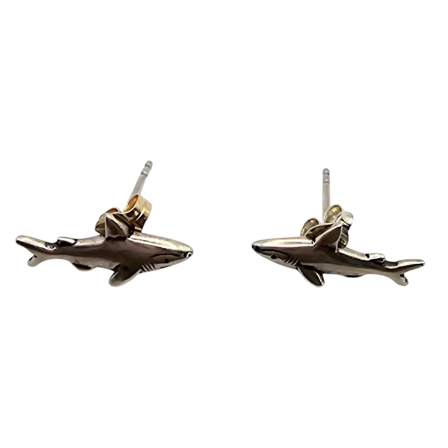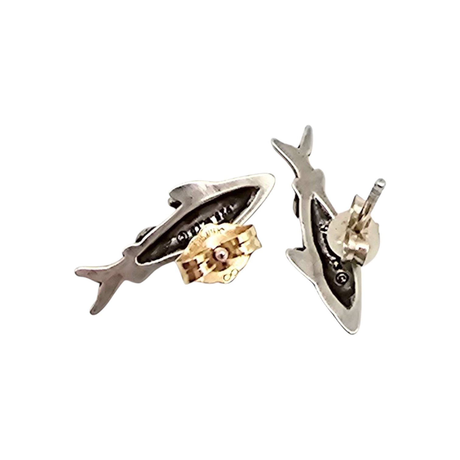 Sterling silver shark-shaped stud earrings, signed and marked 925. Approximate weight is 2.1 grams for the pair. Features butterfly backs for secure wearing. Carefully detailed in their design, showcasing the shark form in polished silver. Ideal for enthusiasts or collectors of unique sterling silver jewelry.