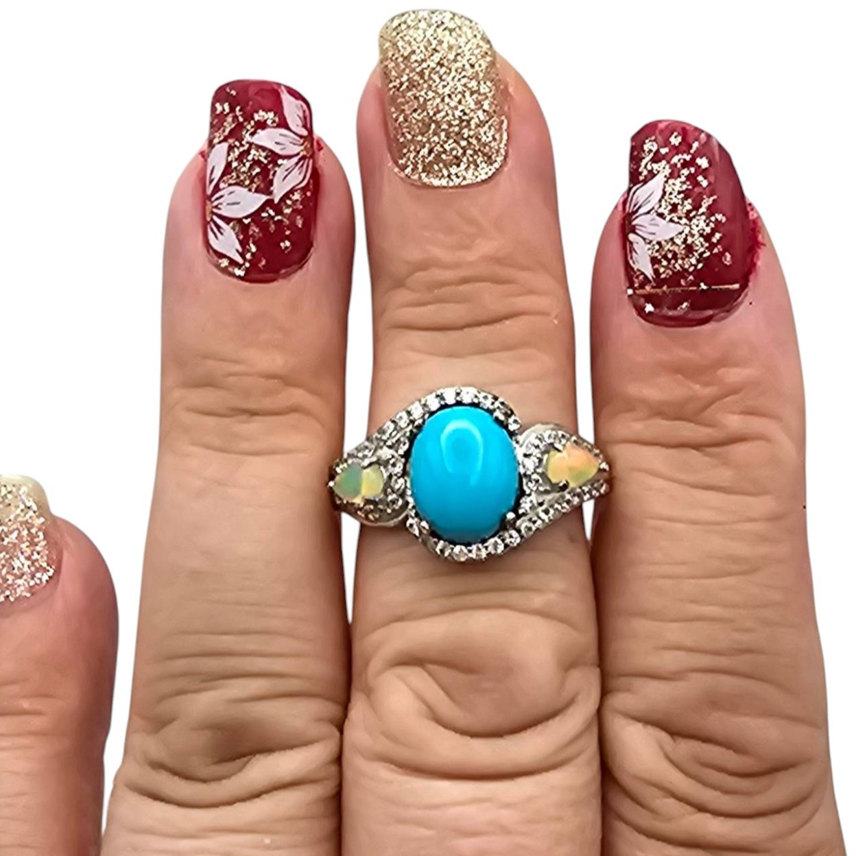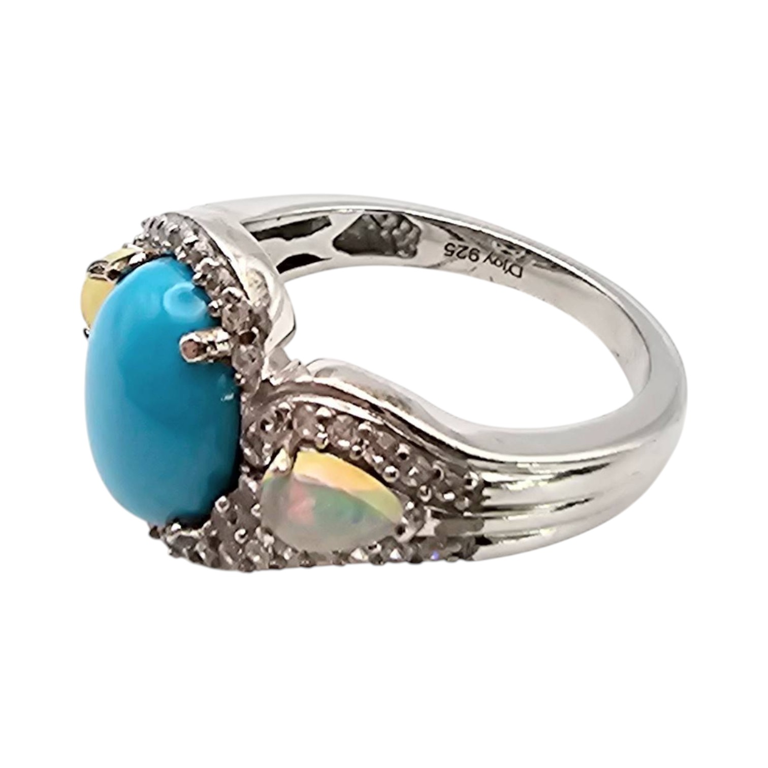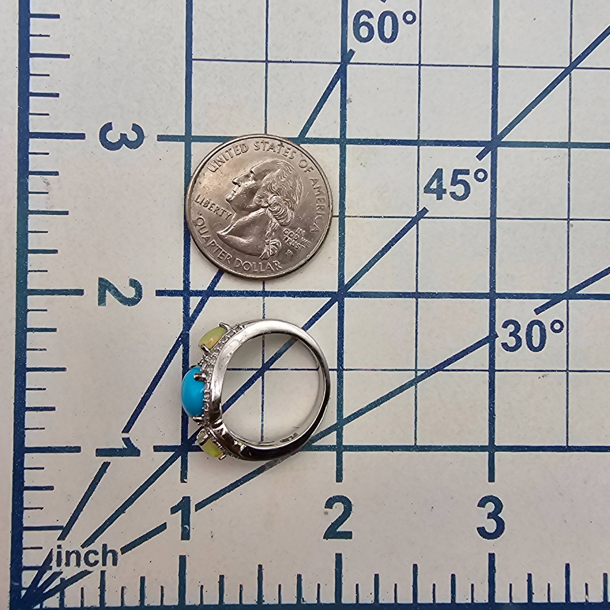 Sterling silver ring by D’Joy featuring a prominent oval turquoise stone flanked by two opals. The band is accented with intricate details, and the total weight of the ring is 4.4 grams. It is a size 6.75, suitable for small to medium-sized fingers.