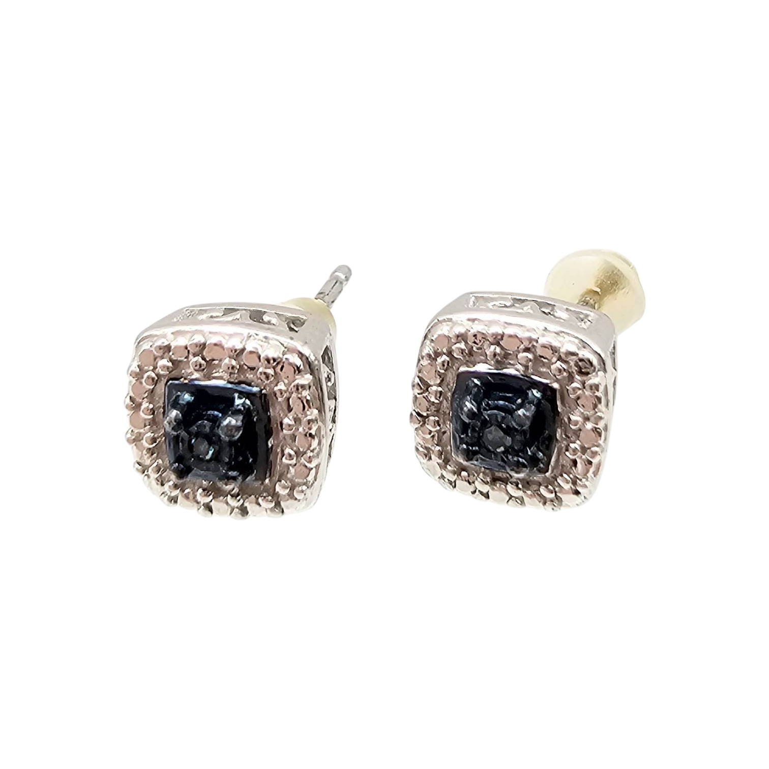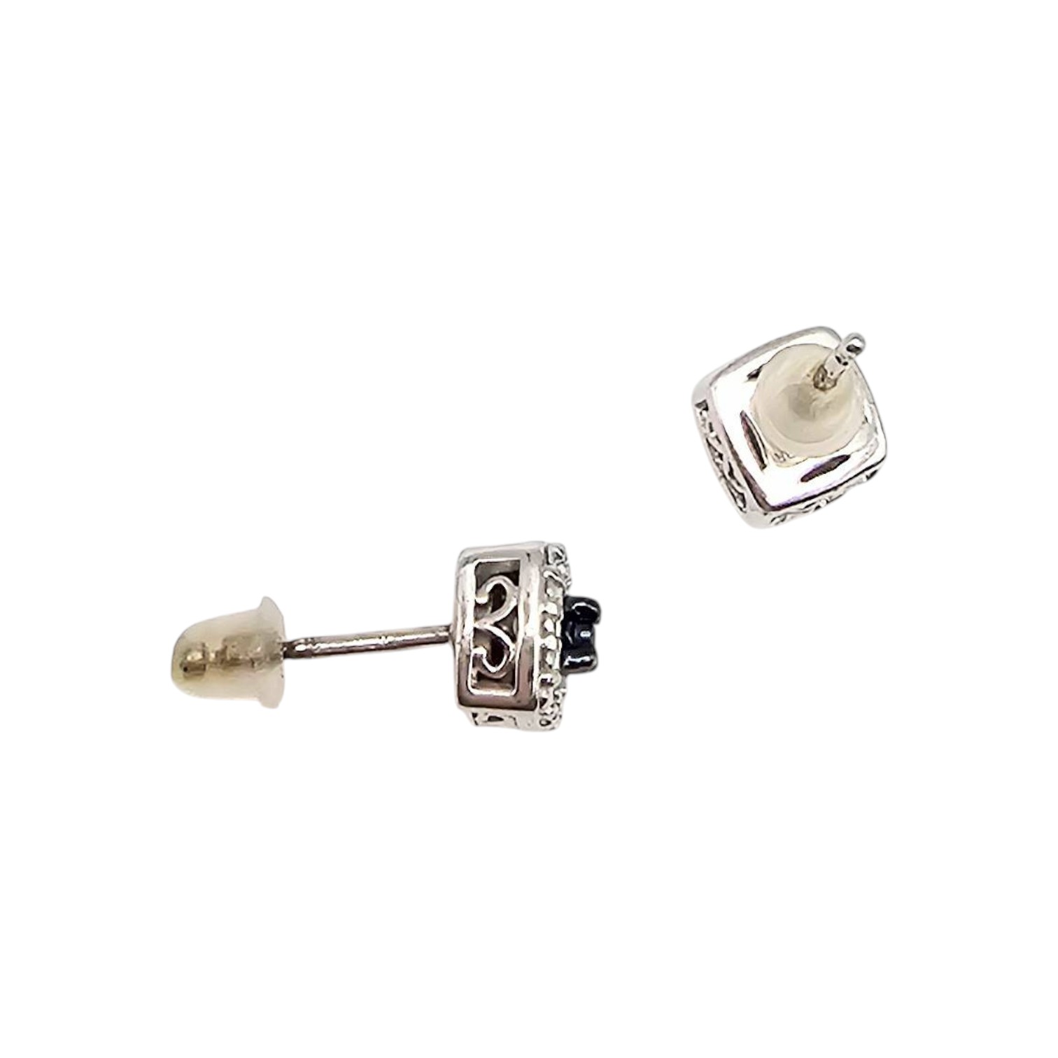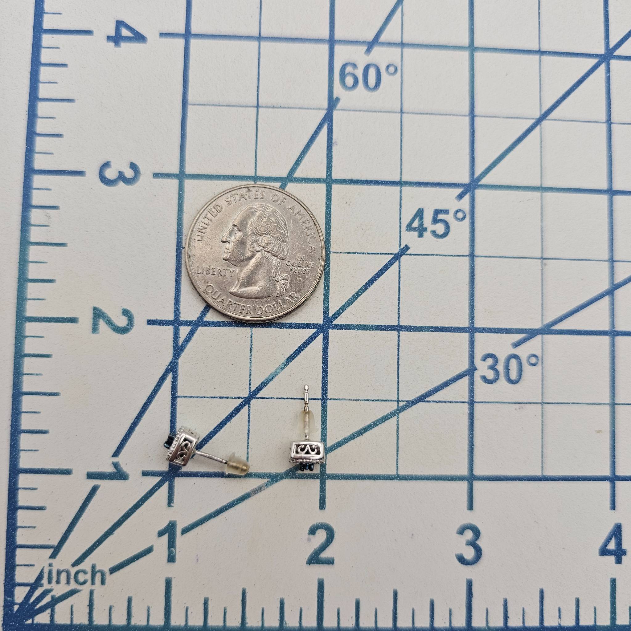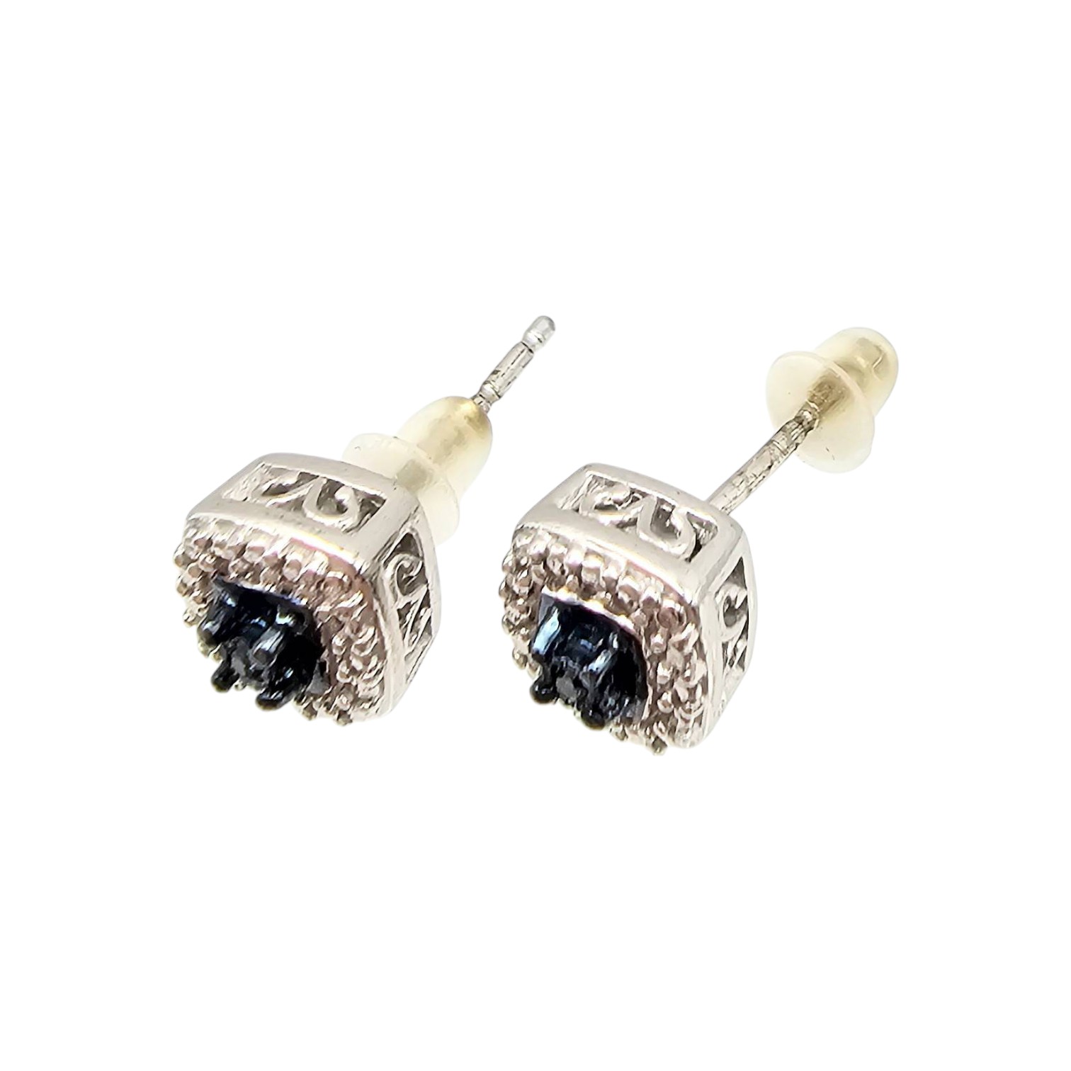 JWBR earrings featuring blue and white diamonds set in sterling silver. The earrings weigh 1.8 grams and include decorative accents. Designed with a push-back closure, they are compact in size as indicated by the comparison with a quarter for scale.
