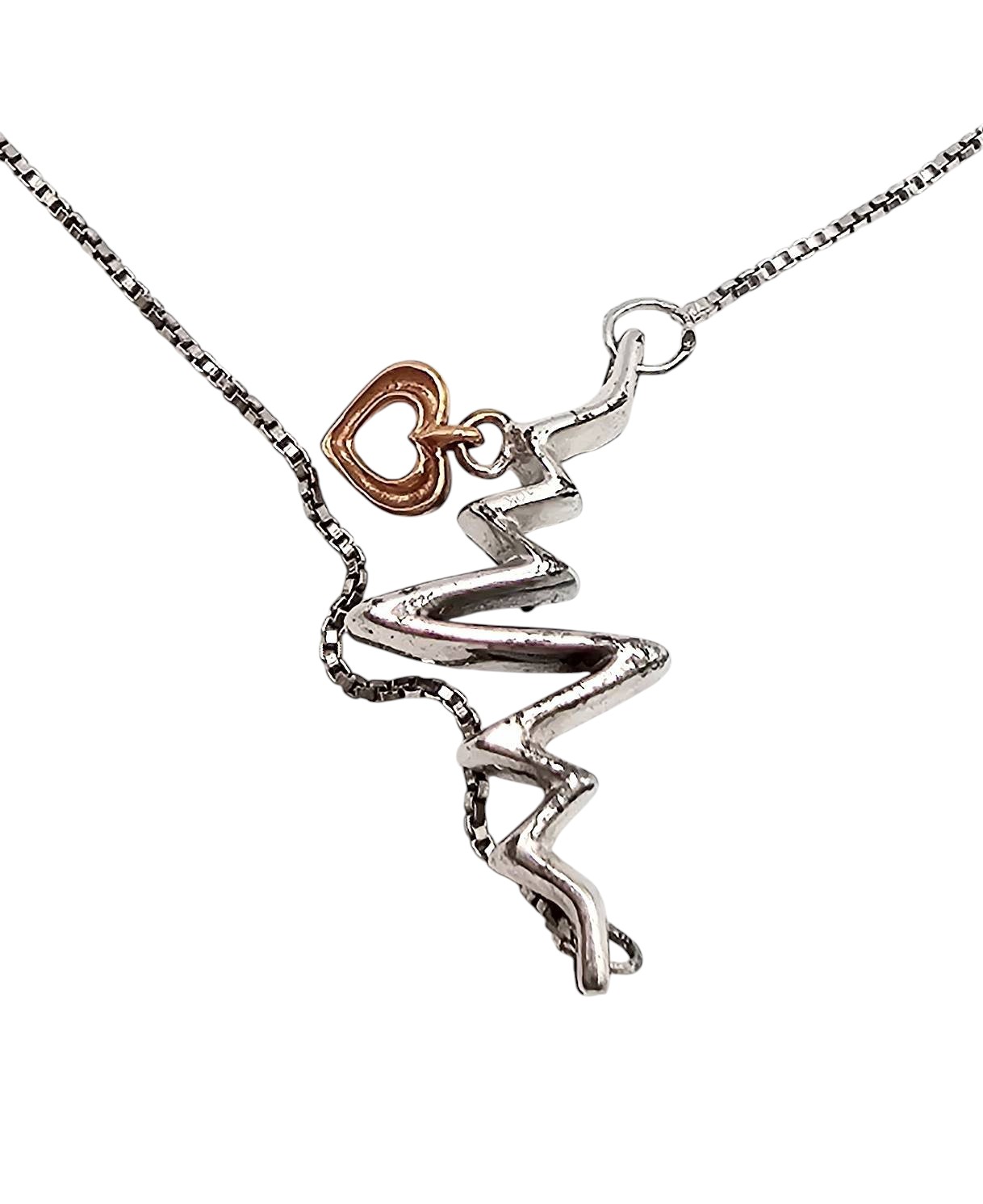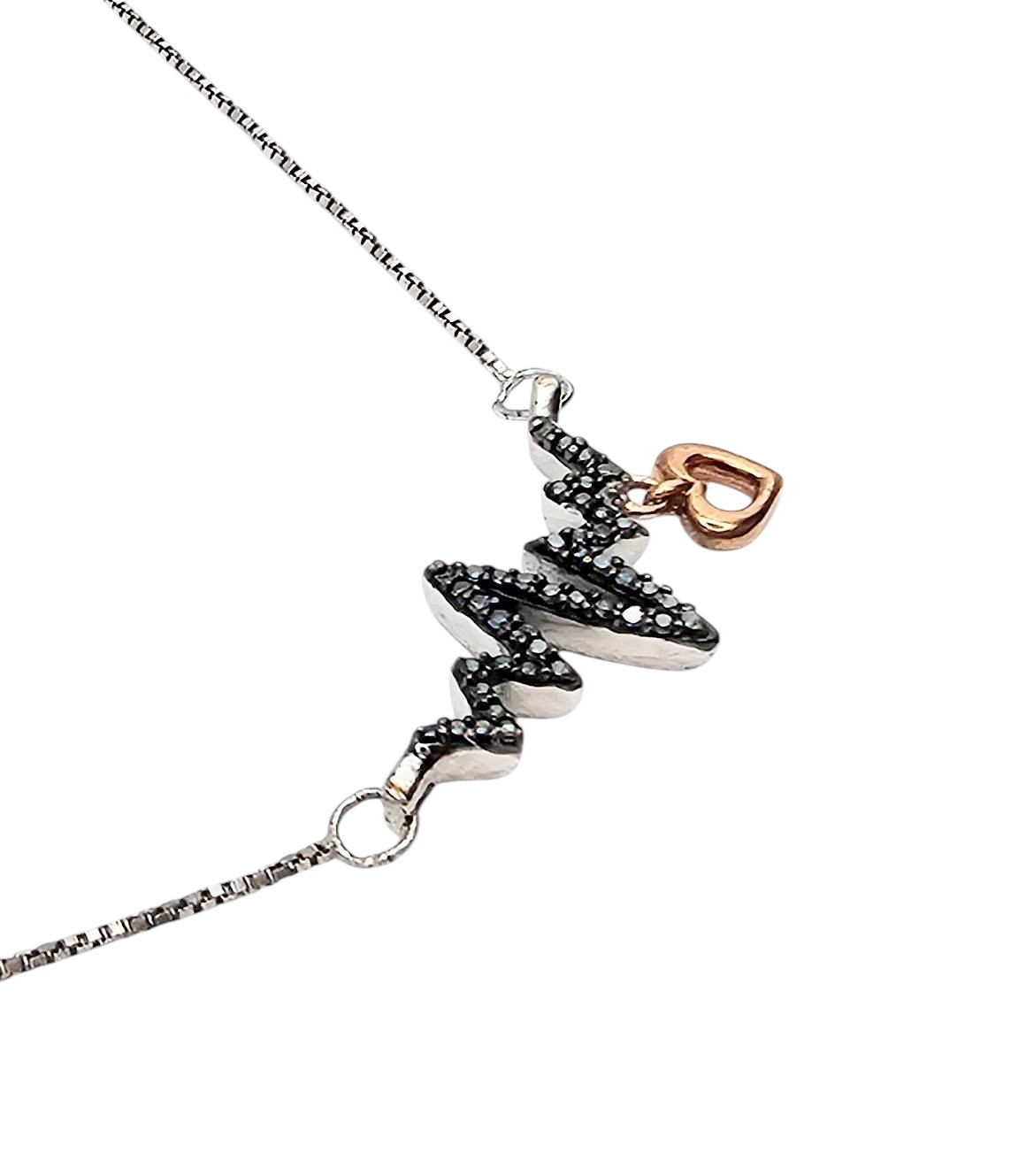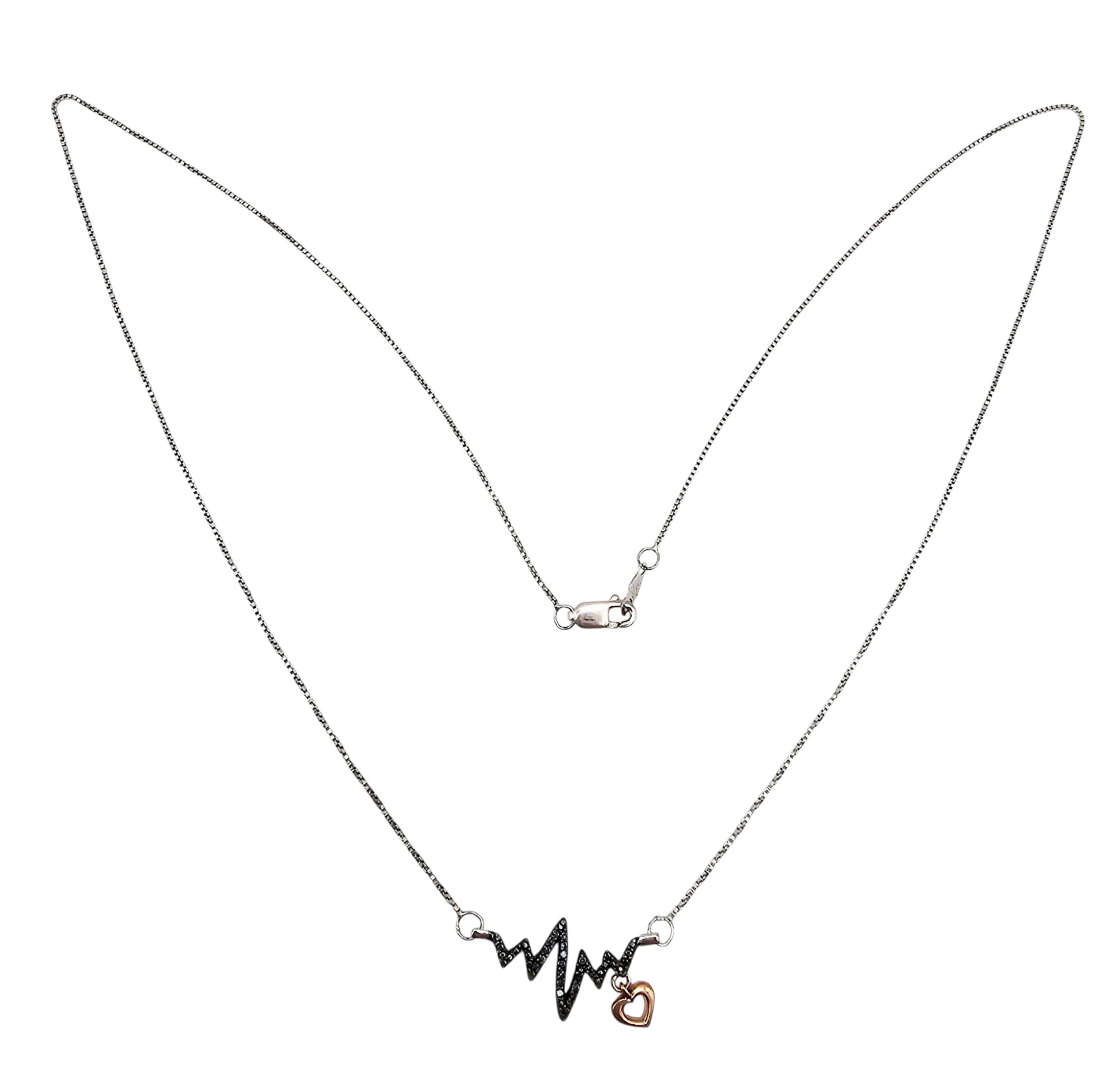 Sterling silver necklace weighing 2.7g, featuring a zigzag heartbeat-shaped pendant set with small diamonds. Includes a rose gold-tone heart accent. The piece is crafted from sterling silver and is finished with a lobster clasp. Meticulously designed for a modern and stylish appeal.