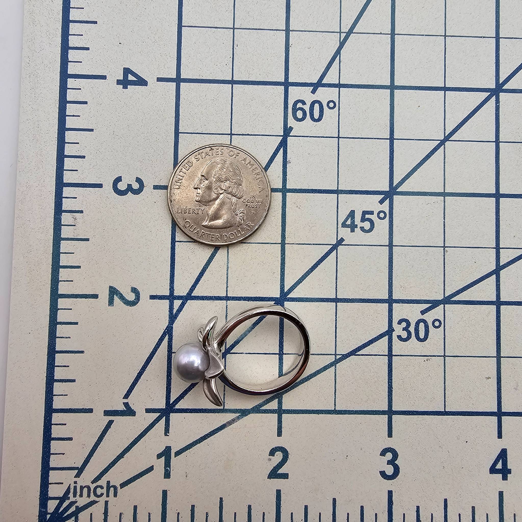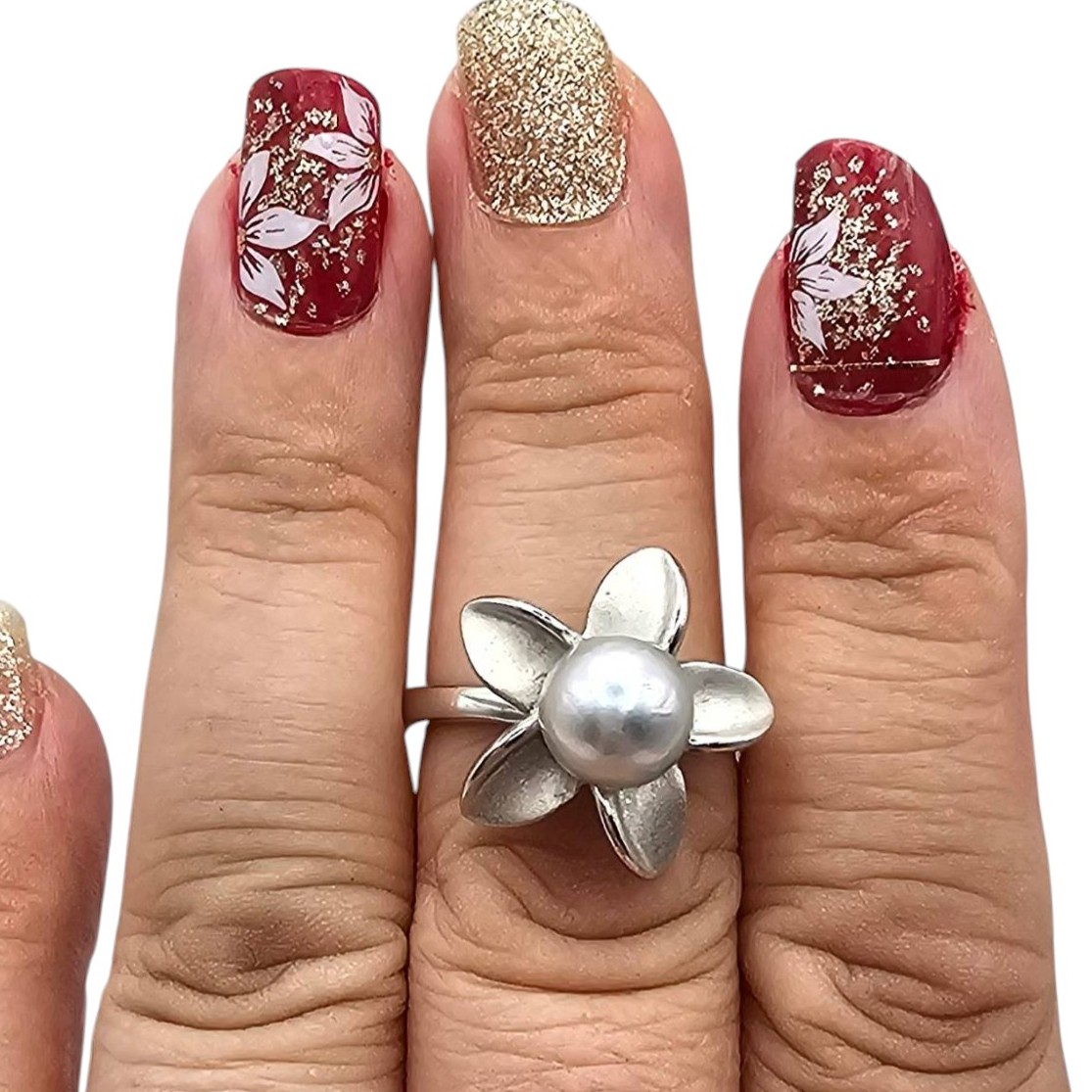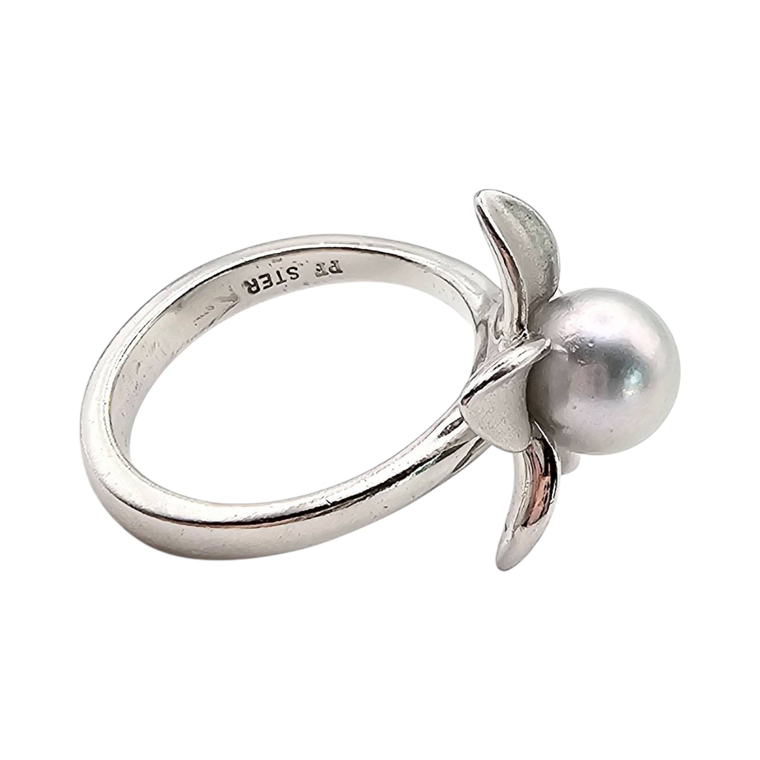 Sterling silver ring with a floral design featuring a central pearl accent. Marked ‘925’ for sterling silver purity and weighing approximately 6.6 grams. Ring size is 7.5. The ring showcases a polished finish with a detailed flower design holding a natural-looking pearl at the center.