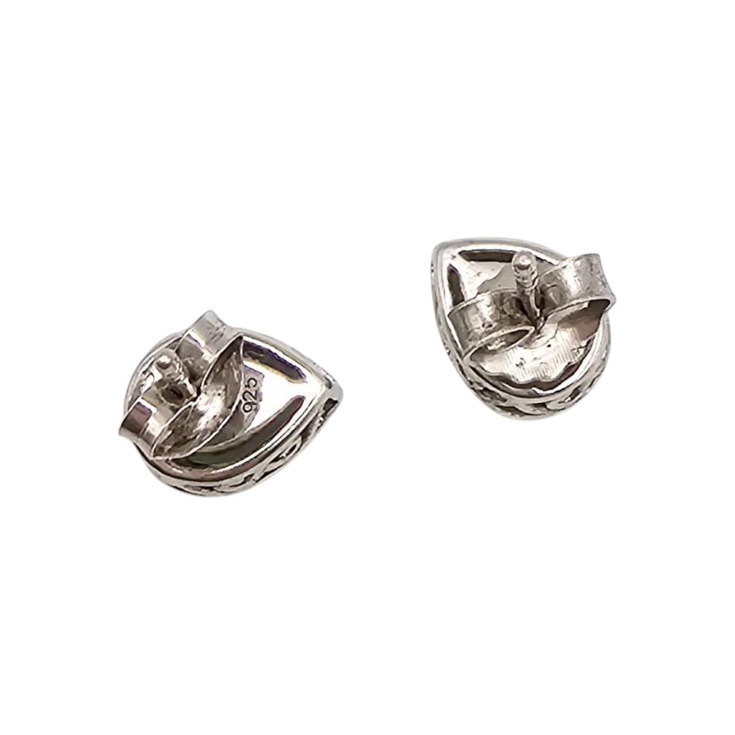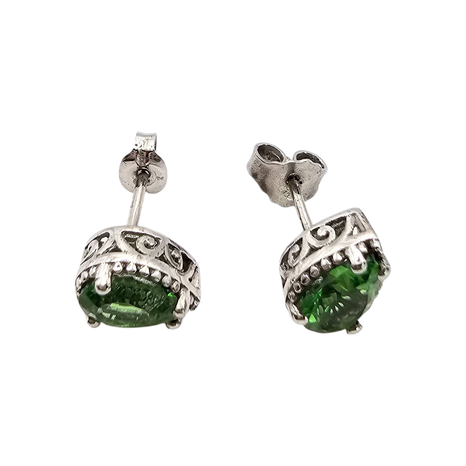 Sterling silver stud earrings set with pear-shaped green cubic zirconia stones. Stamped with ‘925’ to indicate sterling silver. Each earring is accented with ornate scrollwork details around the setting. Weight is approximately 1.7 grams. Suitable for pierced ears.