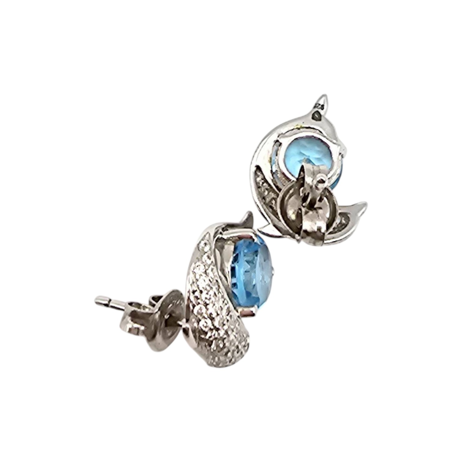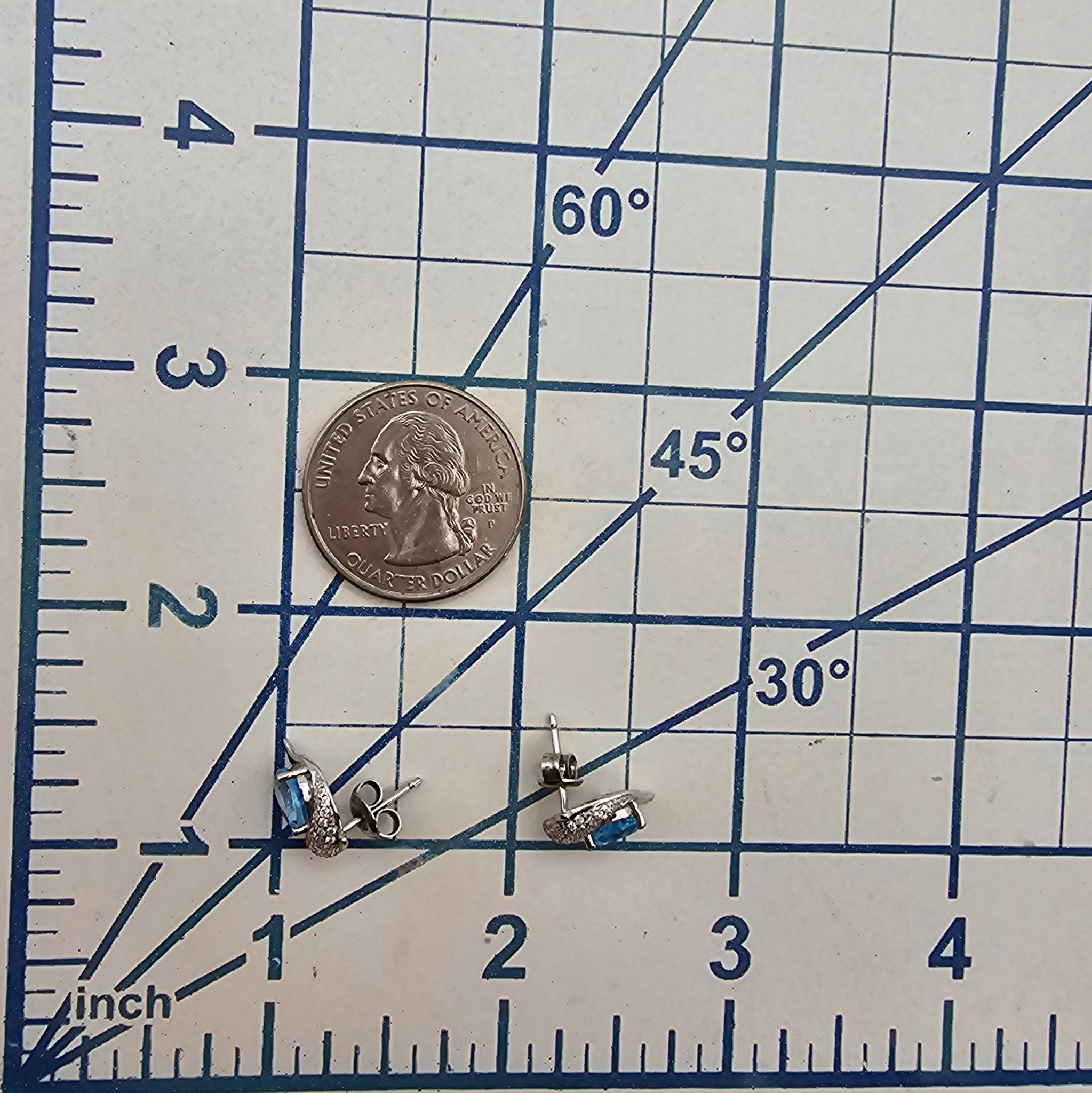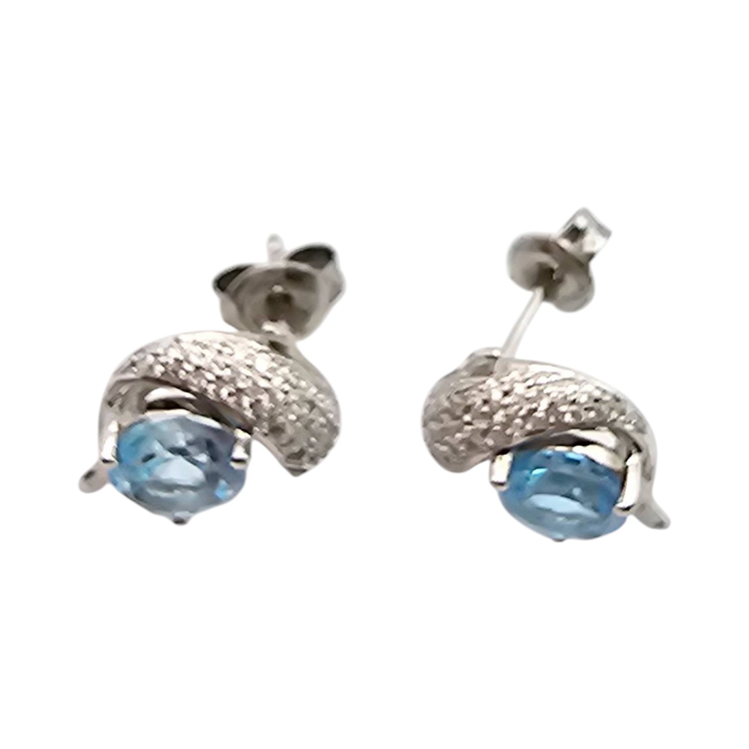 Dolphin-shaped earrings crafted in sterling silver, featuring blue topaz gemstones as focal points. The earrings weigh 2.2 grams and feature textured details on the dolphin’s body. Post-back closures included. Suitable for pierced ears.