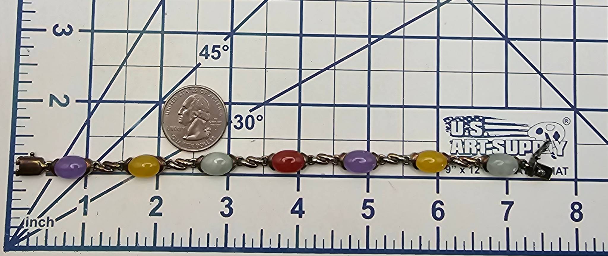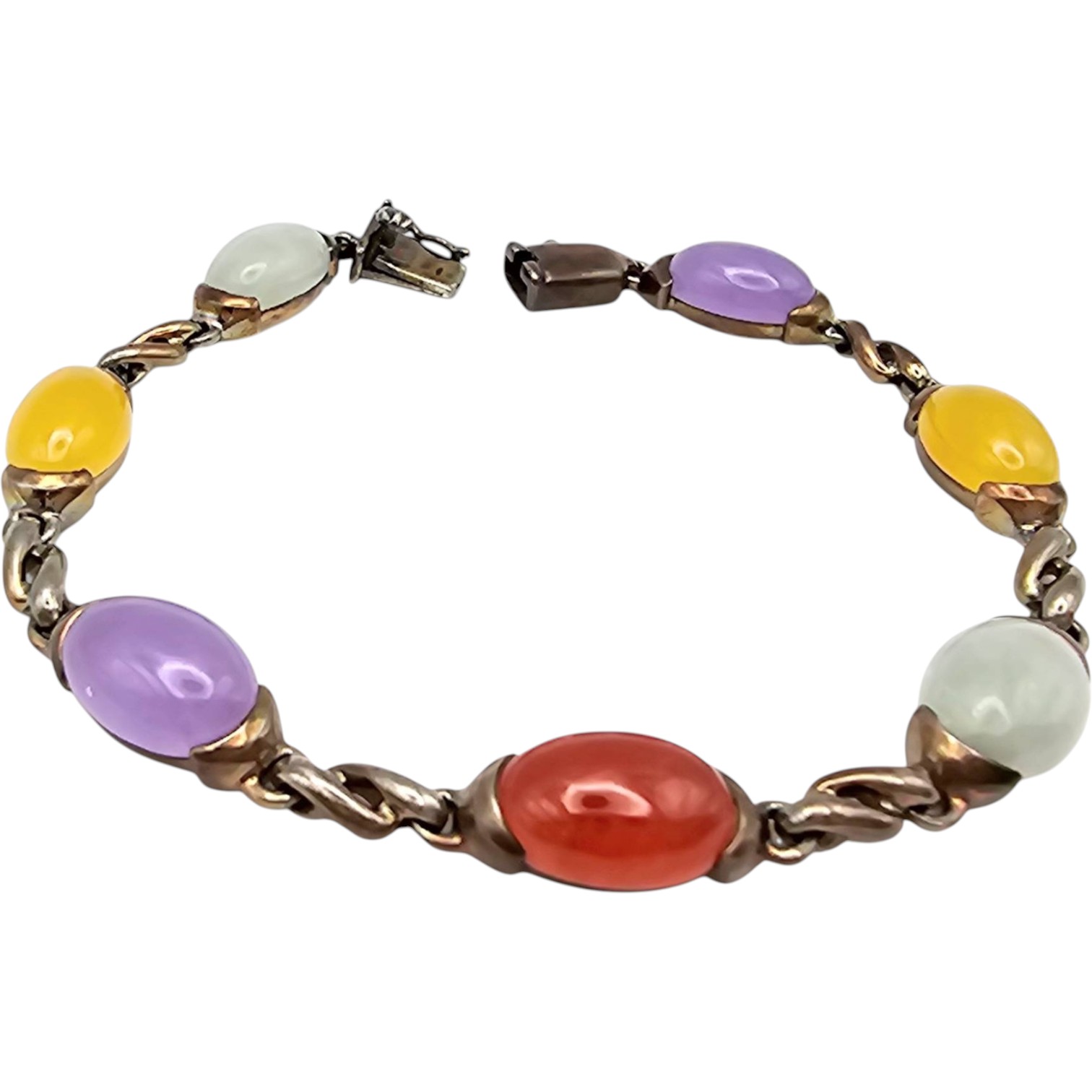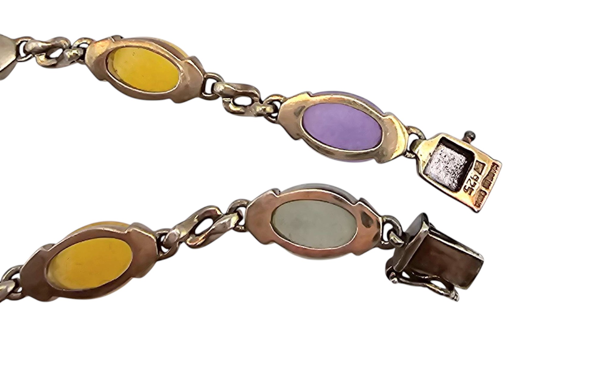Sterling silver bracelet featuring oval-shaped multicolor jade stones, including yellow, purple, green, and red. Total length shown on Ruler. The clasp is a secure box clasp with hallmark markings. Overall condition appears to be well-preserved with no visible damage to the stones or metal.
