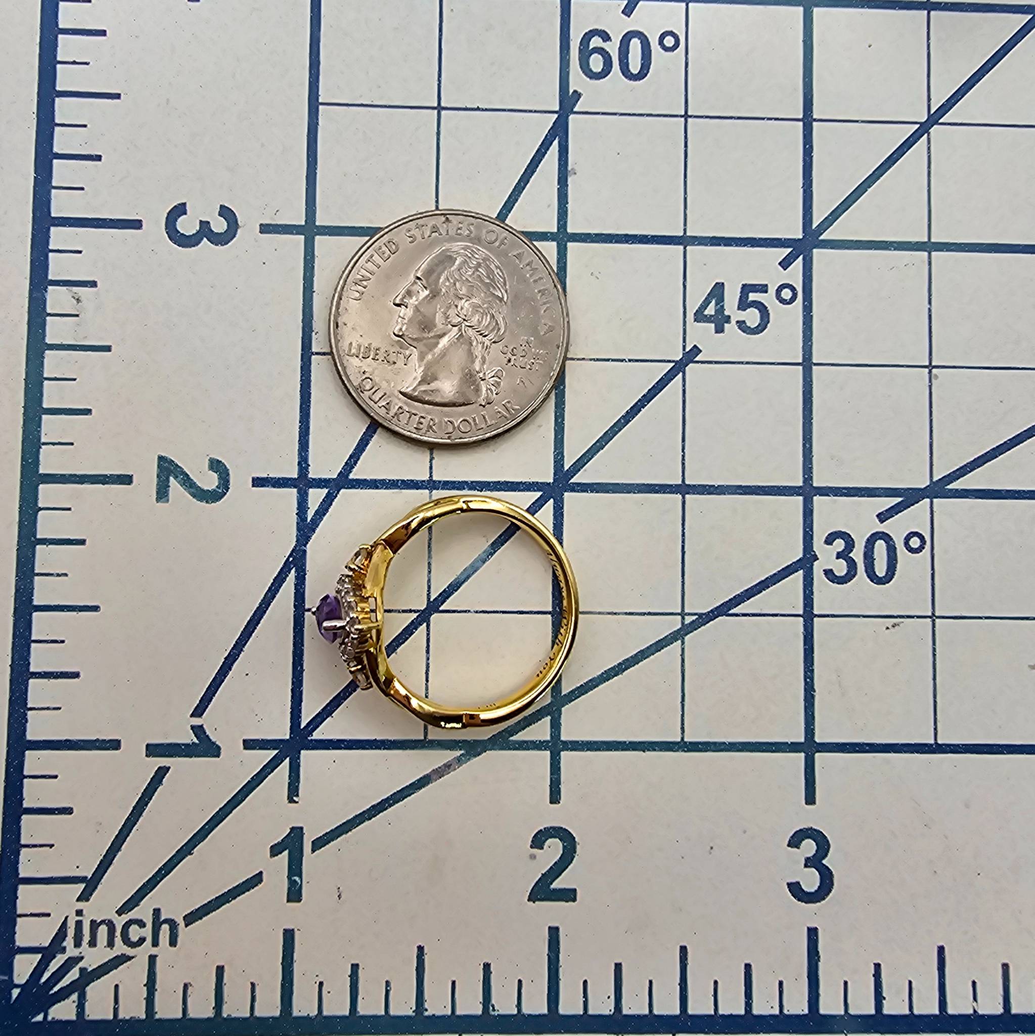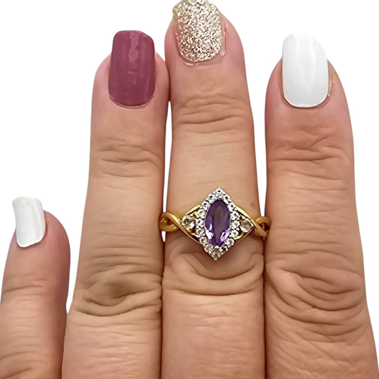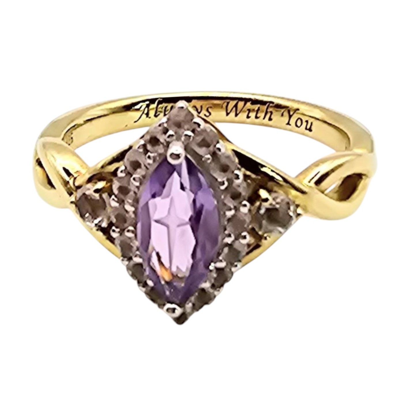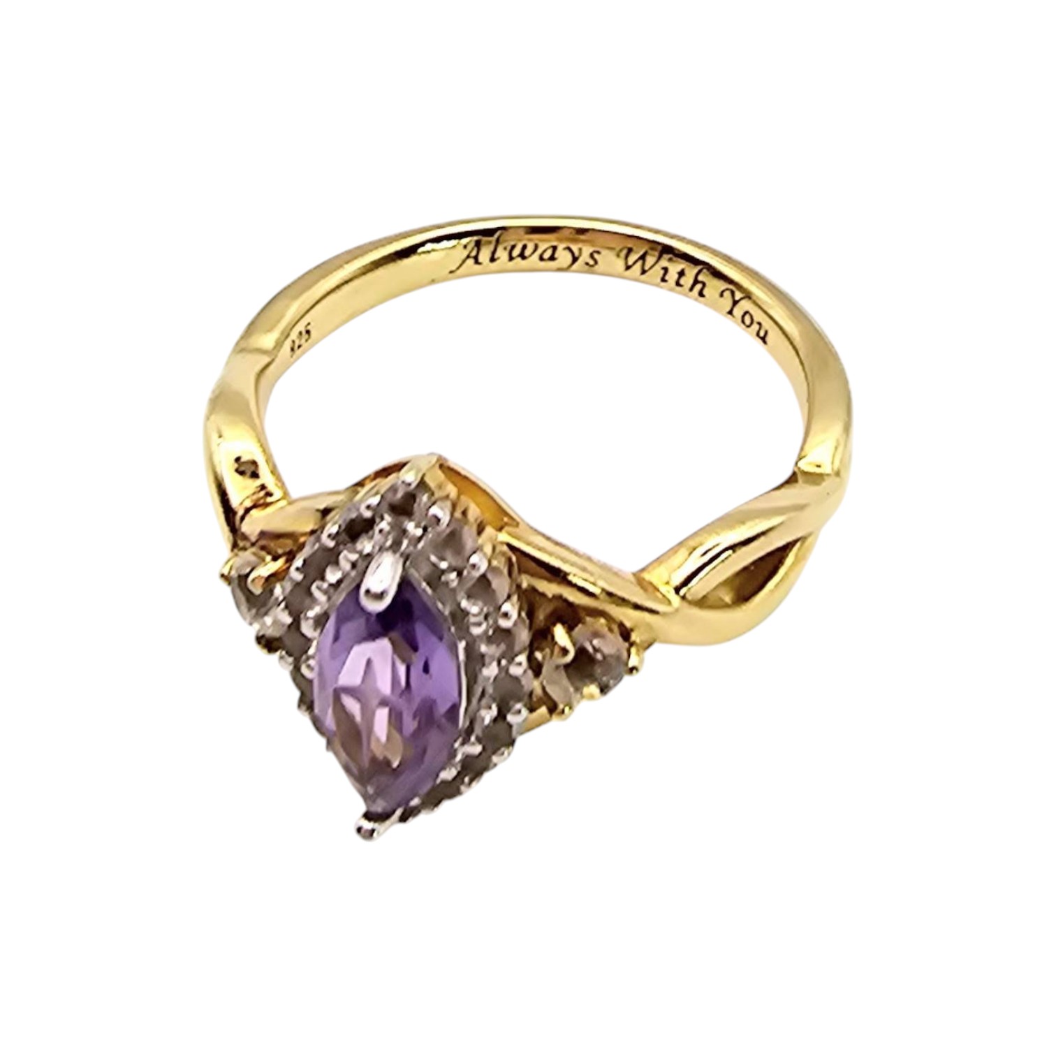 Gold Over sterling silver ring featuring a marquise-cut amethyst at the center surrounded by decorative accents. The ring is inscribed with ‘Always With You’ on the band. Weighing 3.9 grams, it is size 8. A classic and timeless jewelry piece.