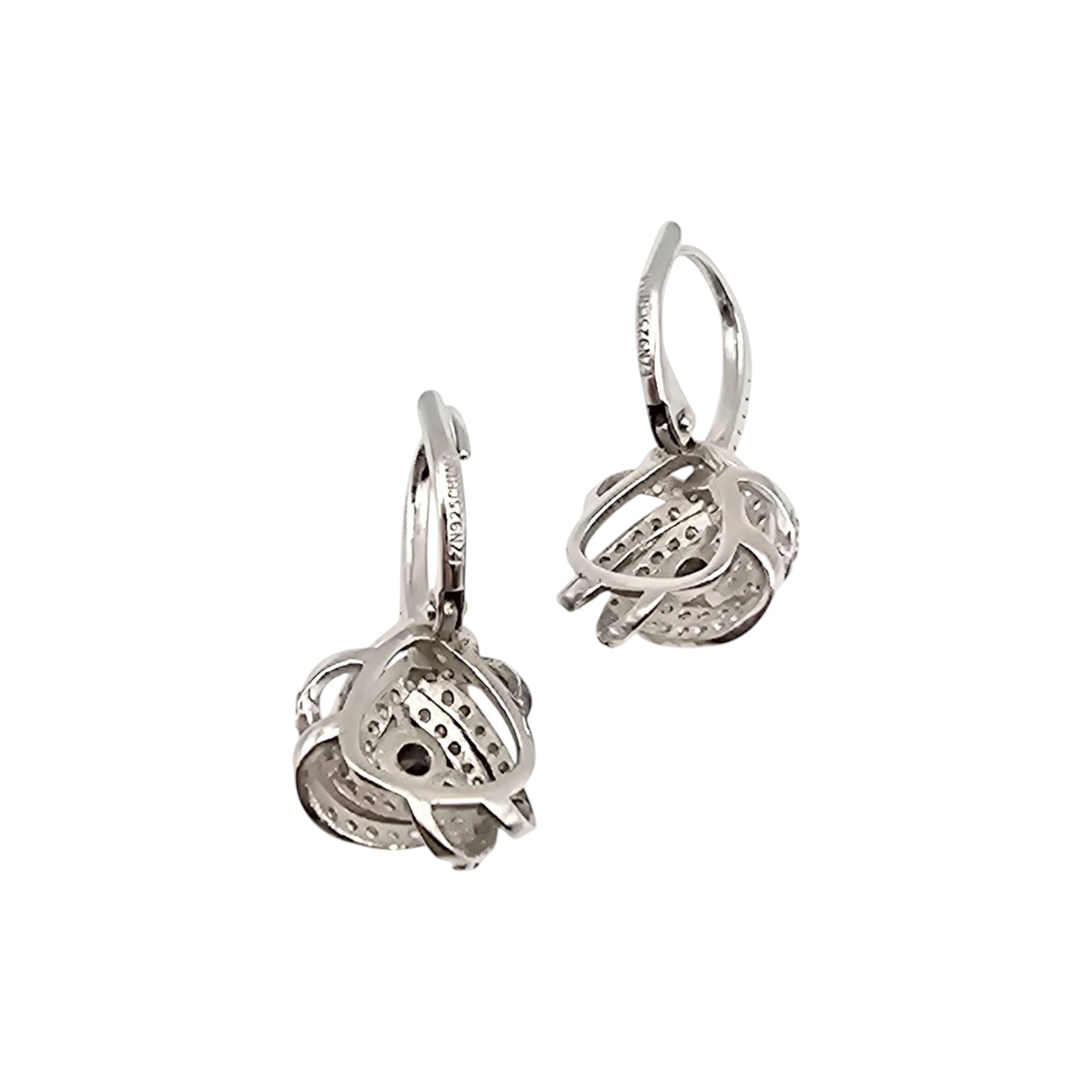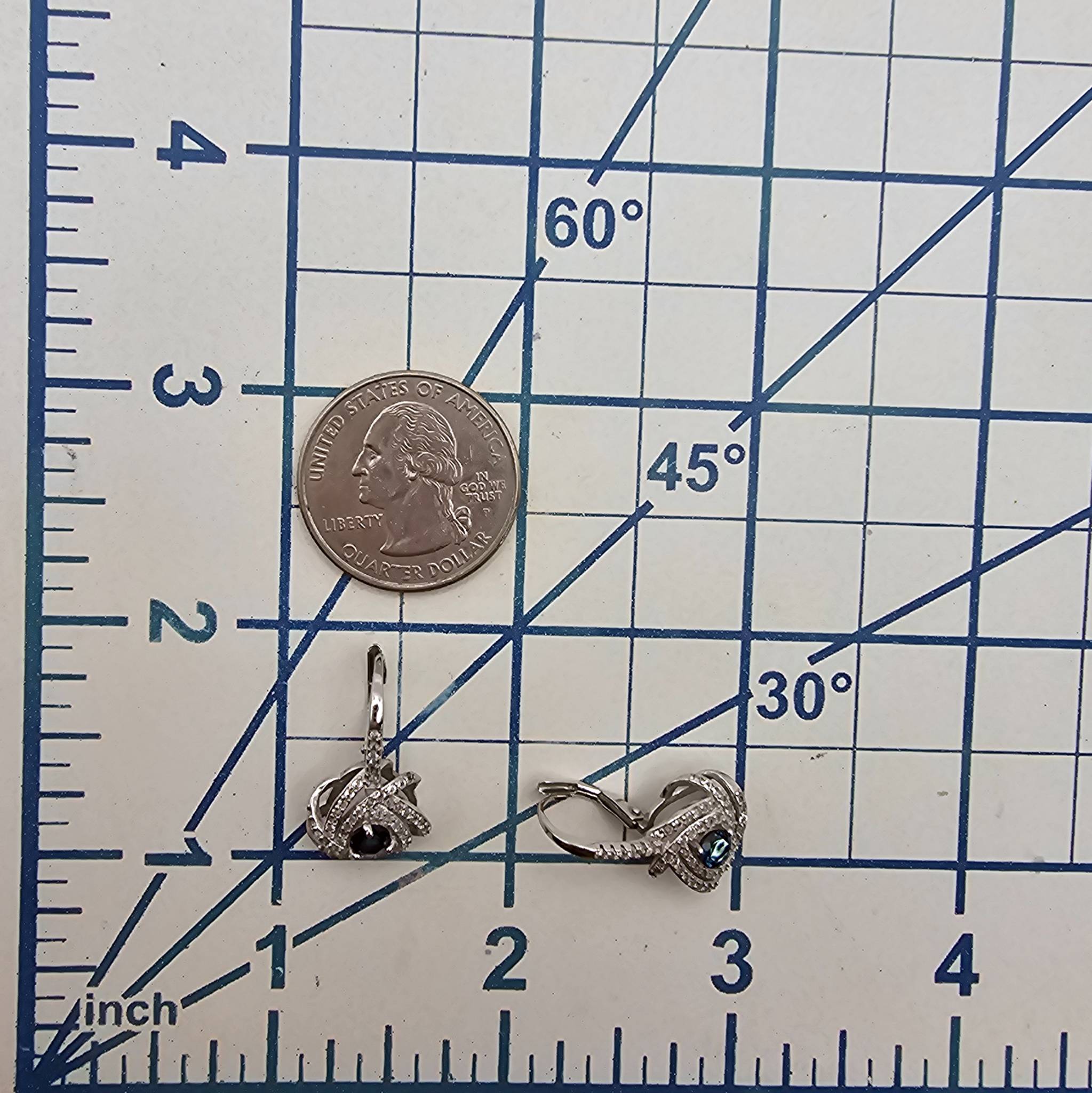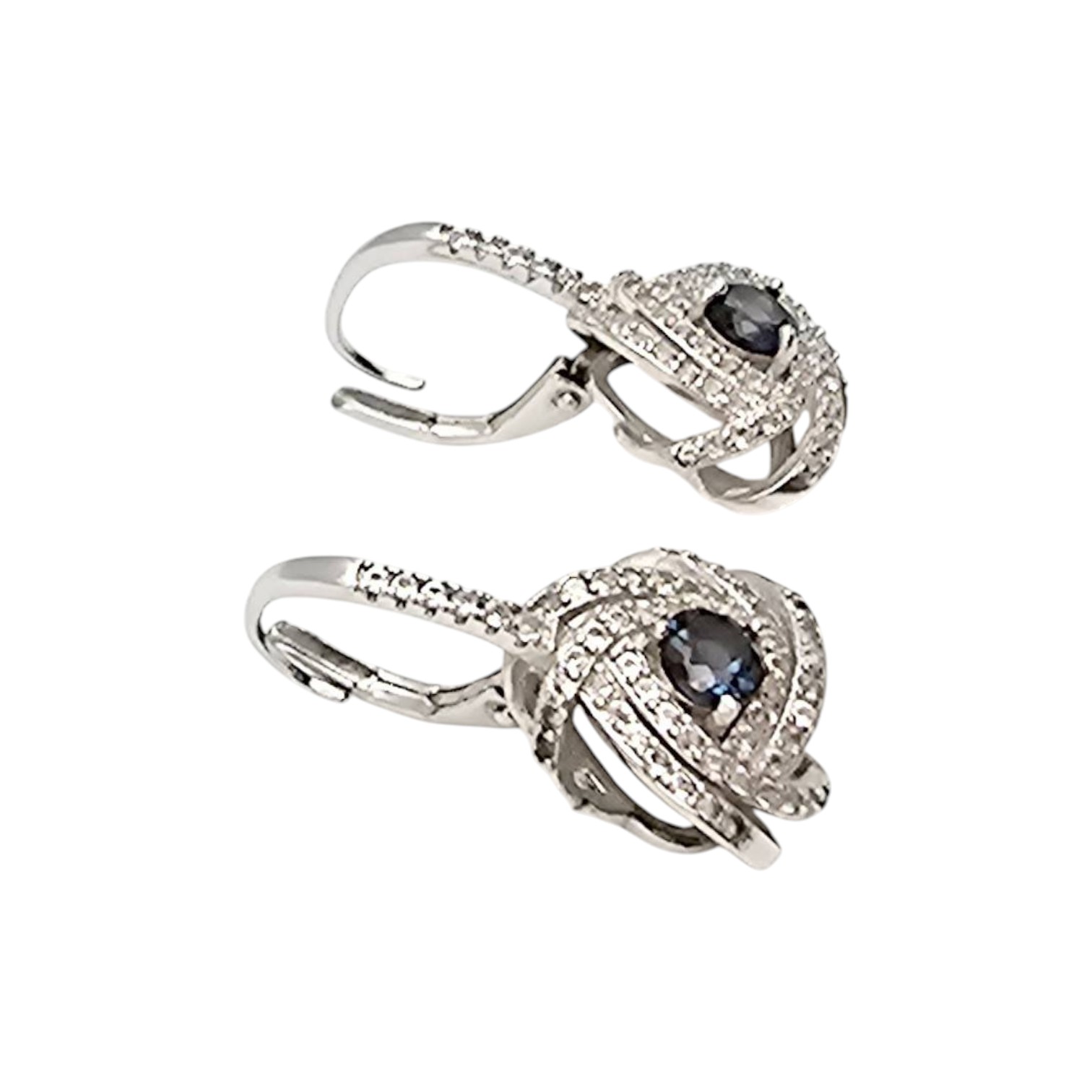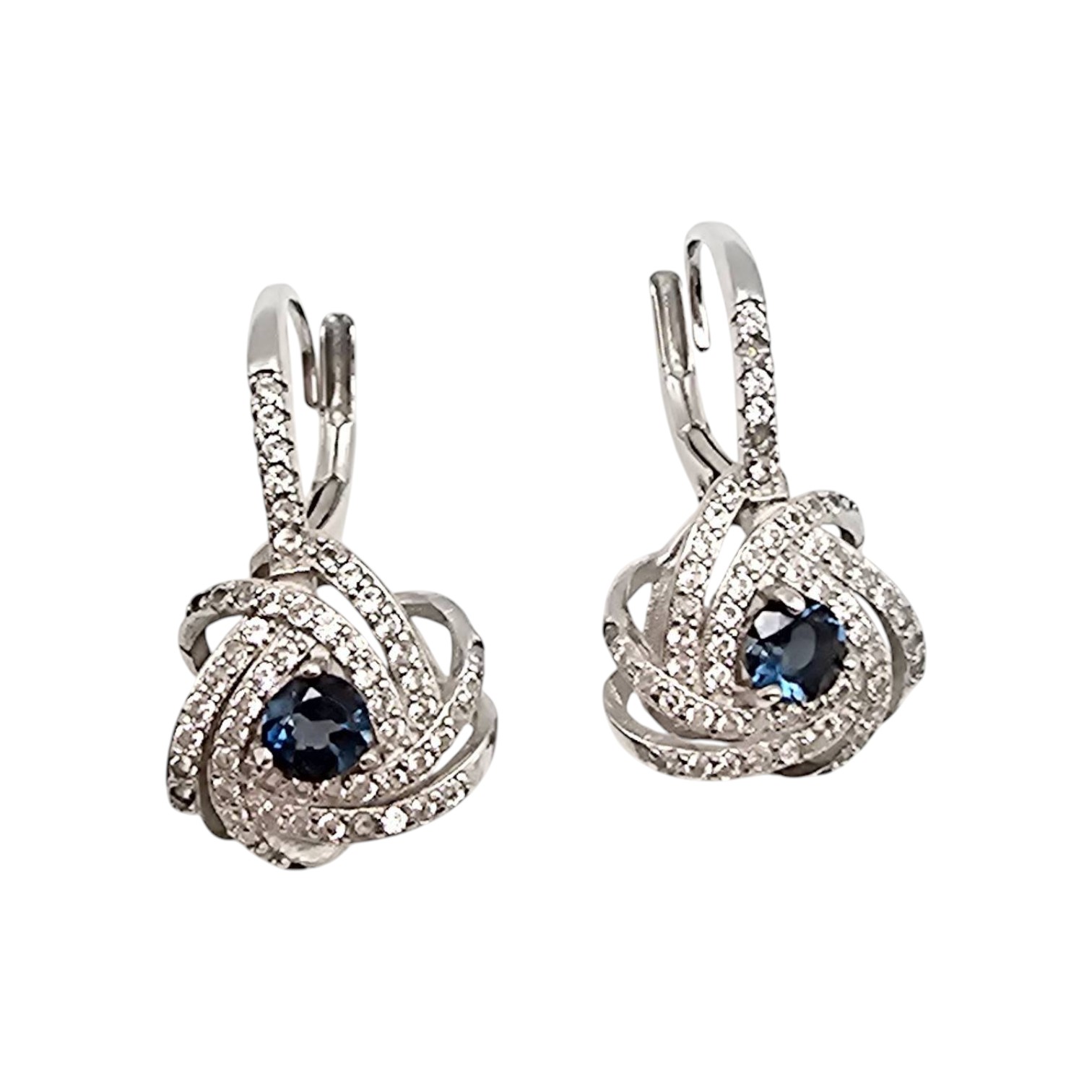FZN earrings crafted from sterling silver. Features intricate looped settings and are adorned with blue tourmaline stones, weighing a total of 3.4 grams. Earrings have a lever-back closure for secure and comfortable wear. Elegant piece suitable for various occasions.