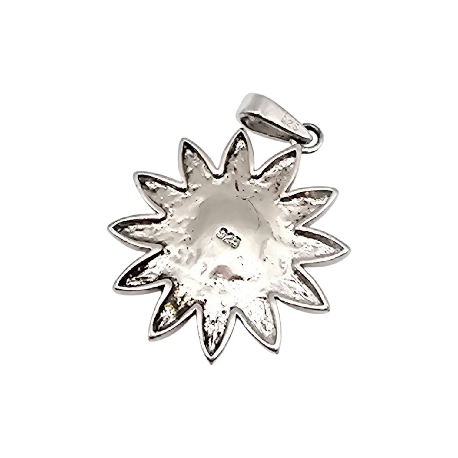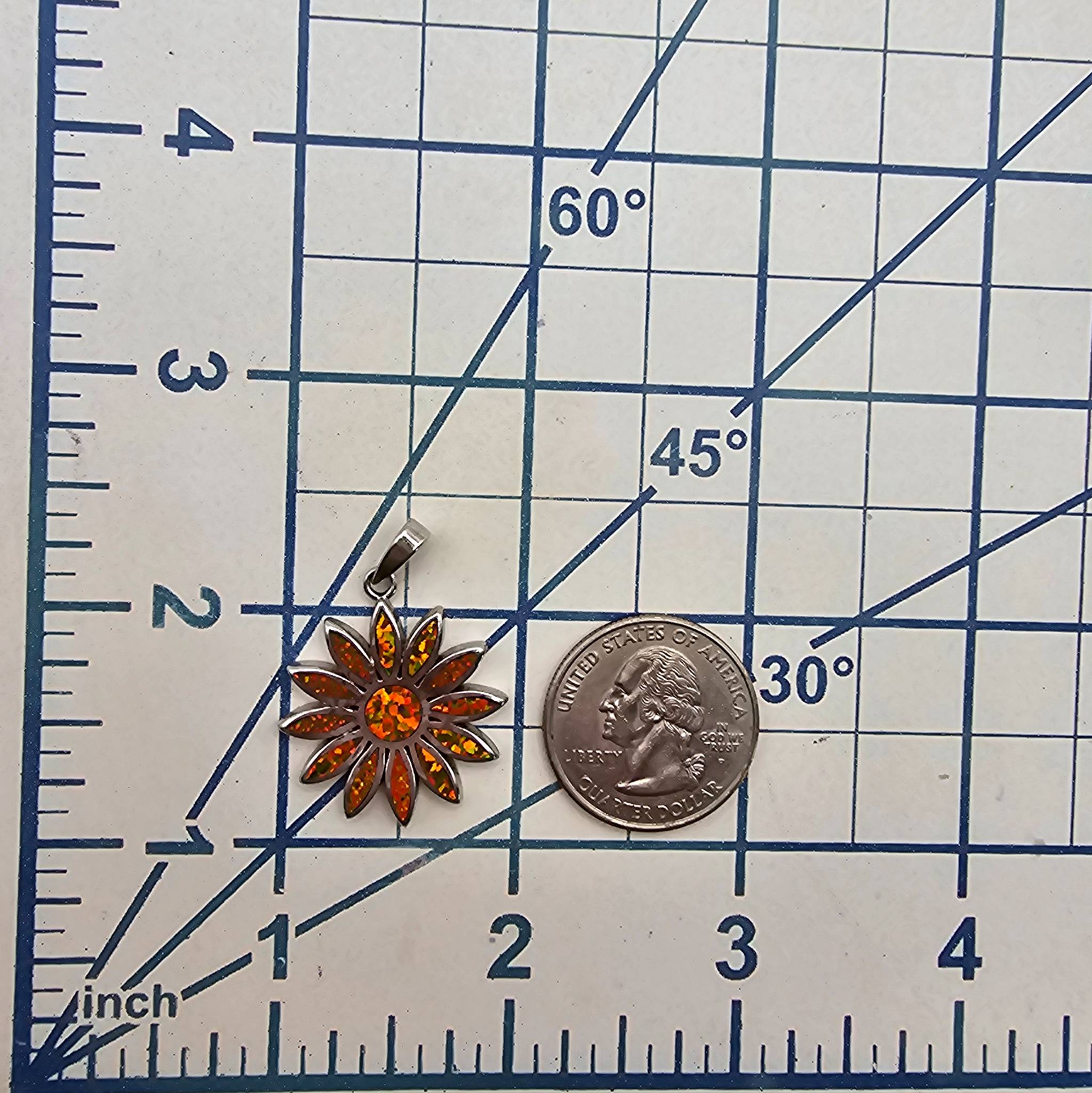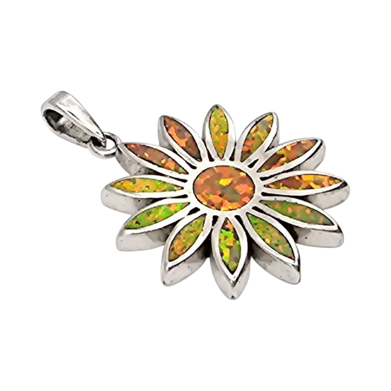 Flower-shaped pendant featuring opal inlays set in sterling silver. Weighing approximately 5.1 grams, the piece showcases vibrant colors and includes a stamped back indicating its sterling silver composition. Dimensions and design suggest it as an ideal accessory or collectible.