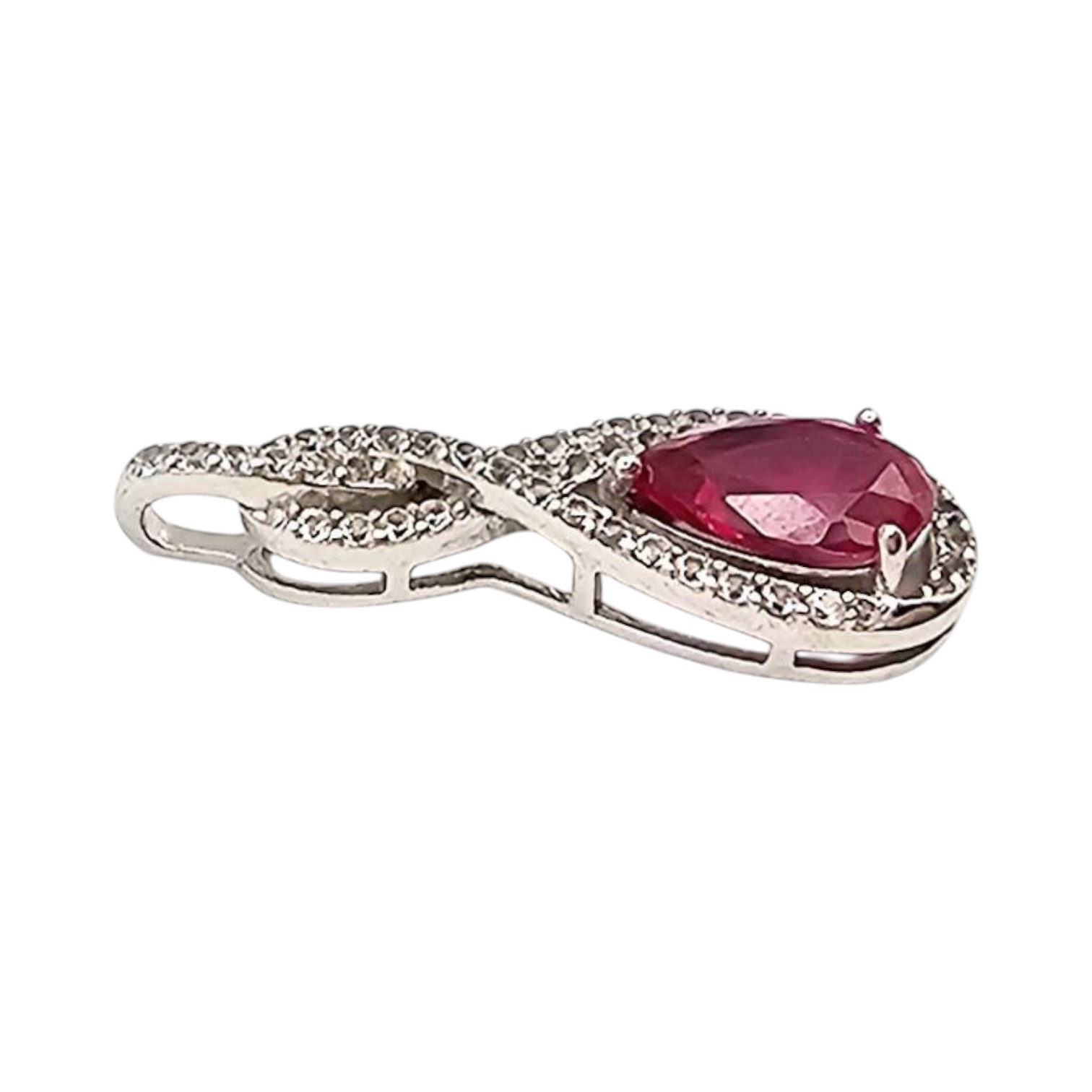 A ruby and white topaz pendant crafted from sterling silver. The design features a pear-shaped ruby set within a swirl of white topaz. The pendant weighs 2.6 grams, as noted. Dimensions are shown against a reference grid in the images. Suitable as a delicate accessory or focal jewelry piece.
