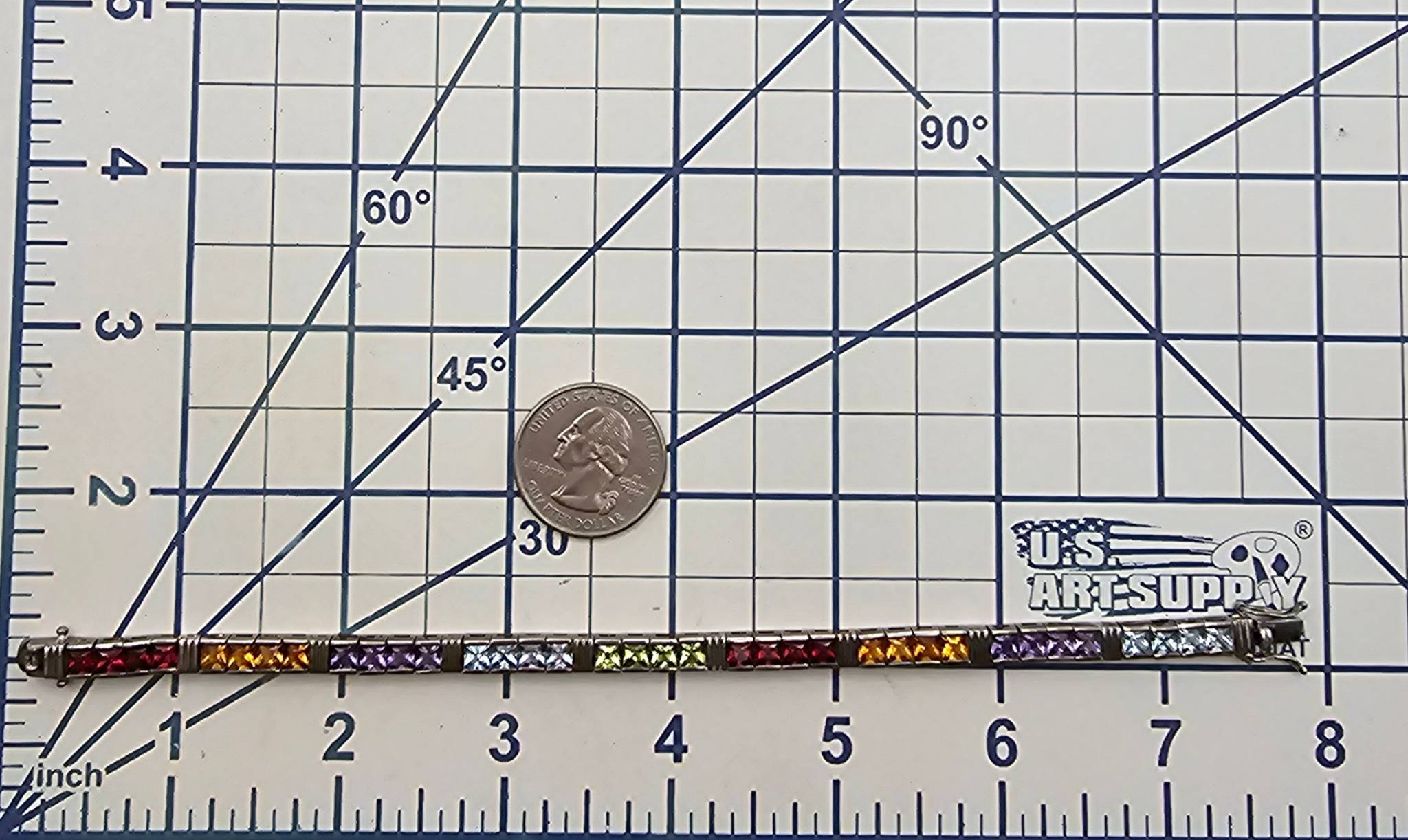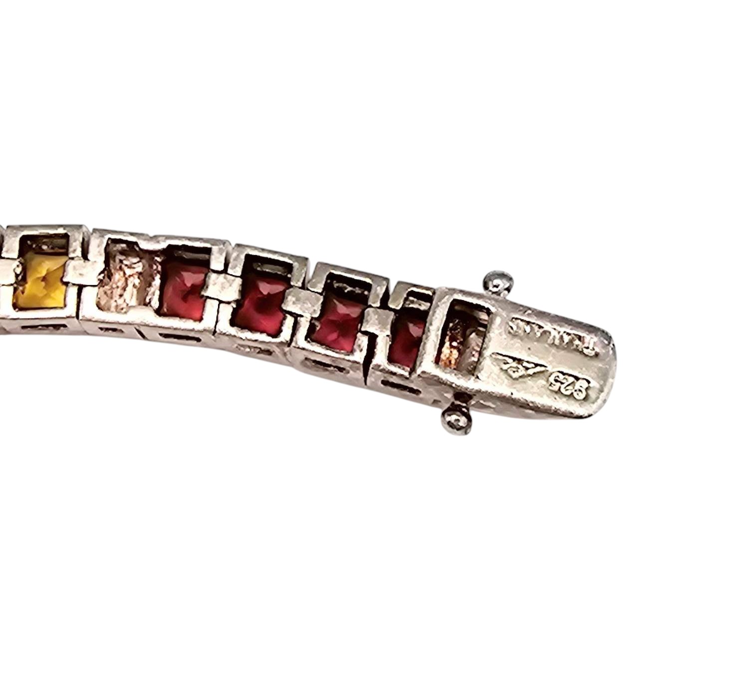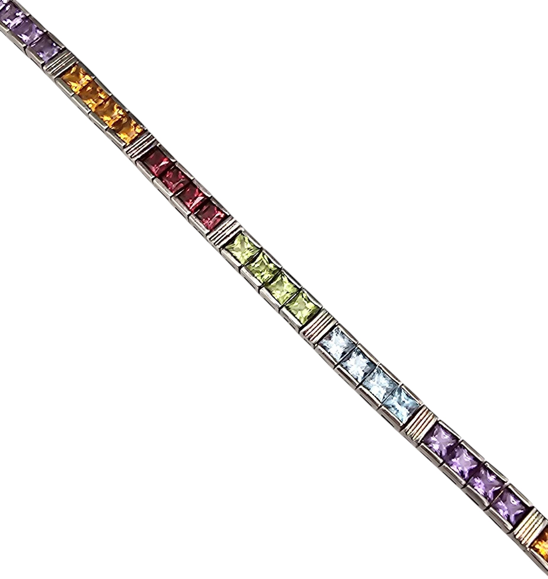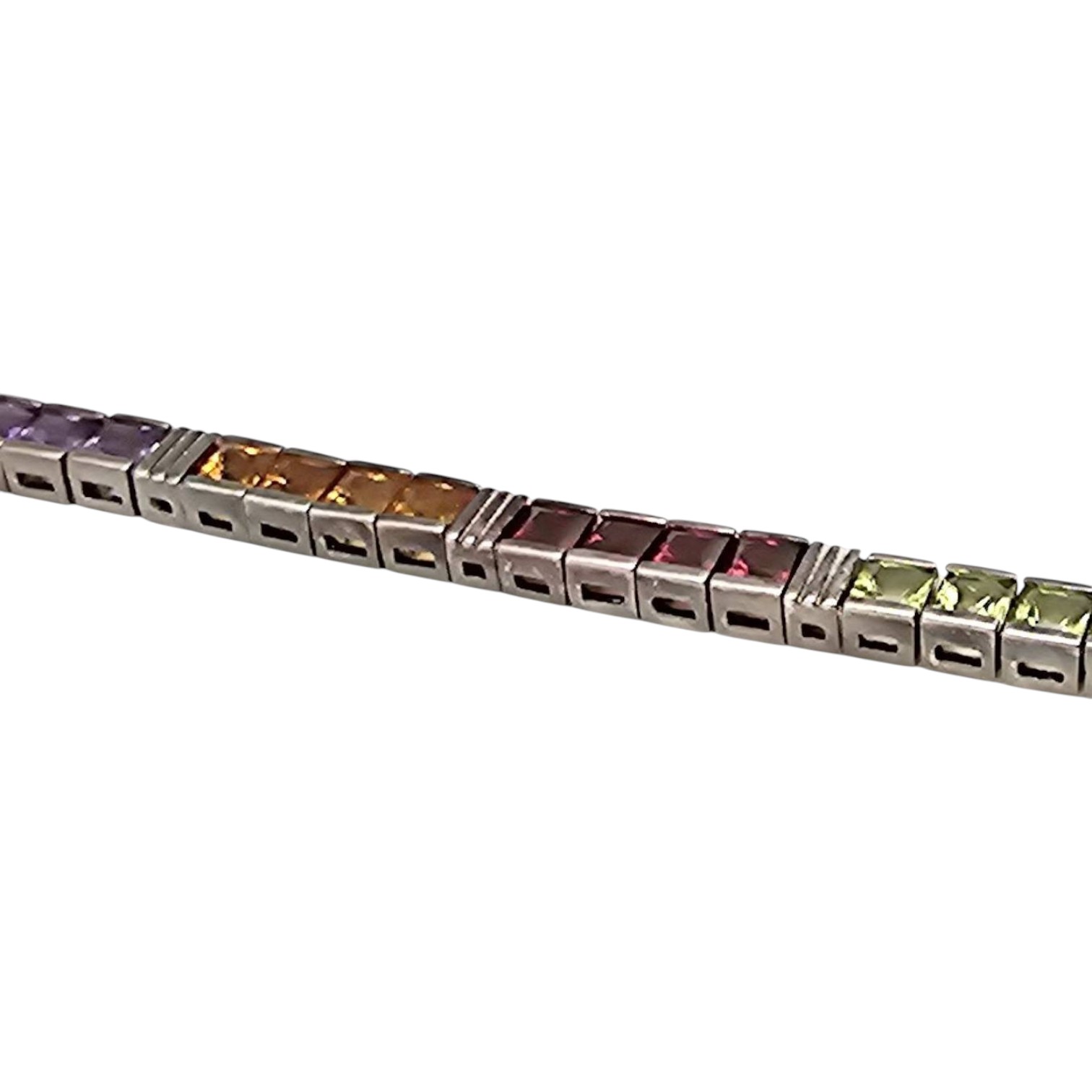 Sterling silver multi-gemstone tennis bracelet featuring square-cut gemstones in various colors. Measures approximately 7-8 inches long, with a box clasp closure. Total weight is 19.4 grams. Elegant and colorful, showcasing amethyst, citrine, garnet, peridot, and blue topaz stones.