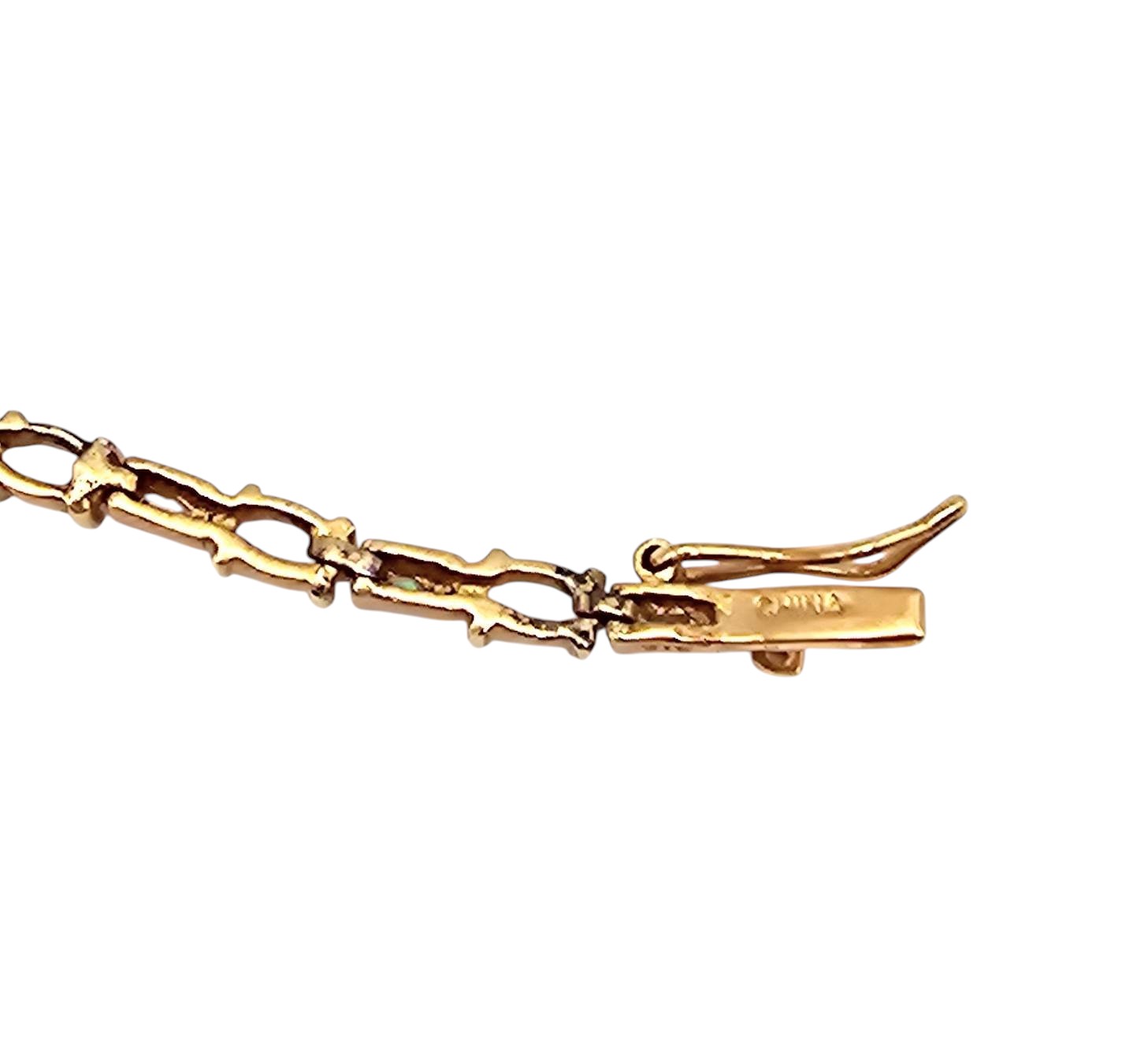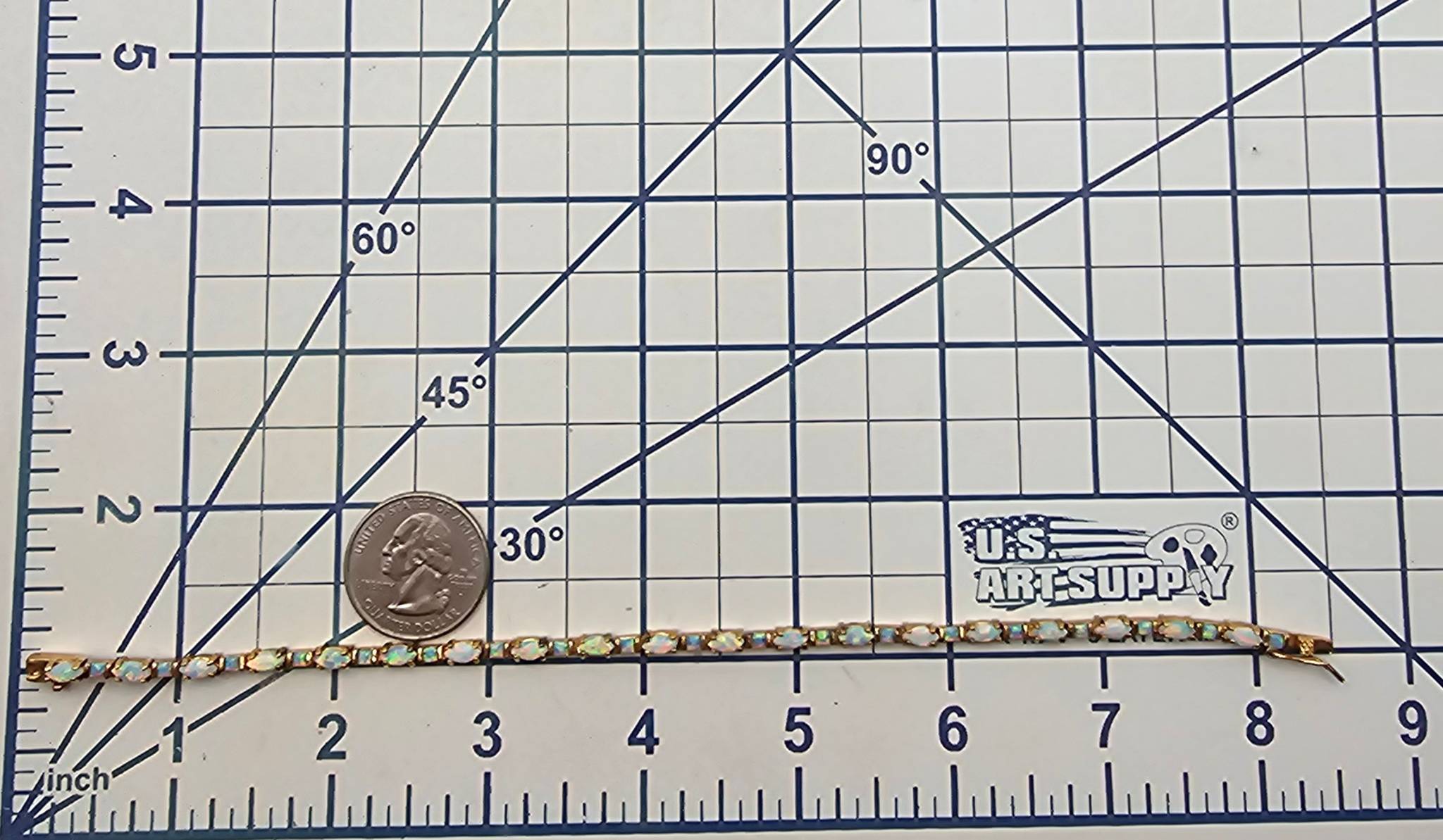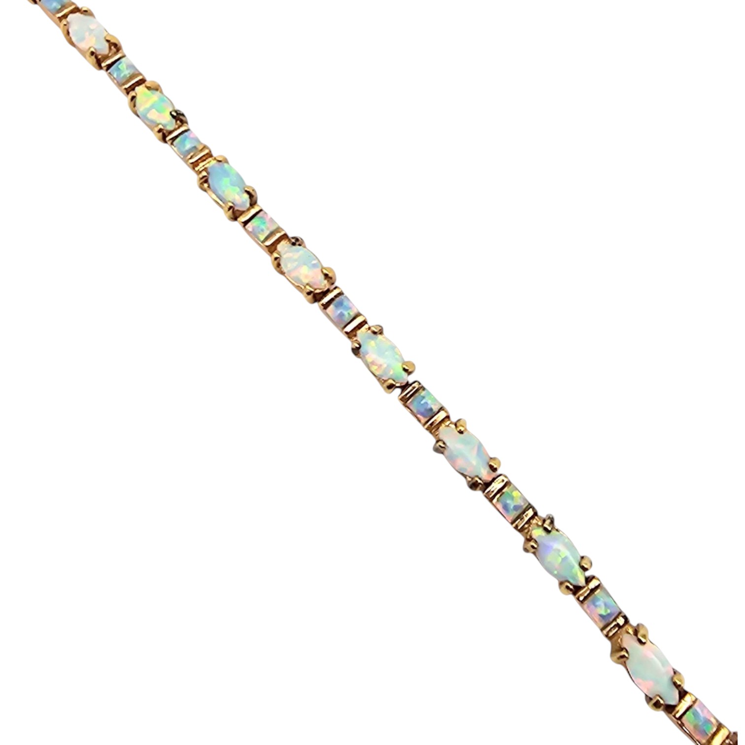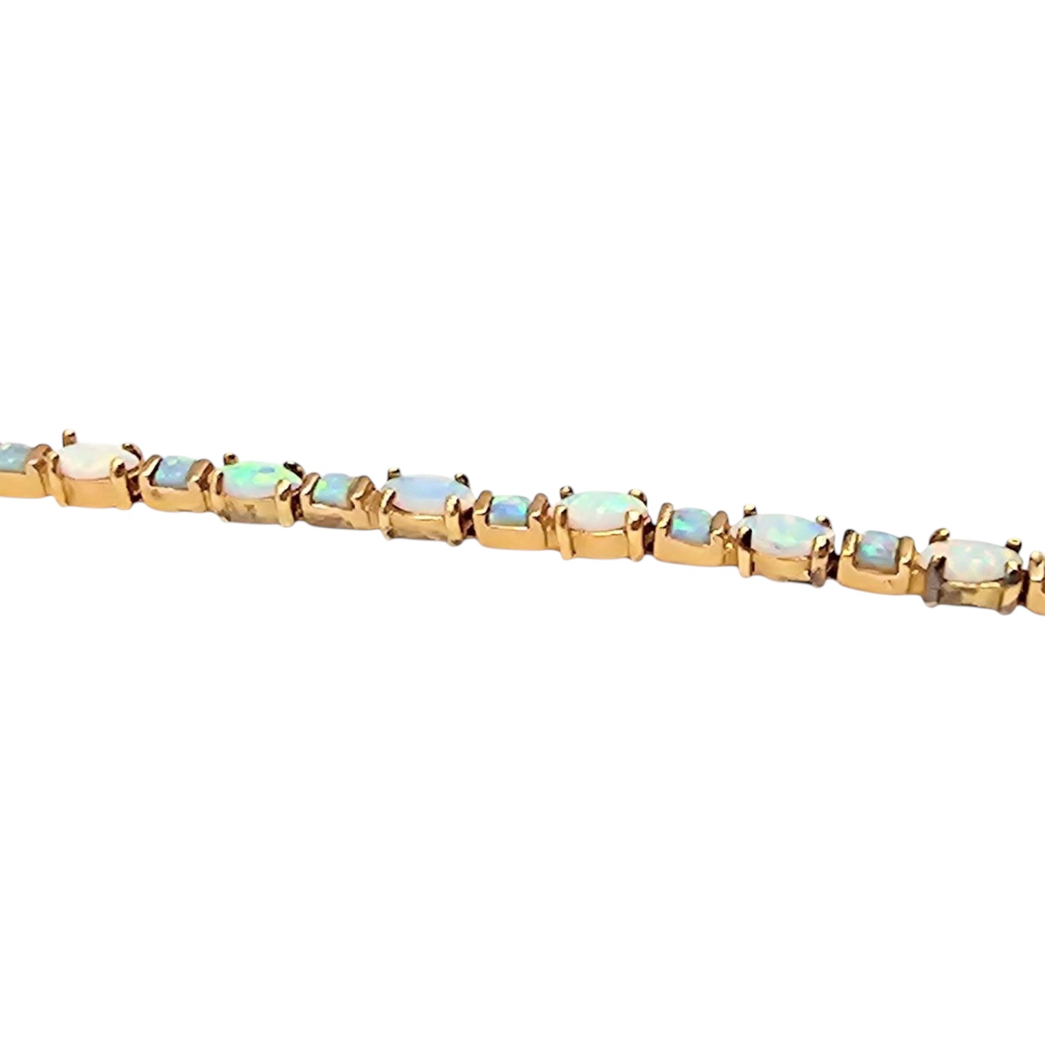 A tennis bracelet crafted with gold over sterling silver, featuring oval-cut opal gemstones set along the band. The total weight of the bracelet is 9.7 grams. The clasp is in functional condition, as evident in the detailed image. Measuring approximately 7 inches in length, it provides an elegant fit for most wrist sizes.
