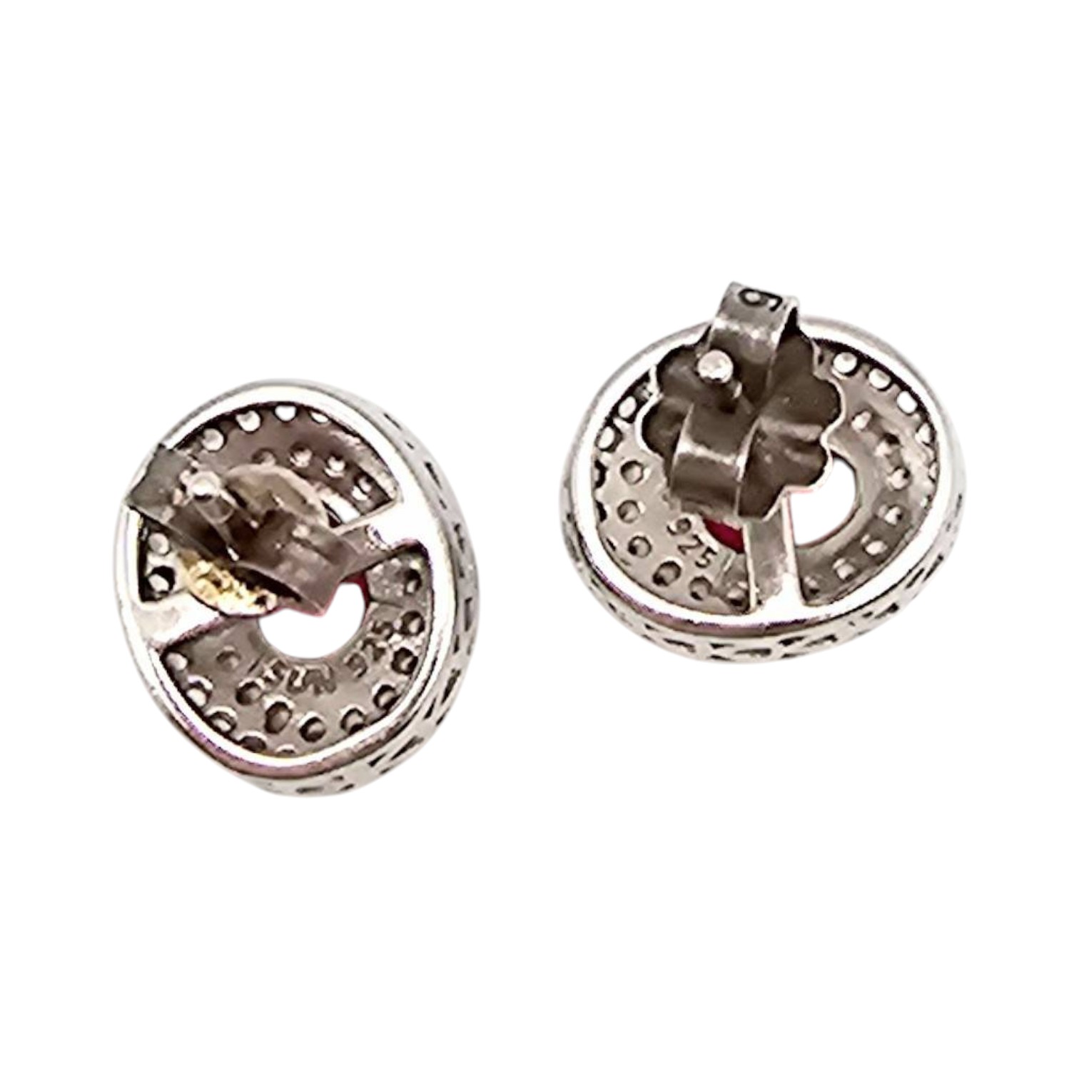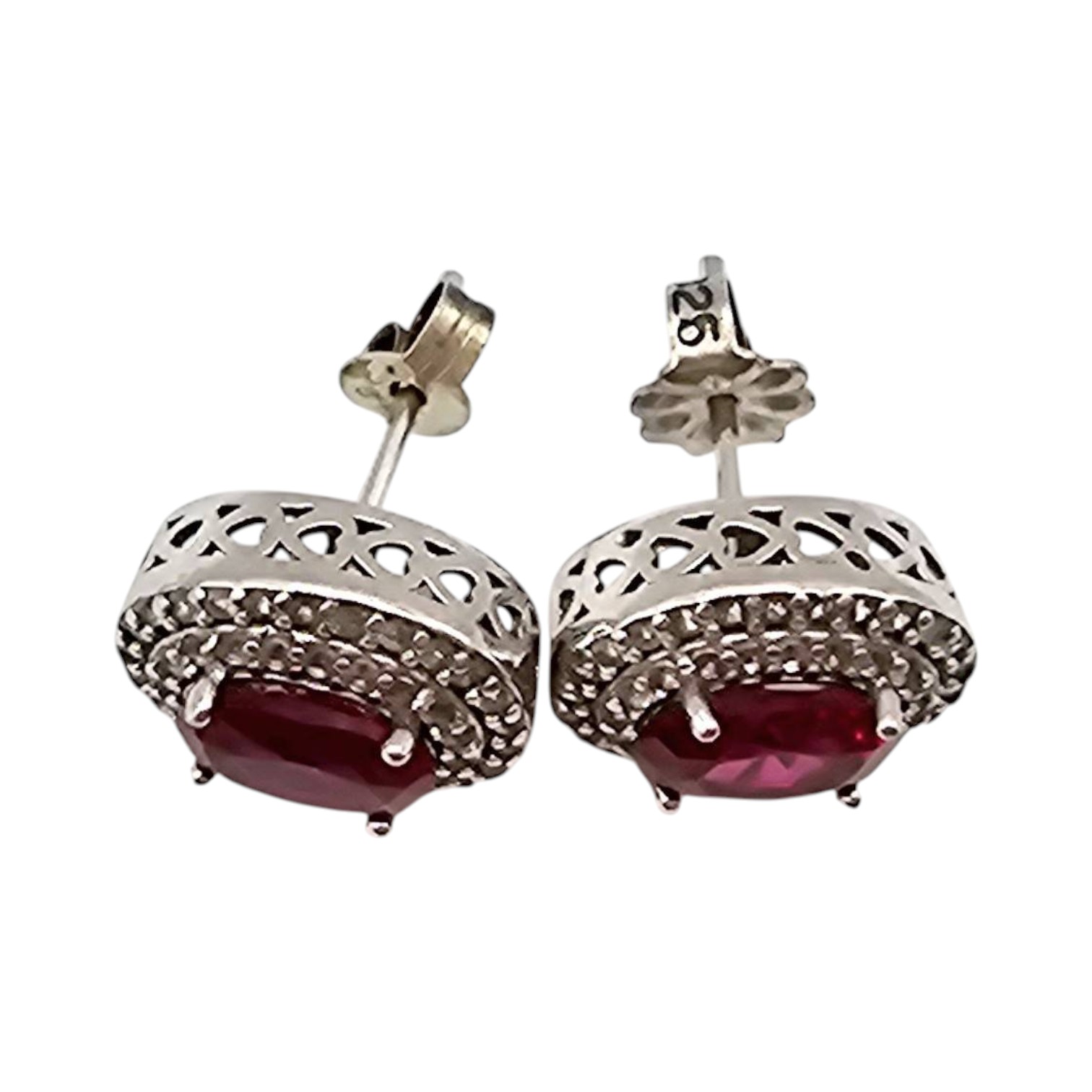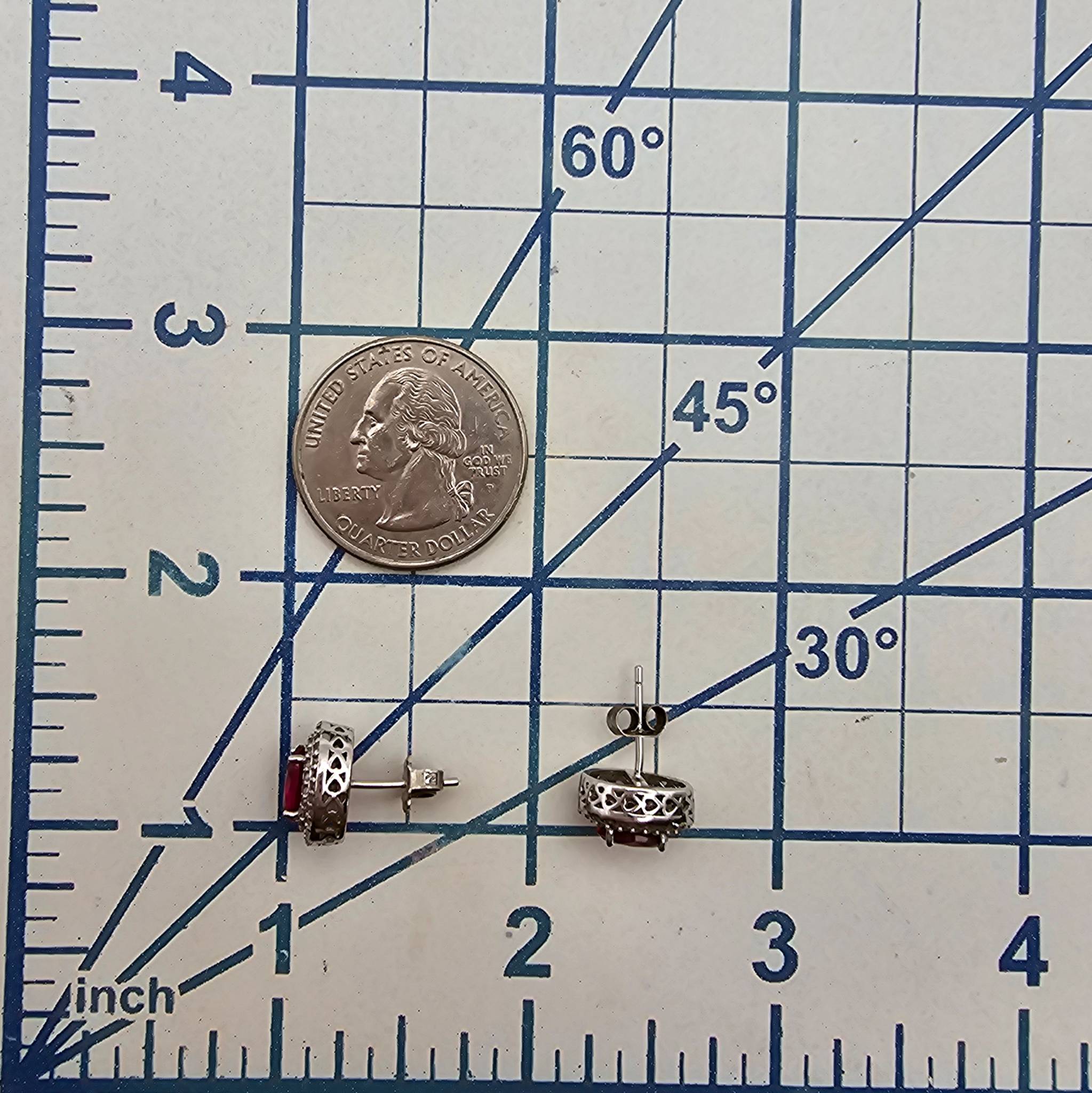 SUN Ruby white topaz earrings crafted in sterling silver, weighing 2.9 grams. These earrings feature vibrant red ruby-style stones surrounded by a clearstone halo. The design incorporates intricate silver detailing with secure post and butterfly back closures. A stunning combination of color and craftsmanship.
