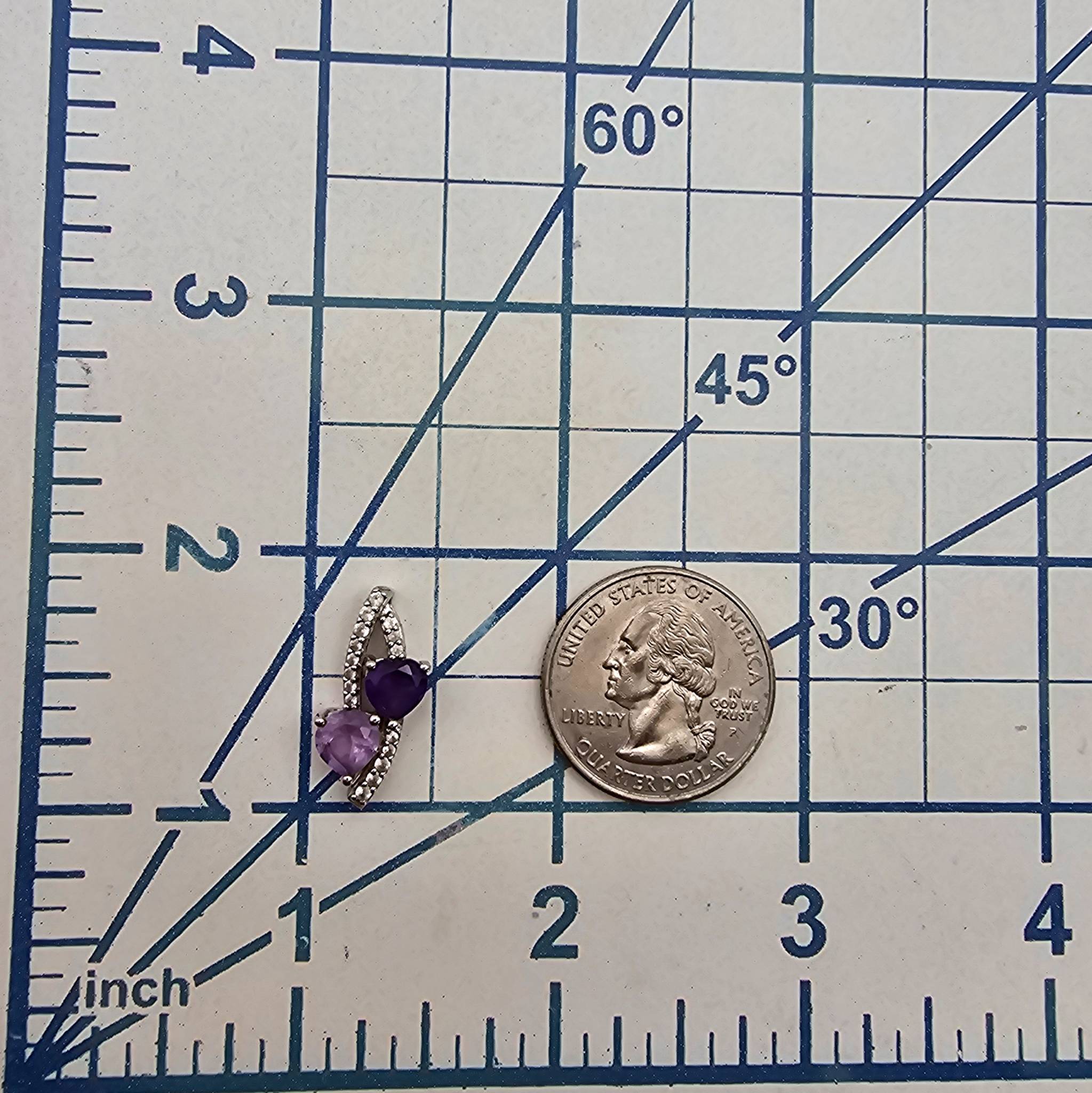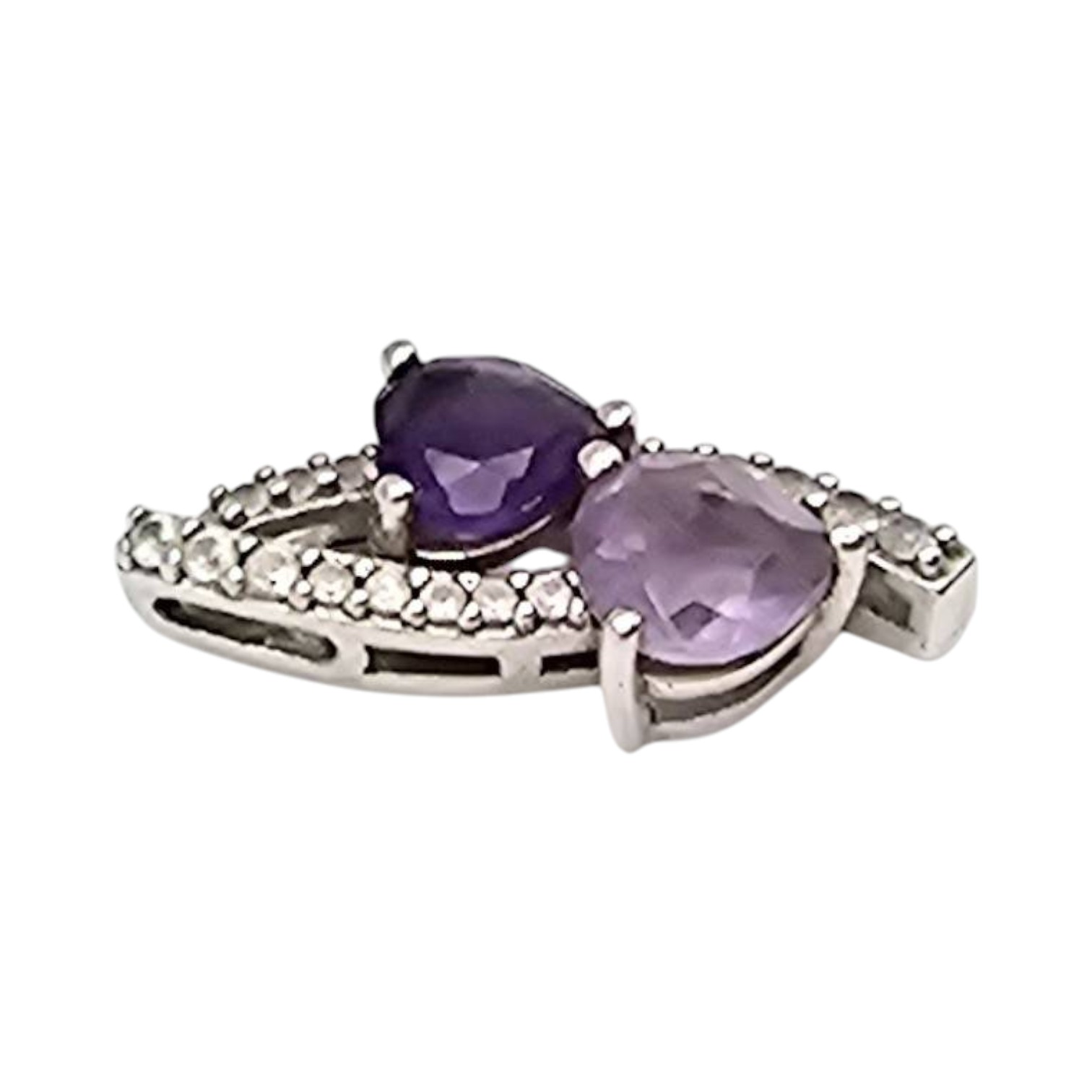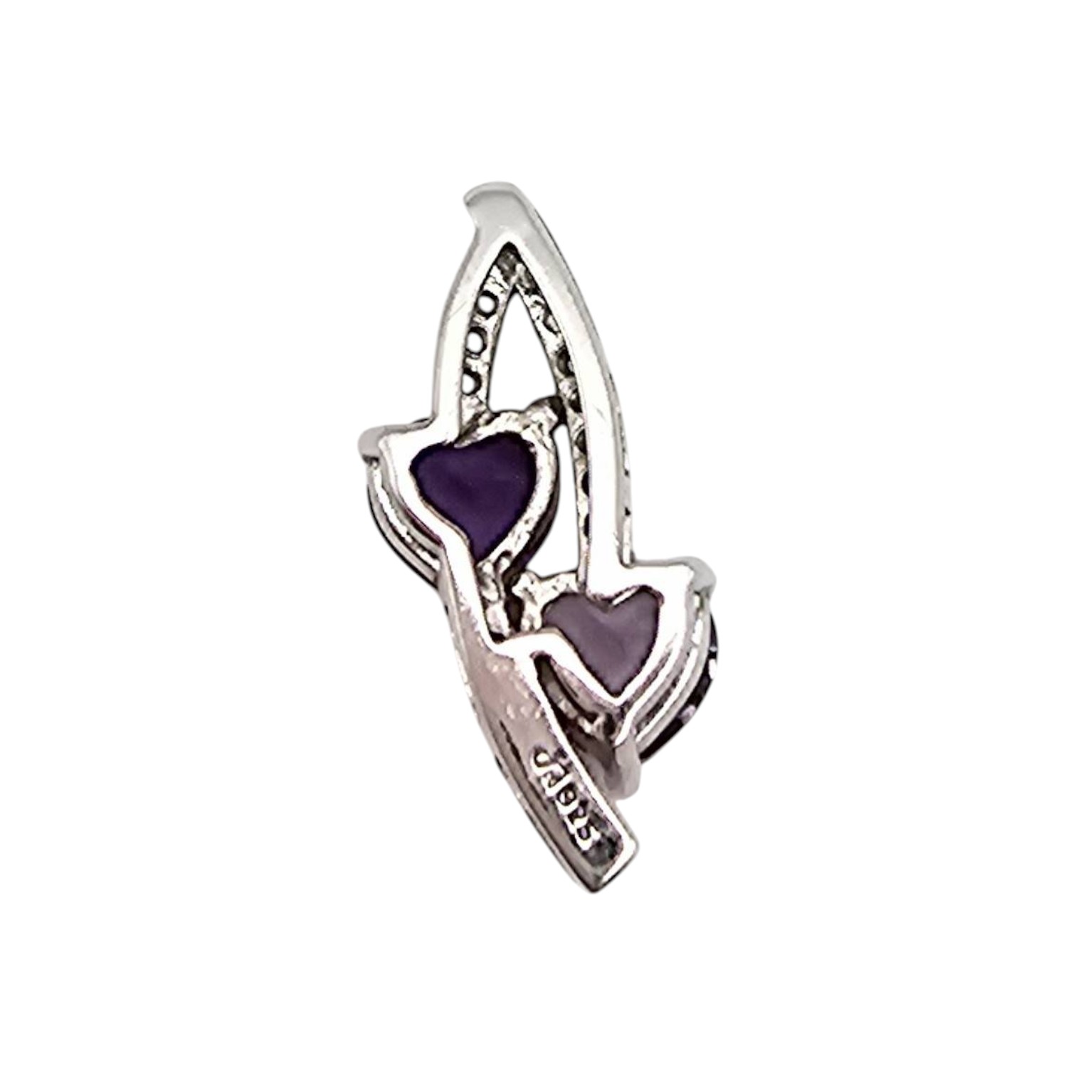 JR sterling silver pendant featuring two heart-shaped stones, one iolite and one amethyst, accented with a line of small clear gemstones. The piece weighs 1.9 grams and measures approximately 1 inch in height. The back is marked with ‘JR’ to signify the maker. Includes a delicate design suited for a chain or necklace.
