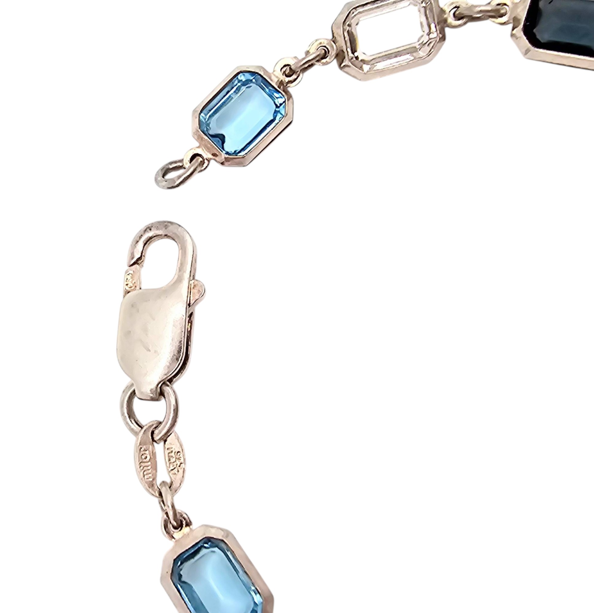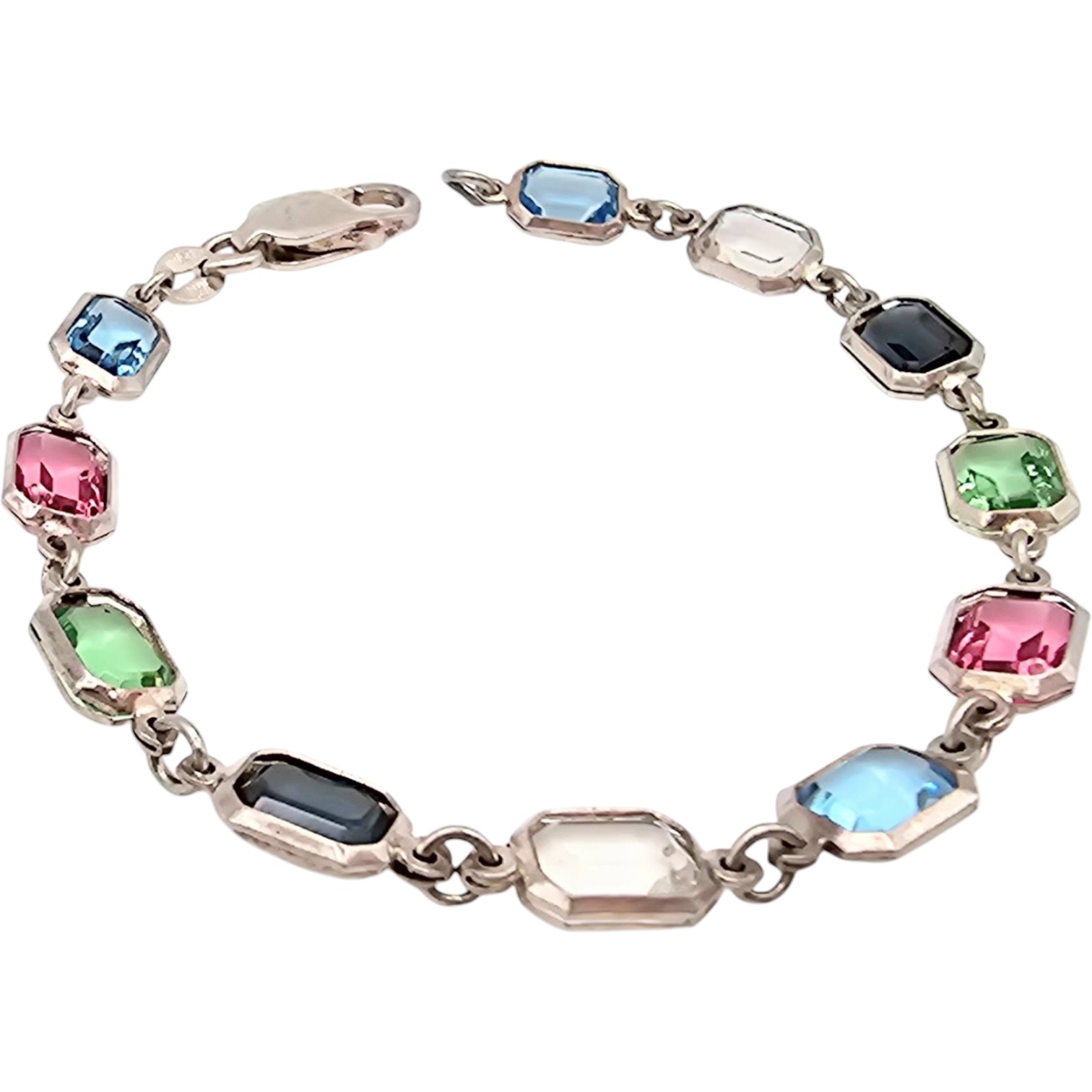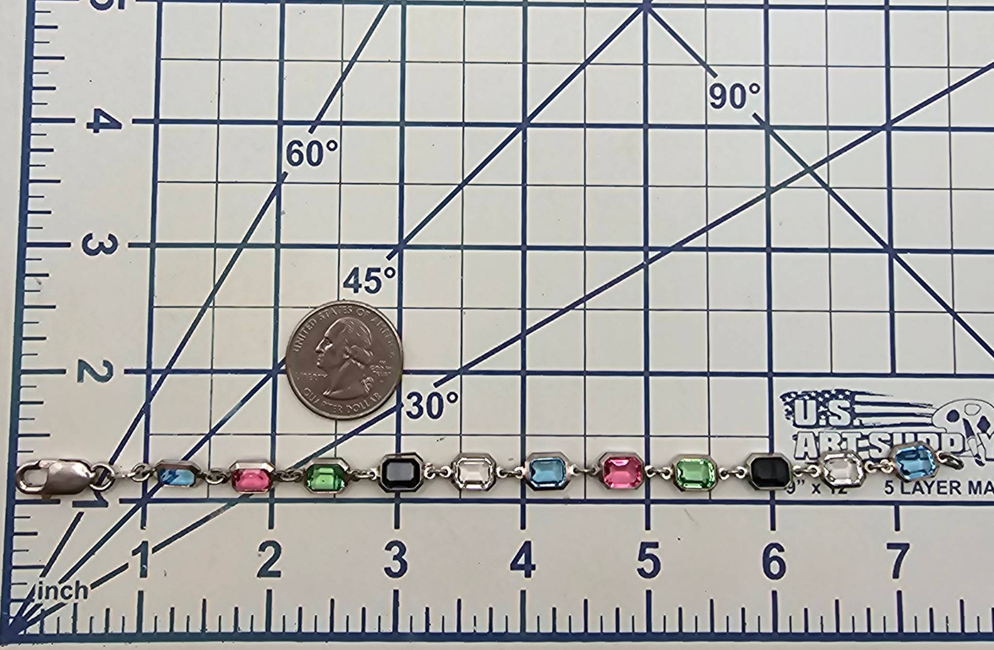 Crystal bracelet crafted from sterling silver, featuring rectangular-shaped colorful crystals in blue, pink, green, white, and black hues. The bracelet has a total weight of 8.7g and is secured by a lobster clasp. Suitable for elegant wear or casual accessorizing. Exact dimensions are unspecific but shown alongside a standard US quarter for scale.