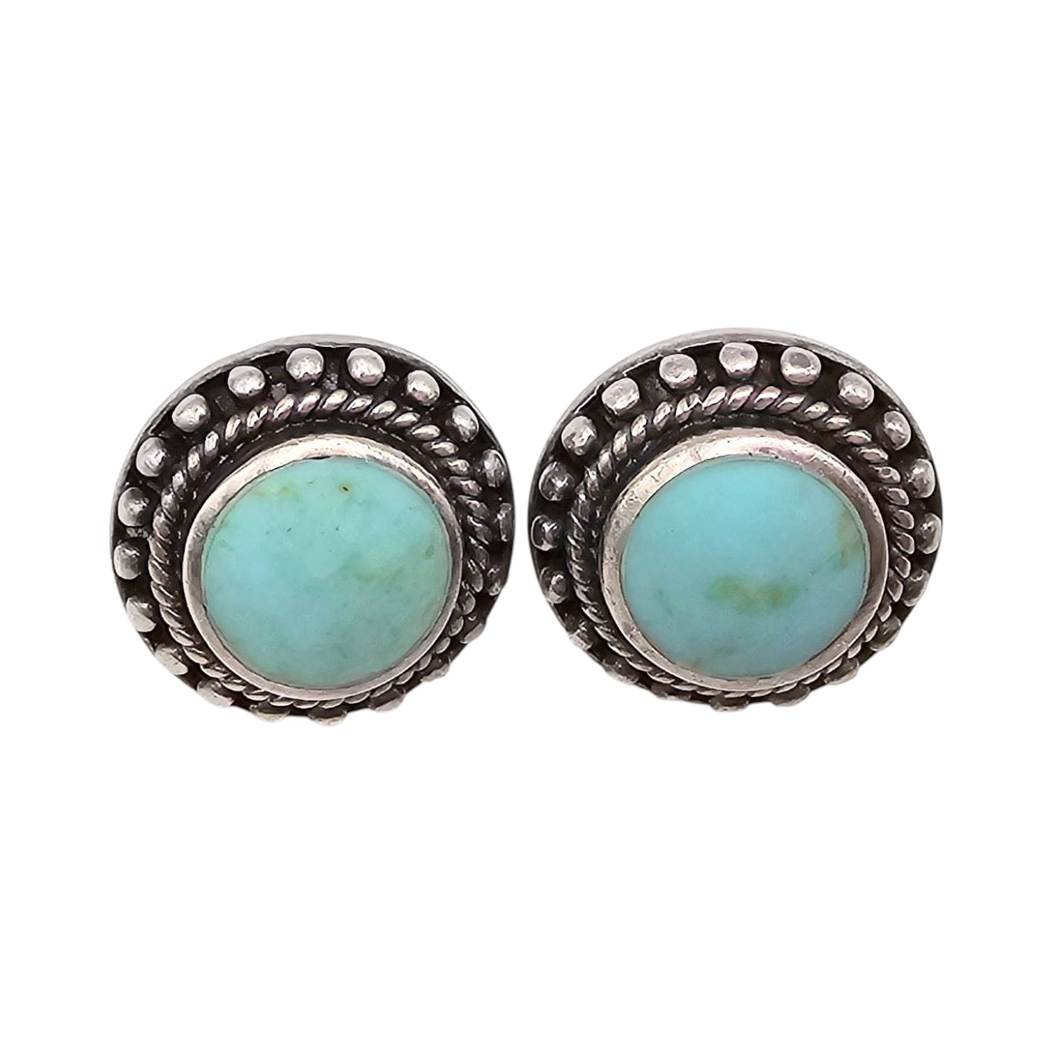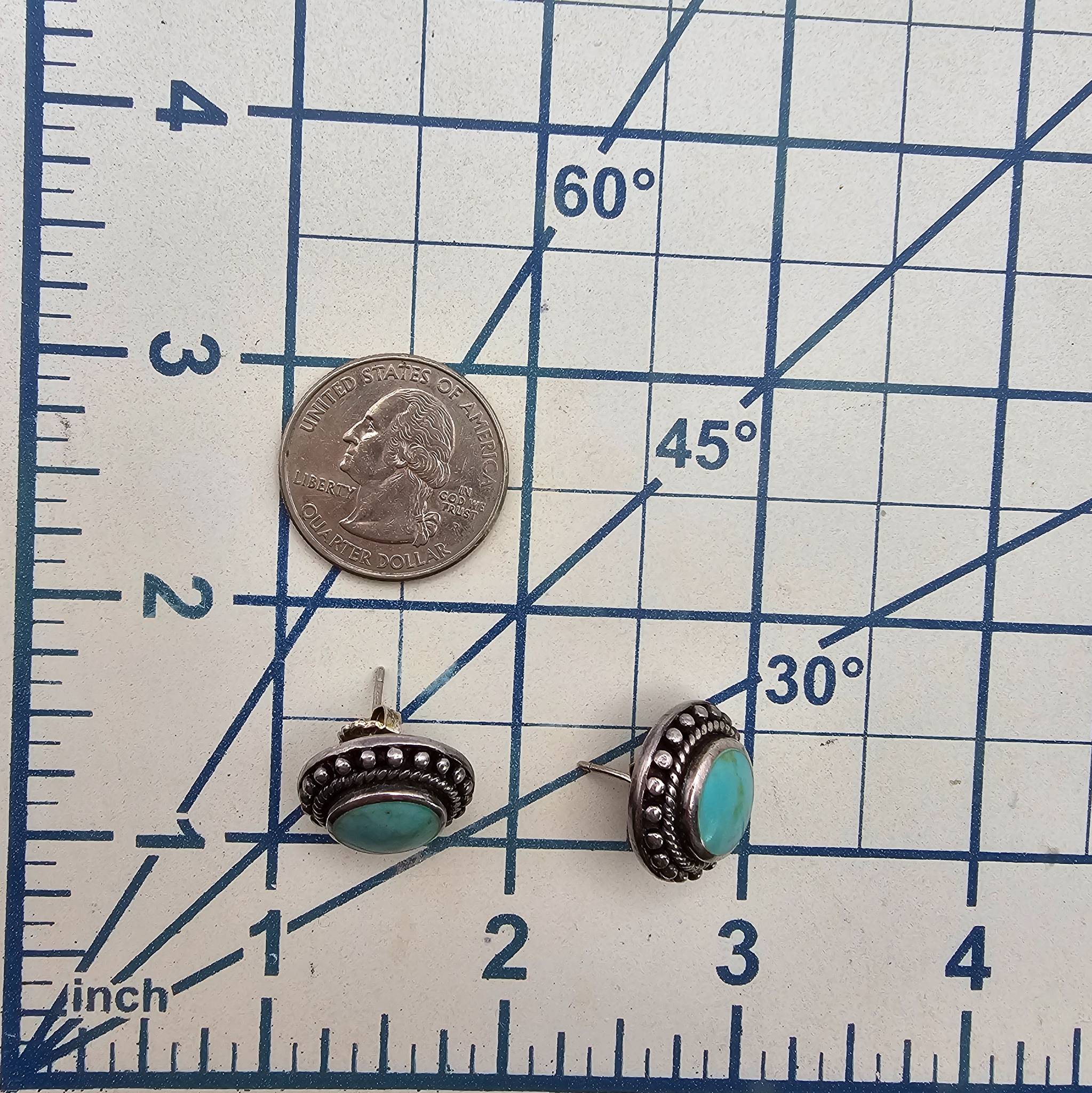 Stud earrings crafted in sterling silver, each featuring a turquoise stone set in a round design adorned with twisted rope and dotted decorative details. The earrings weigh 10.7g in total and are marked “9ct” on the reverse. The diameter aligns closely with a U.S. quarter, providing size reference.