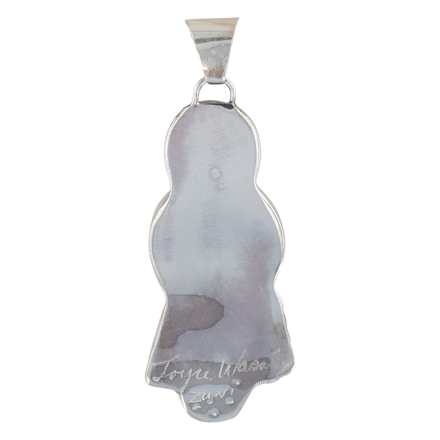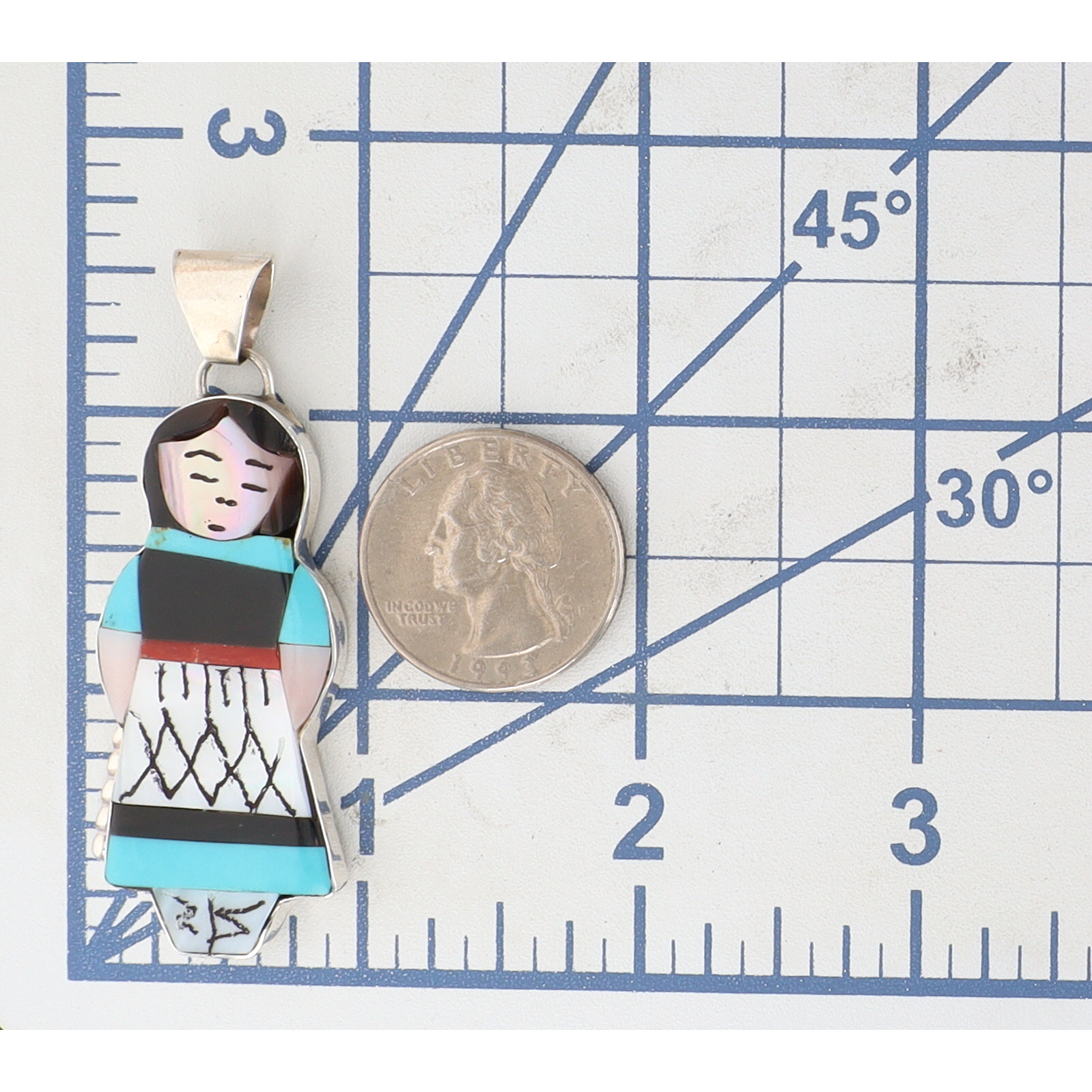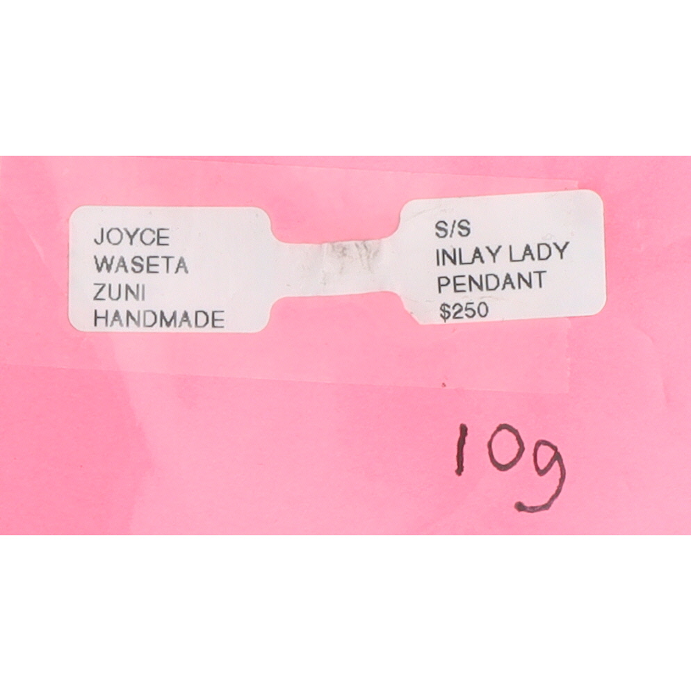 A Zuni handmade sterling silver inlay corn maiden pendant by Joyce Waseta, featuring coral, turquoise, onyx, mother-of-pearl, inscribed ‘Joyce Waseta Zuni’ on the reverse, measuring approximately 1.75 inches long and weighing 10 grams.