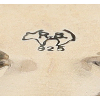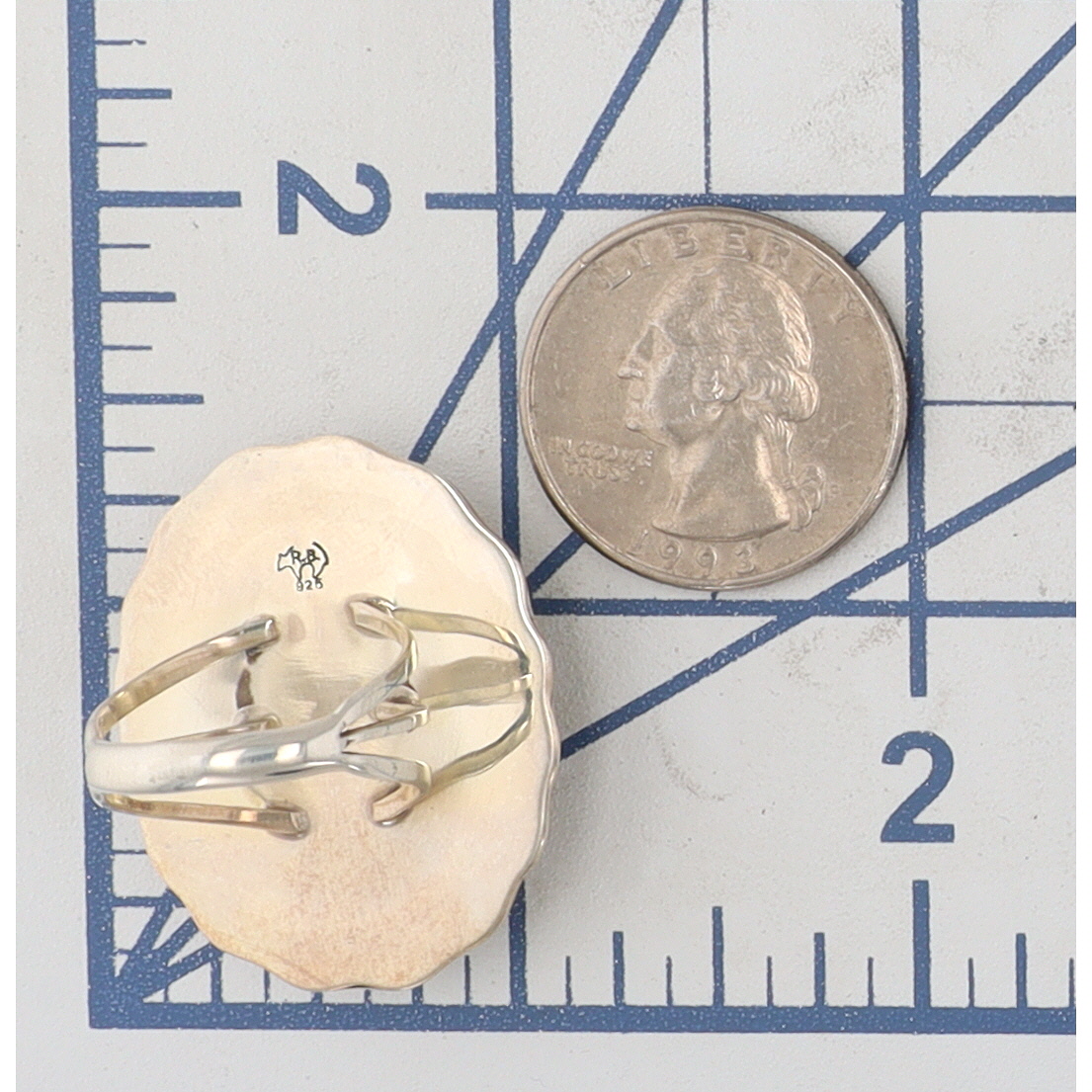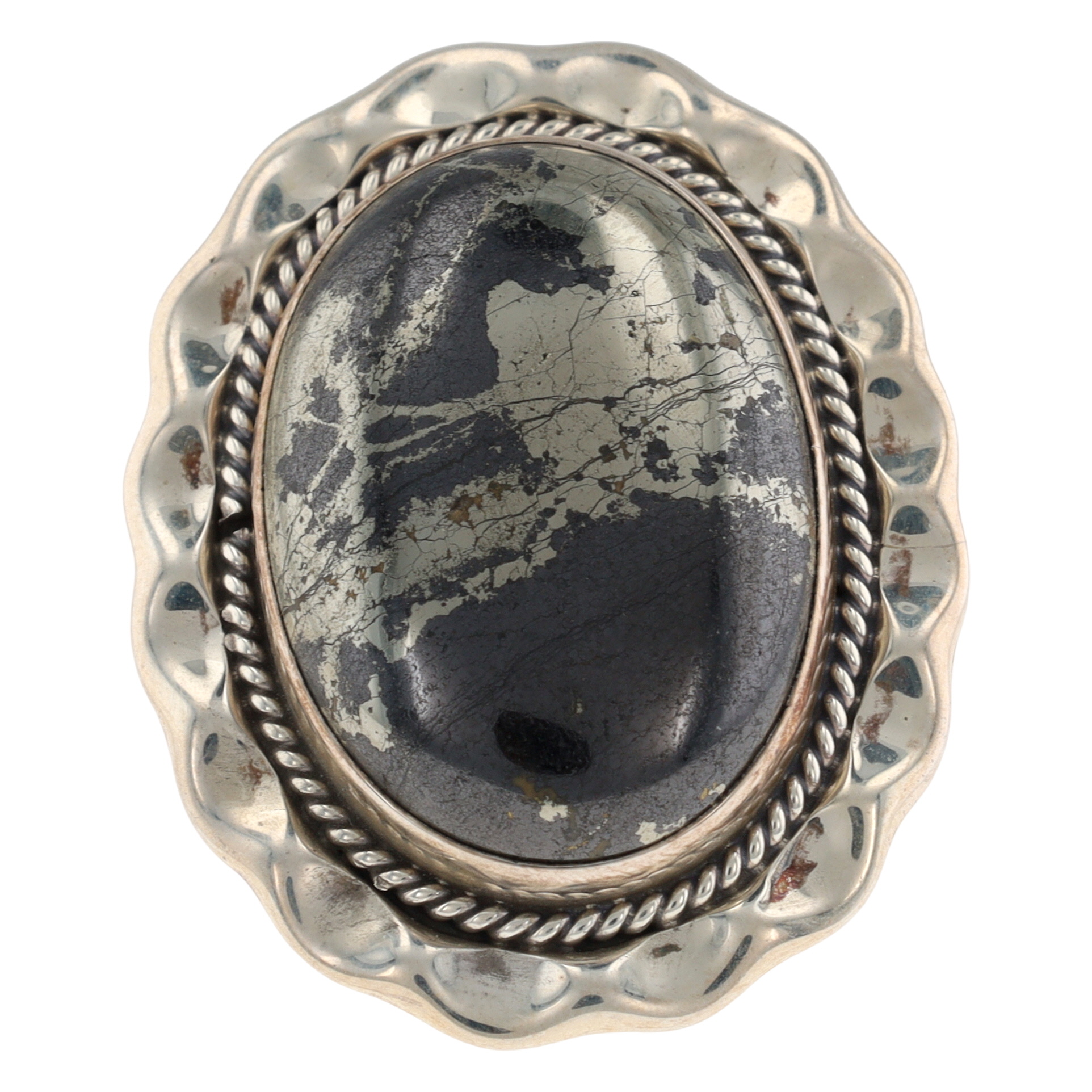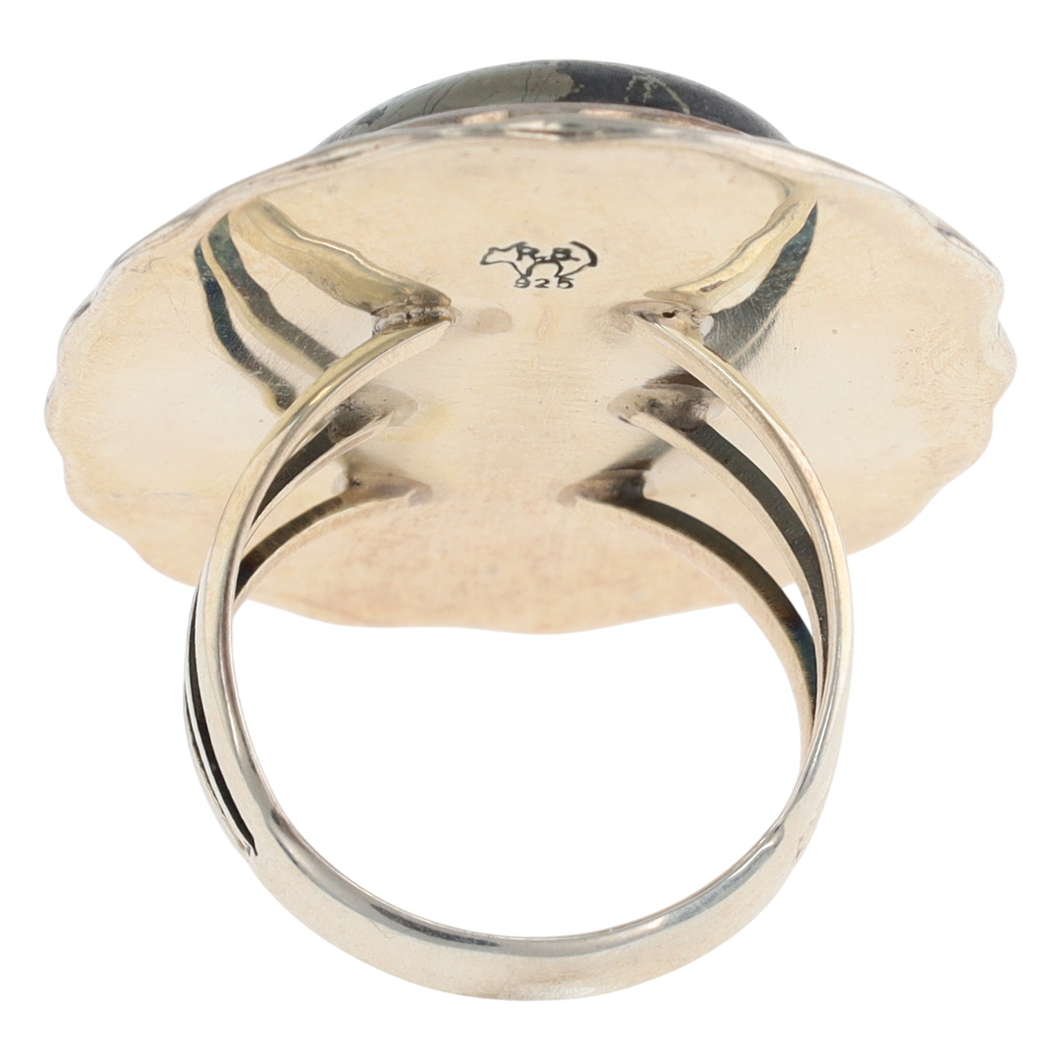 A sterling silver Navajo ring with a large oval pyrite-magnetite mixed stone, featuring a maker’s mark of a bear figure with ‘R.B.’ and ‘925’ inscribed on the back, weighing 15g and with a face approximately 1.5 inches long, ring size US 6