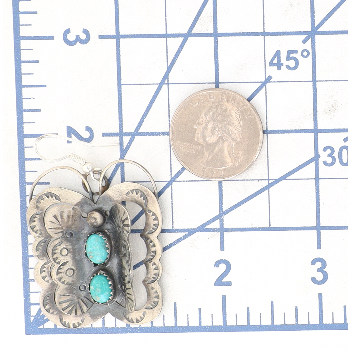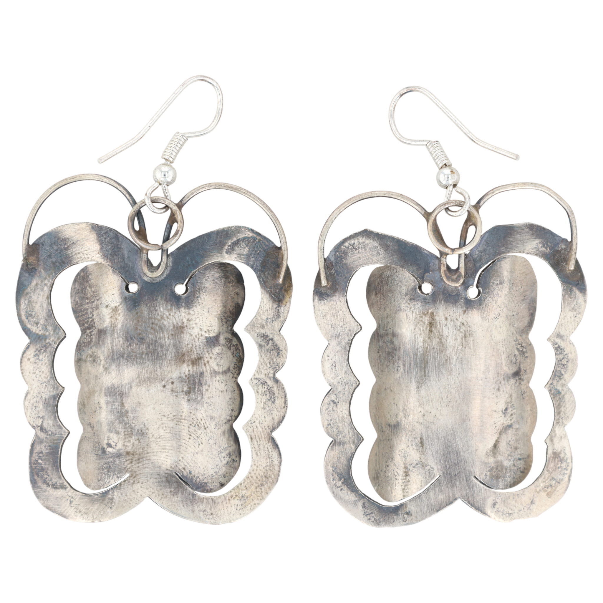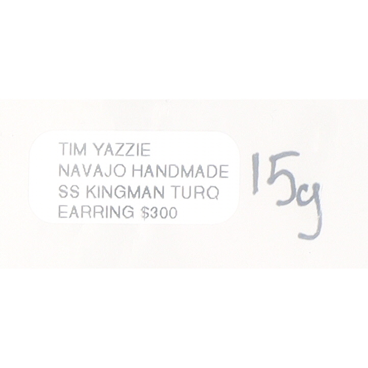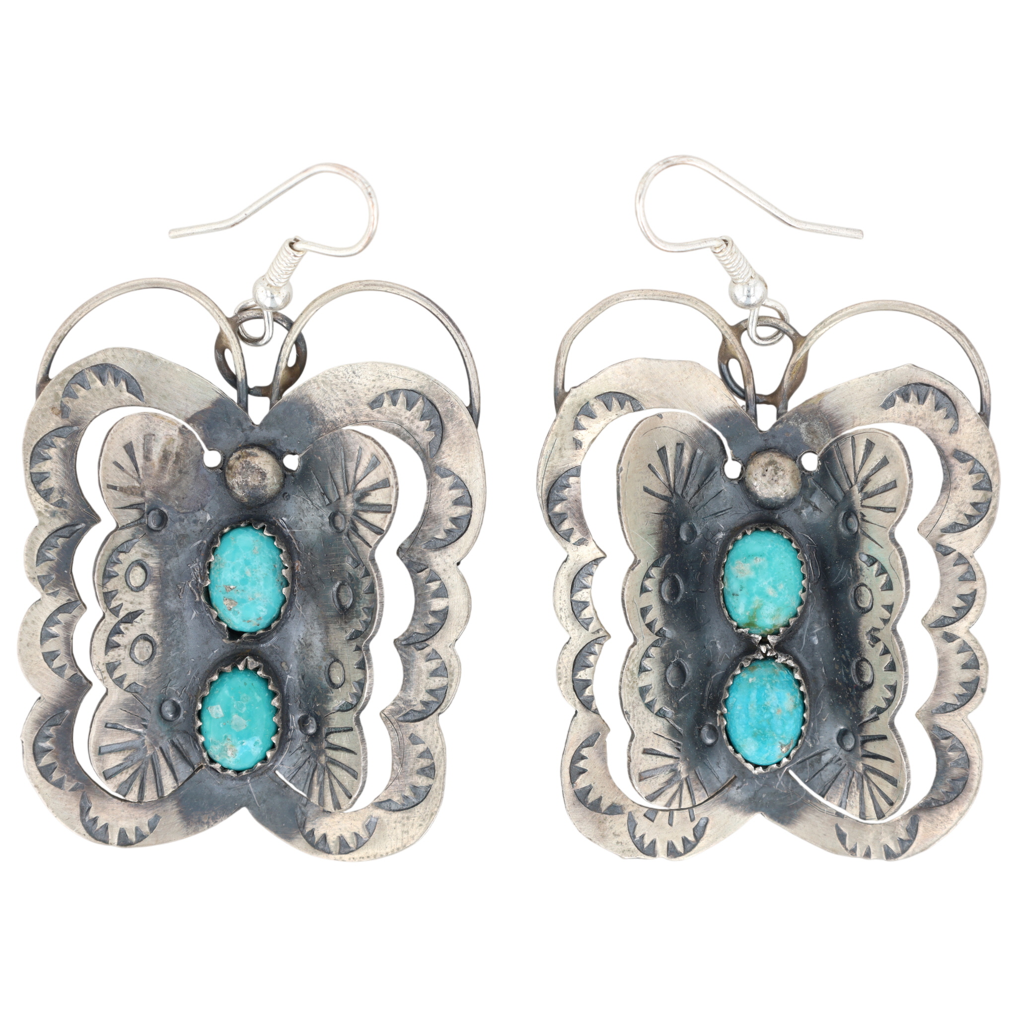 A pair of Tim Yazzie Navajo handmade sterling silver Kingman turquoise butterfly earrings, measuring approximately 2 inches long and weighing 15g.