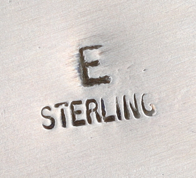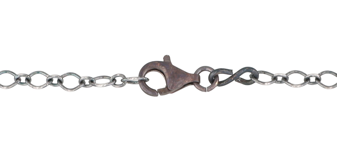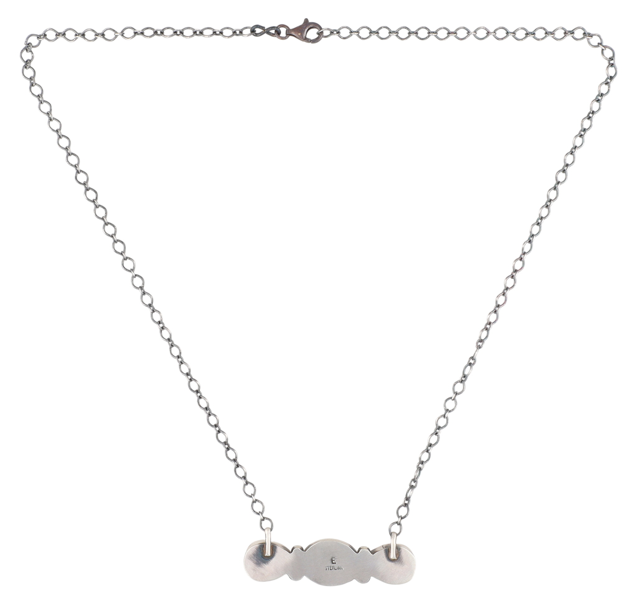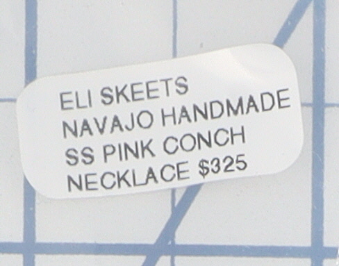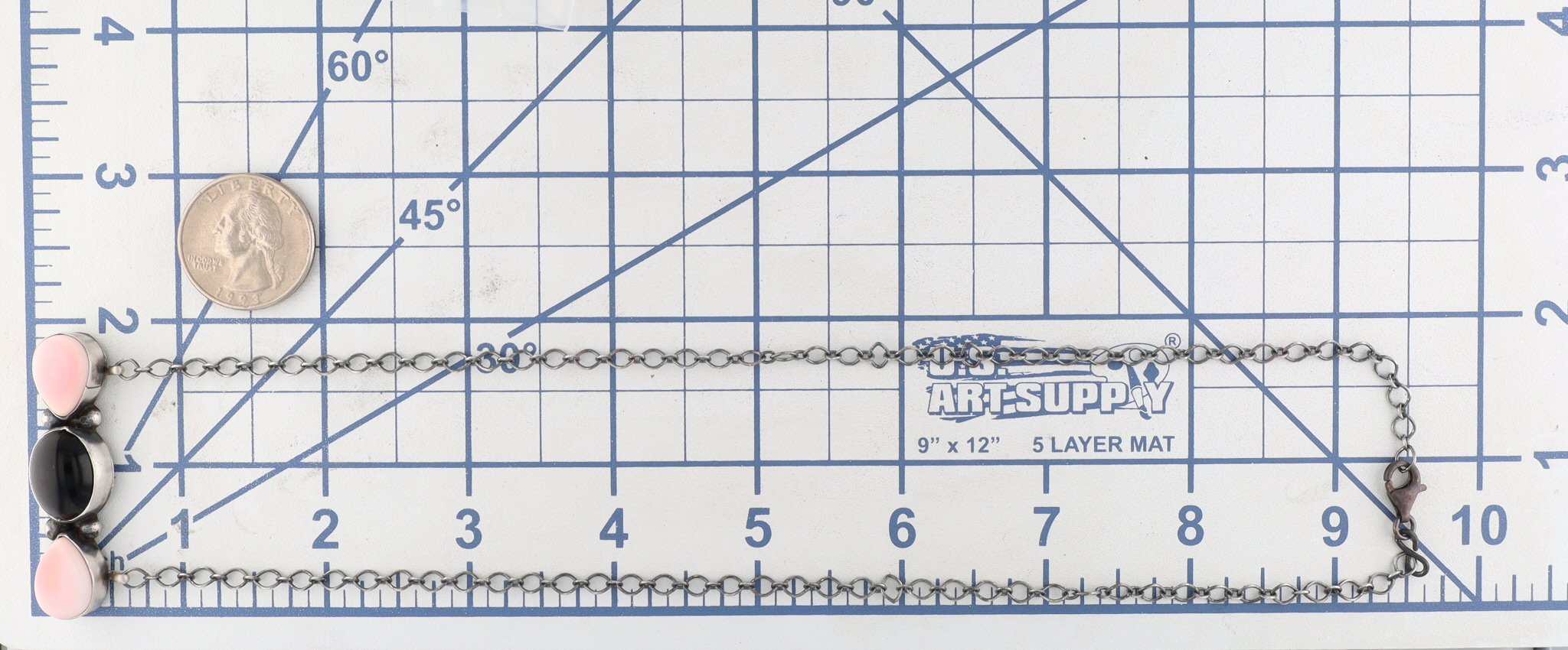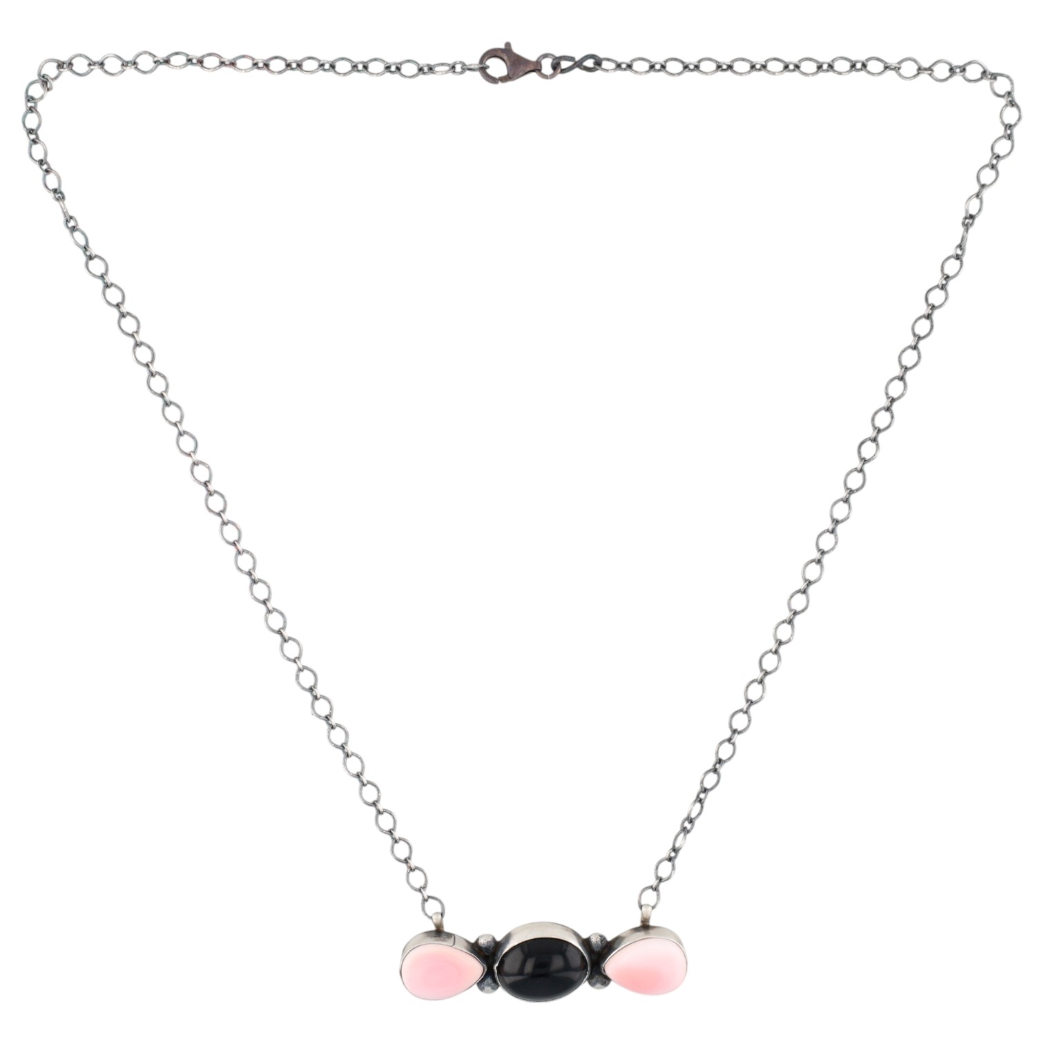 A sterling silver necklace by Eli Skeets featuring a pendant with two pink conch teardrop stones and one central black oval stone, marked ‘E’ and ‘STERLING’, weighing 14.5g and measuring approximately 18 inches long.