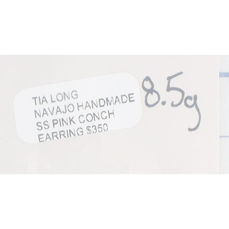 A pair of Navajo handmade silver and pink conch earrings, marked ‘TIA LONG’, ‘T3’, and ‘Sterling’, weighing 8.5g, measuring approximately 1.75 inches long.