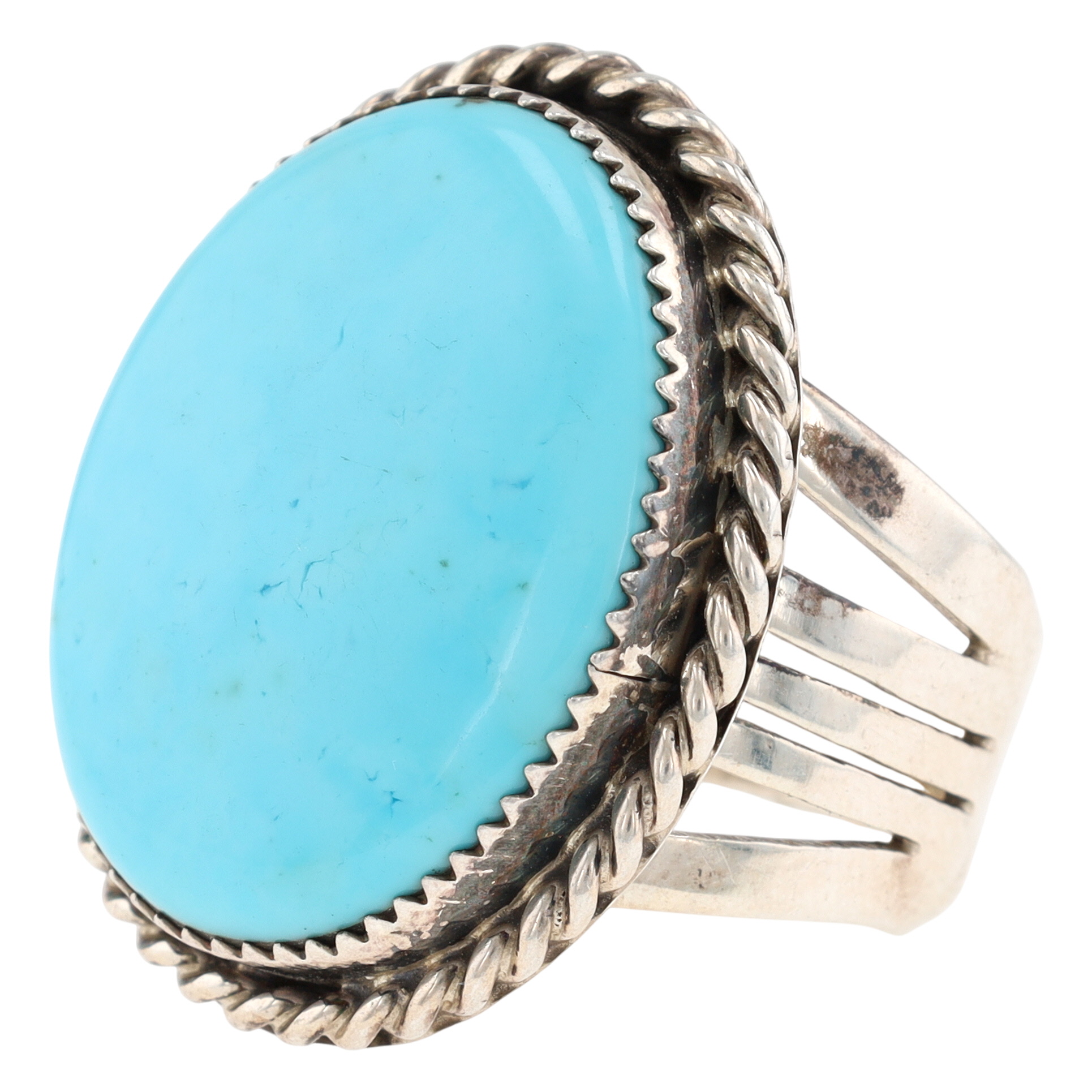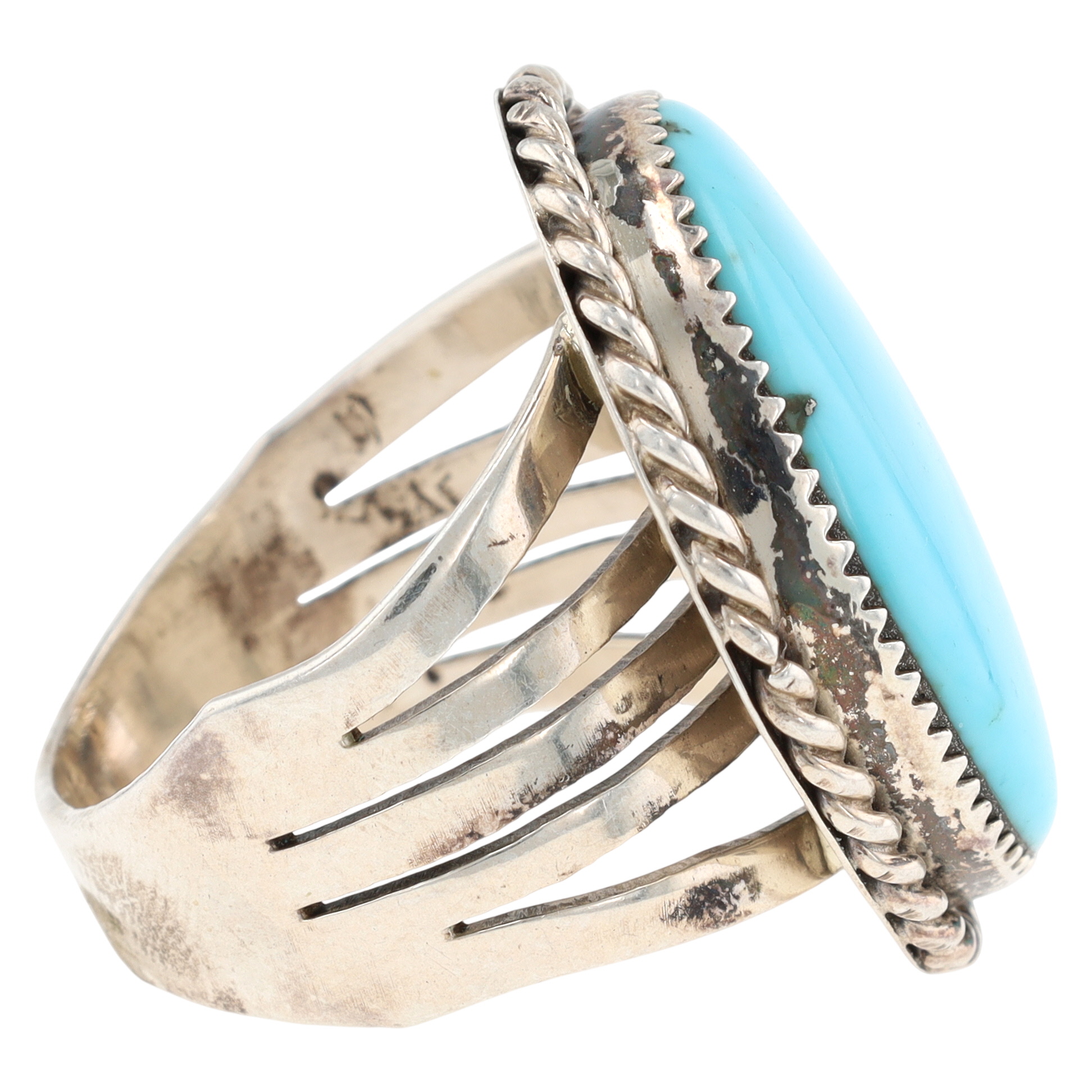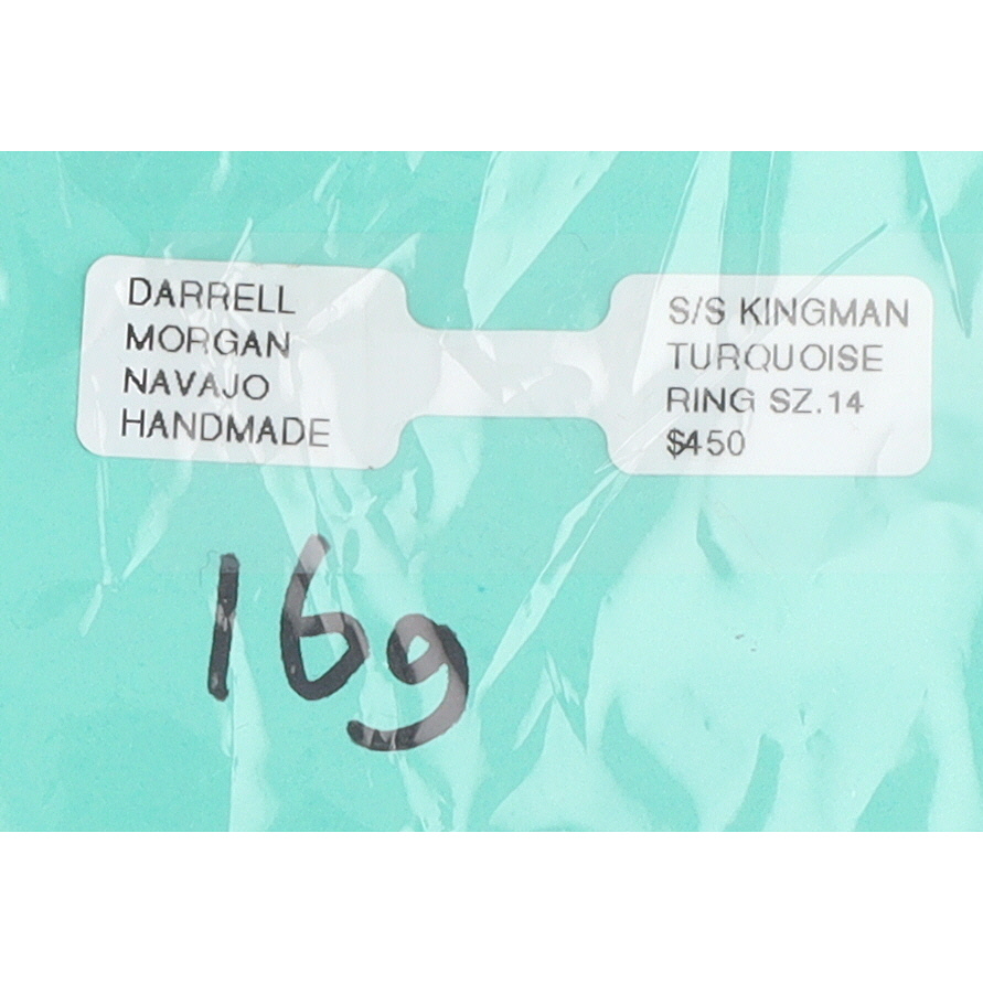 A sterling ring featuring a large oval light blue turquoise stone, identified by tag as a Darrell Morgan Navajo handmade sterling silver Kingman turquoise ring, size 14, weighing 16g. Hallmarked RB .925 for Running Bear Shop