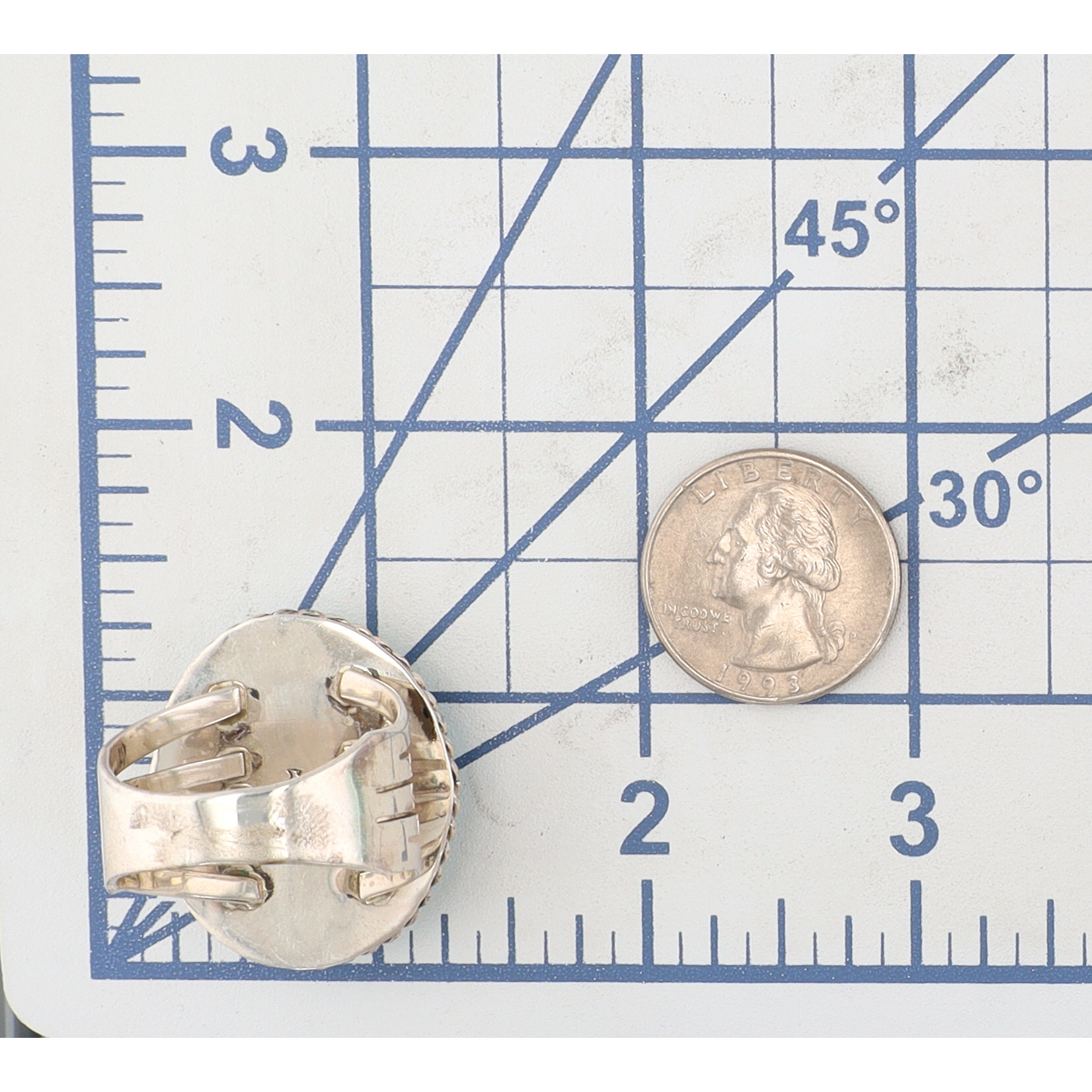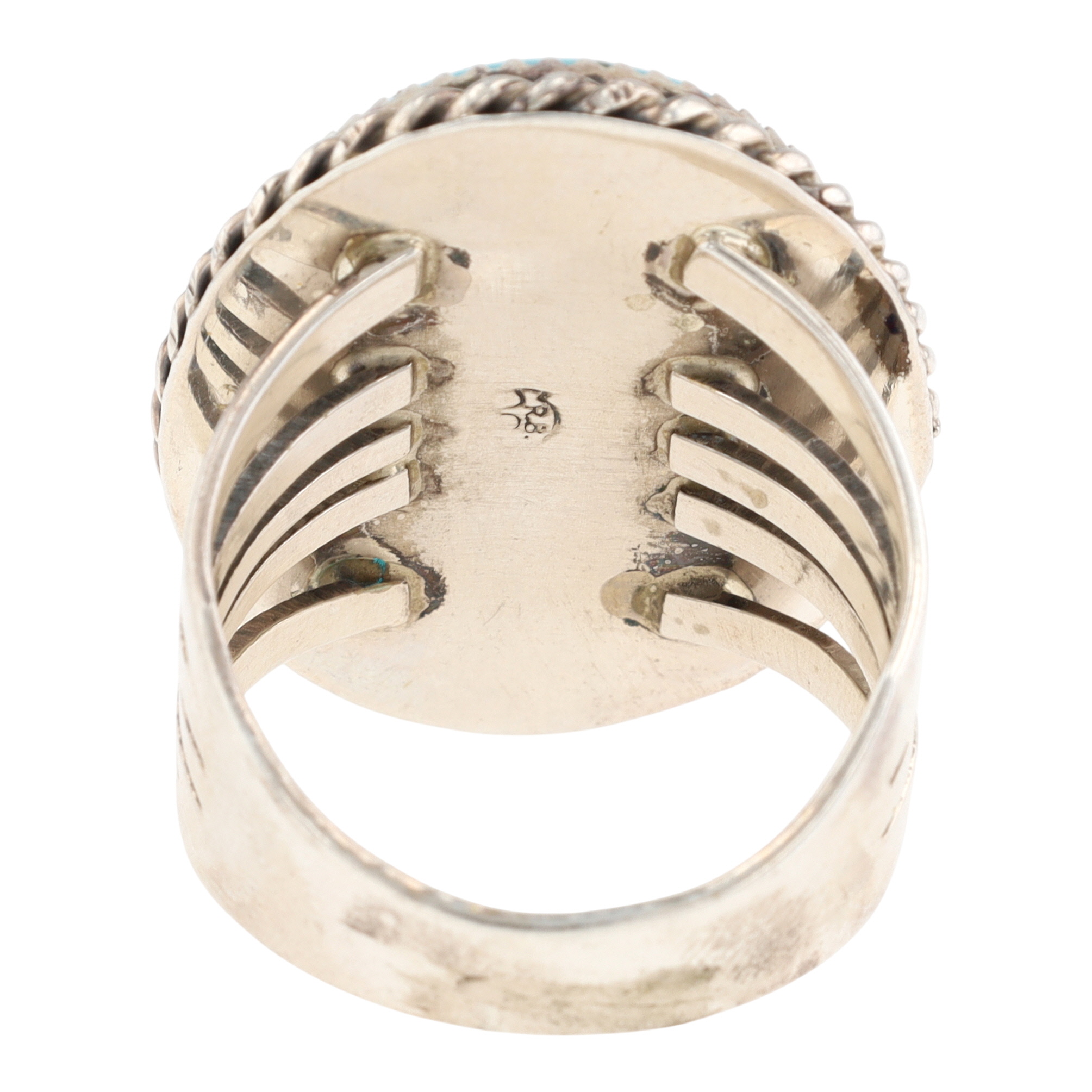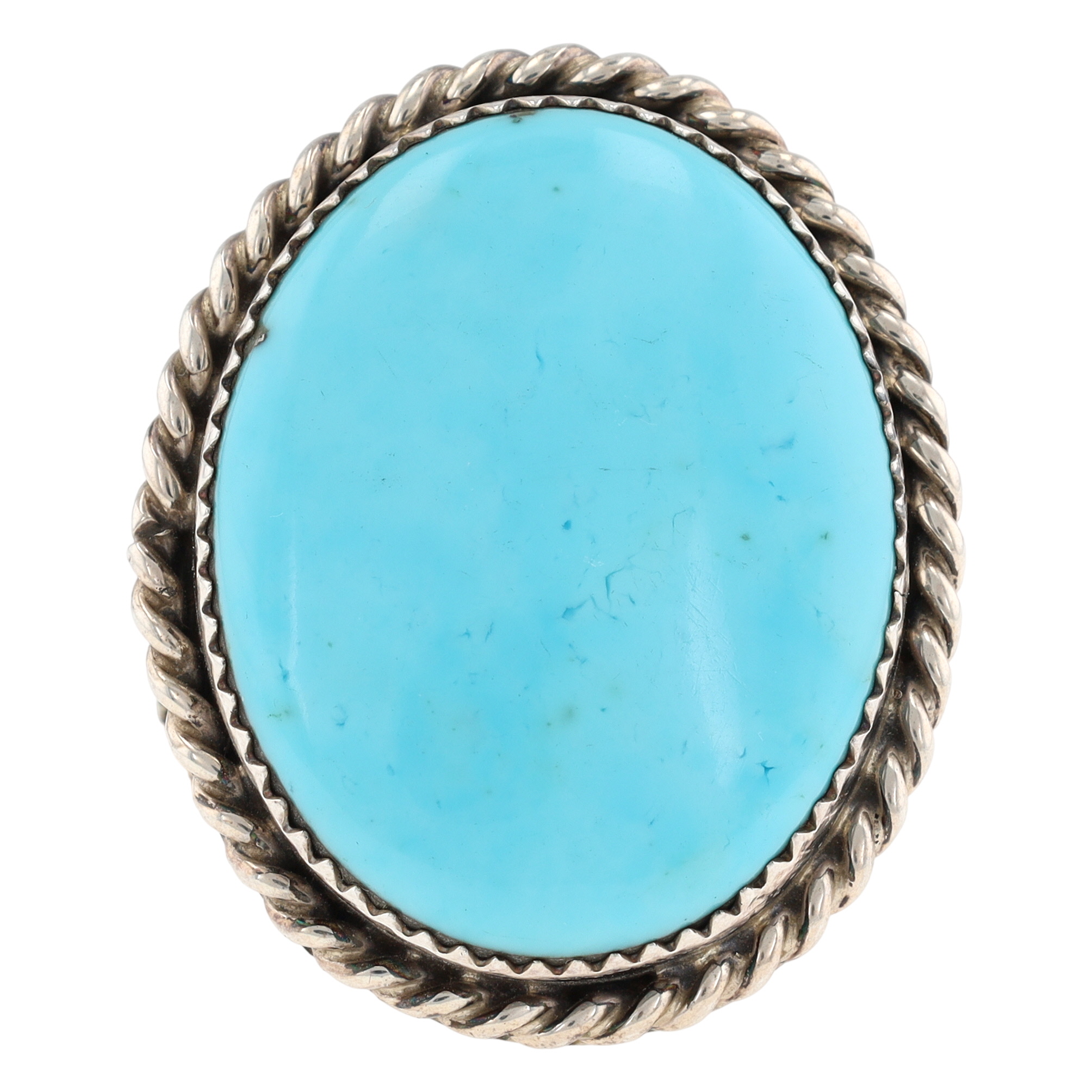A sterling ring featuring a large oval light blue turquoise stone, identified by tag as a Darrell Morgan Navajo handmade sterling silver Kingman turquoise ring, size 14, weighing 16g. Hallmarked RB .925 for Running Bear Shop