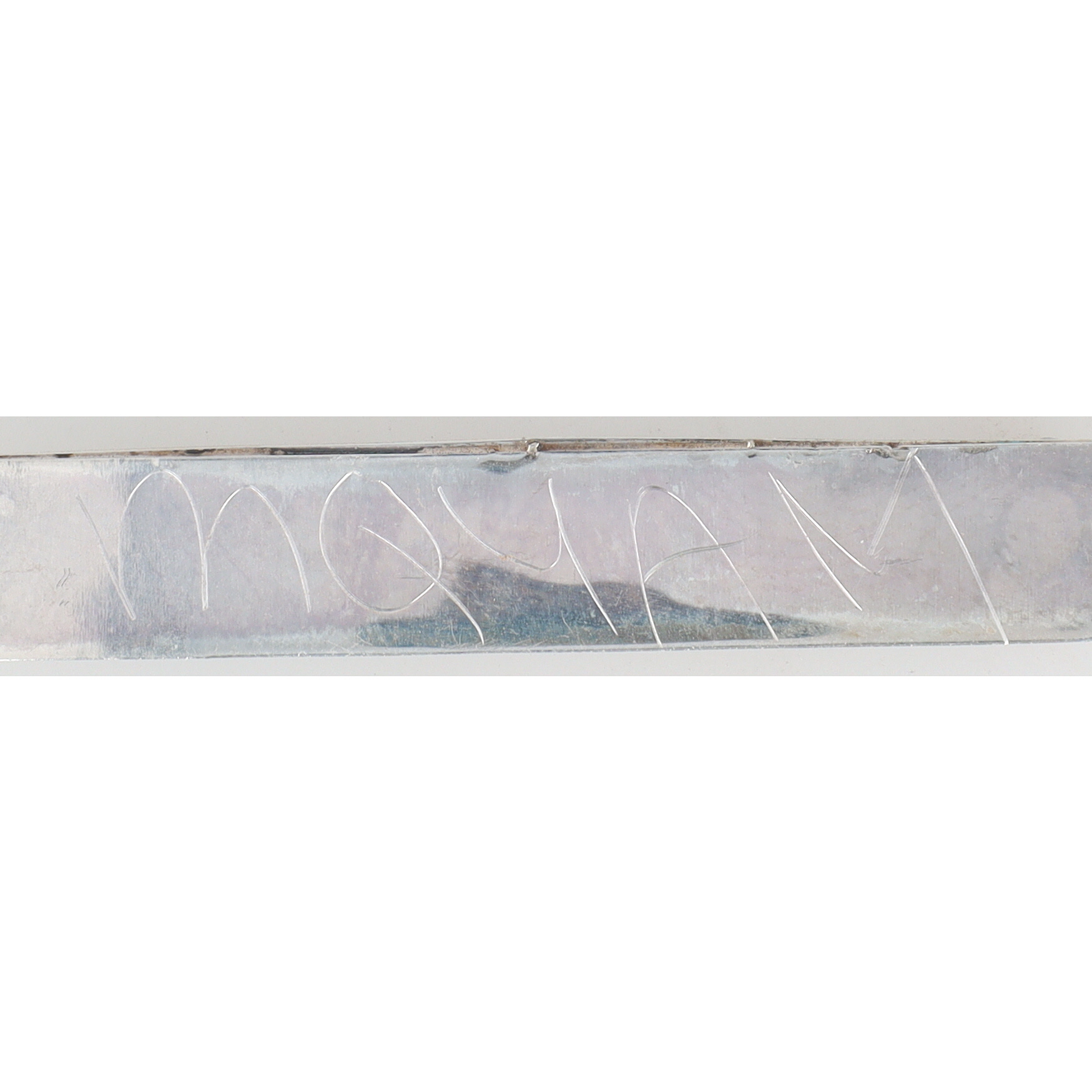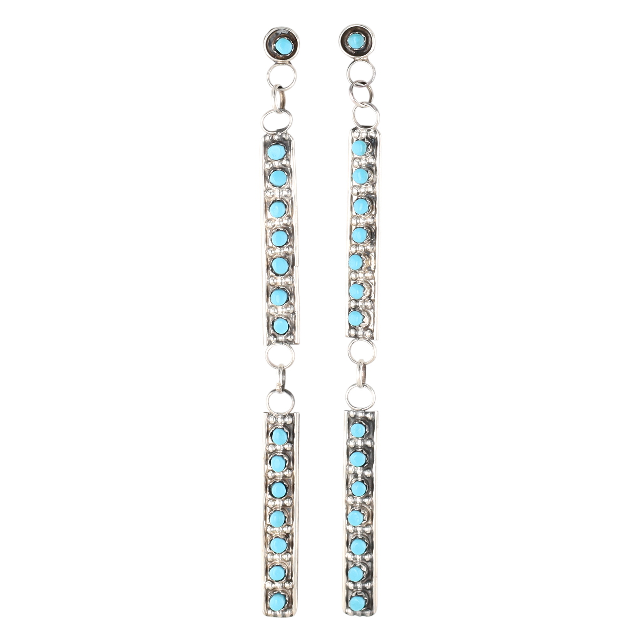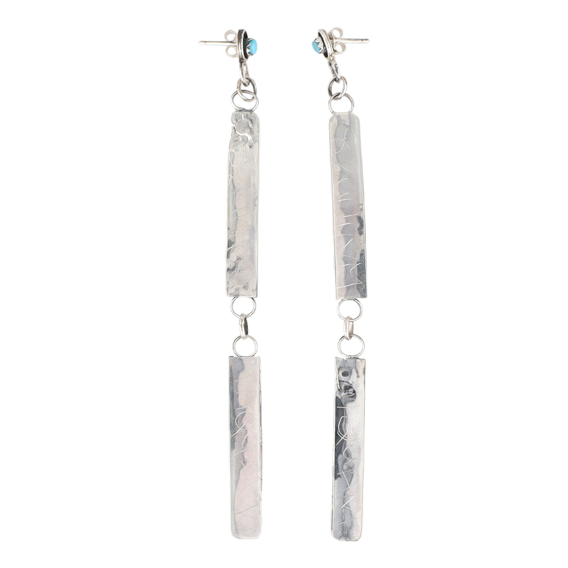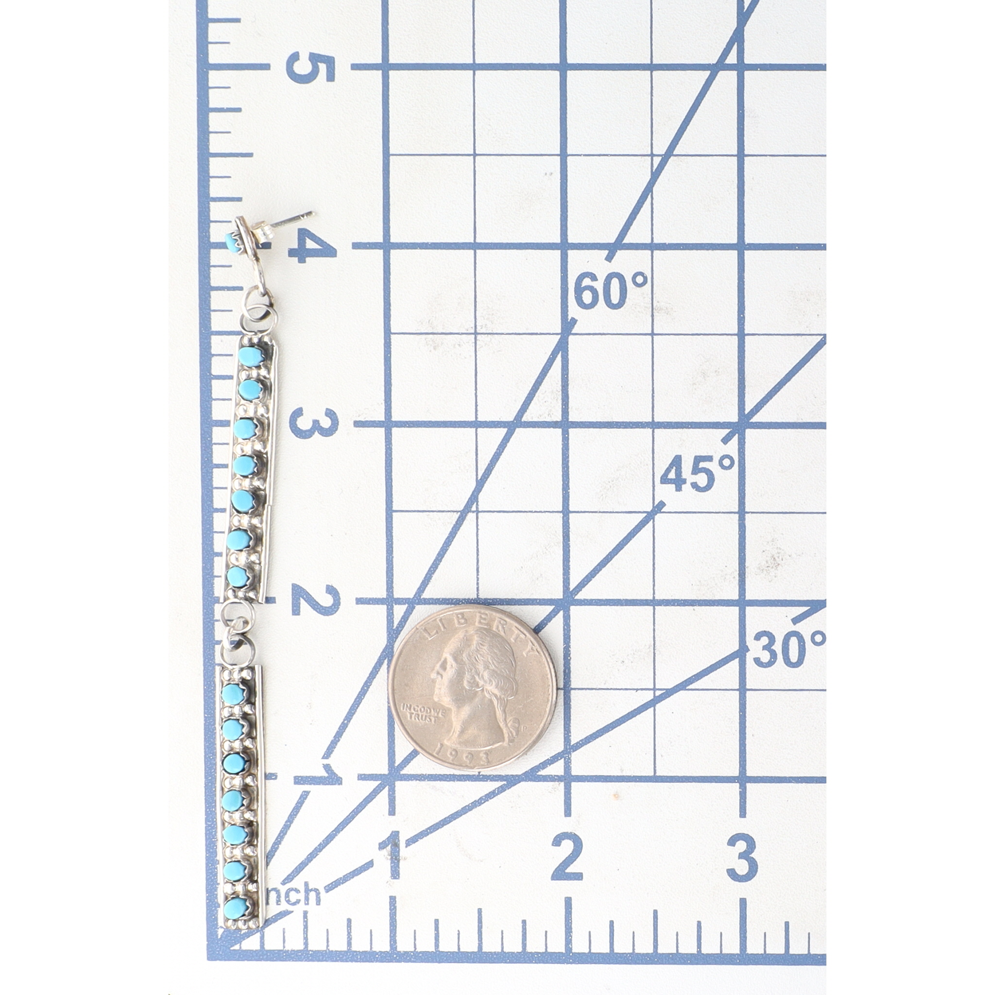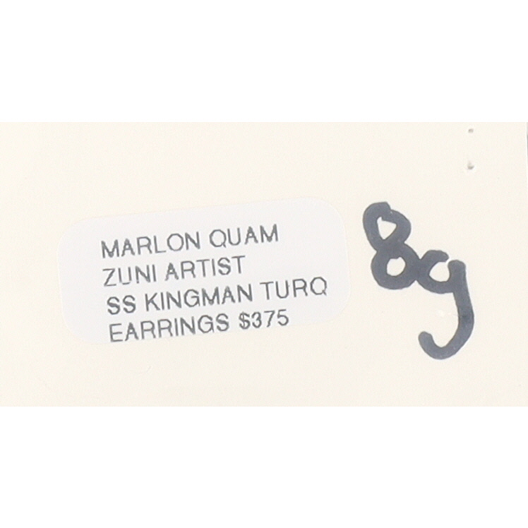 A pair of Marlon Quam Zuni silver and Kingman turquoise dangle earrings, each approximately 3.5 inches long, weighing 8g, featuring two rectangular segments adorned with multiple small oval turquoise stones, marked ‘MQUAM’ and ‘SS ZUNI NM’.