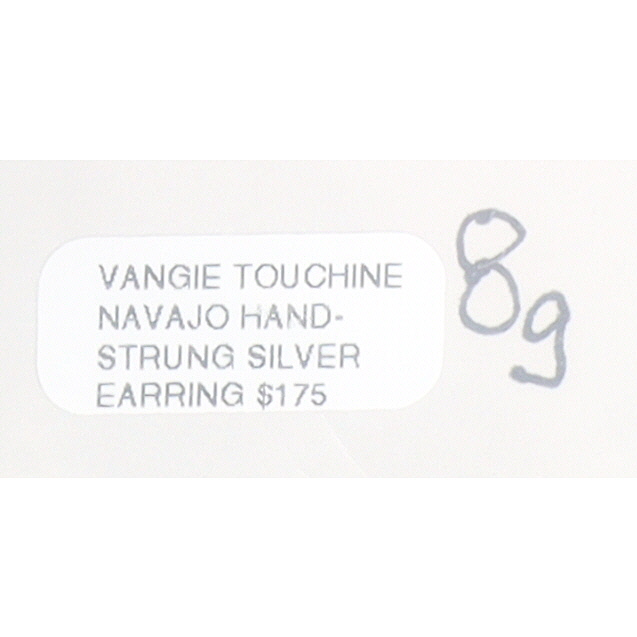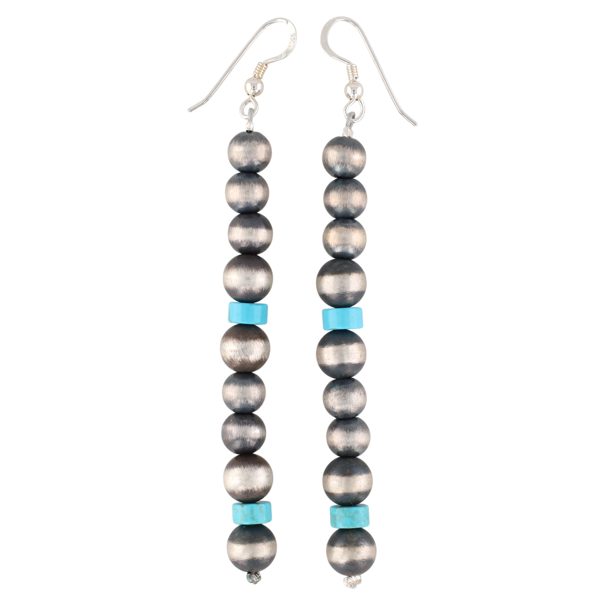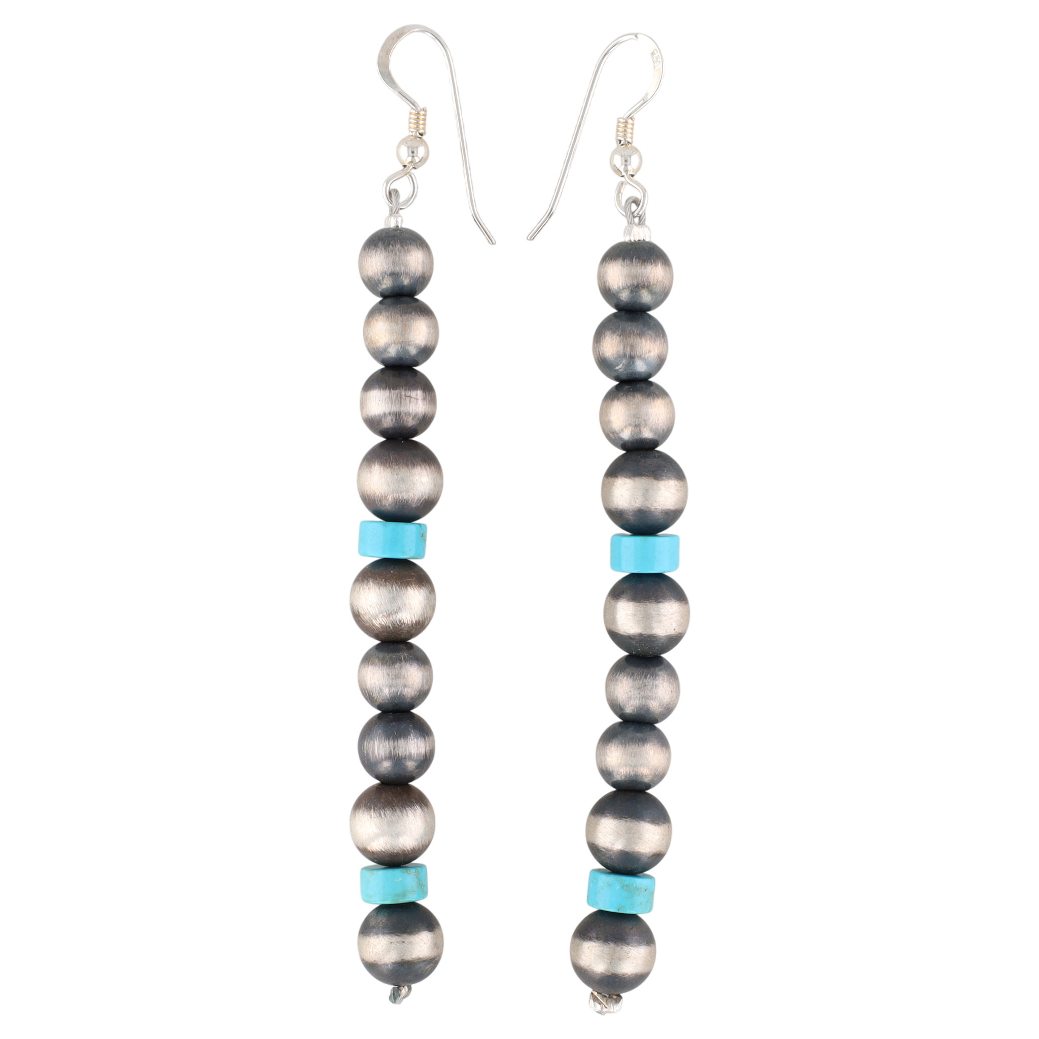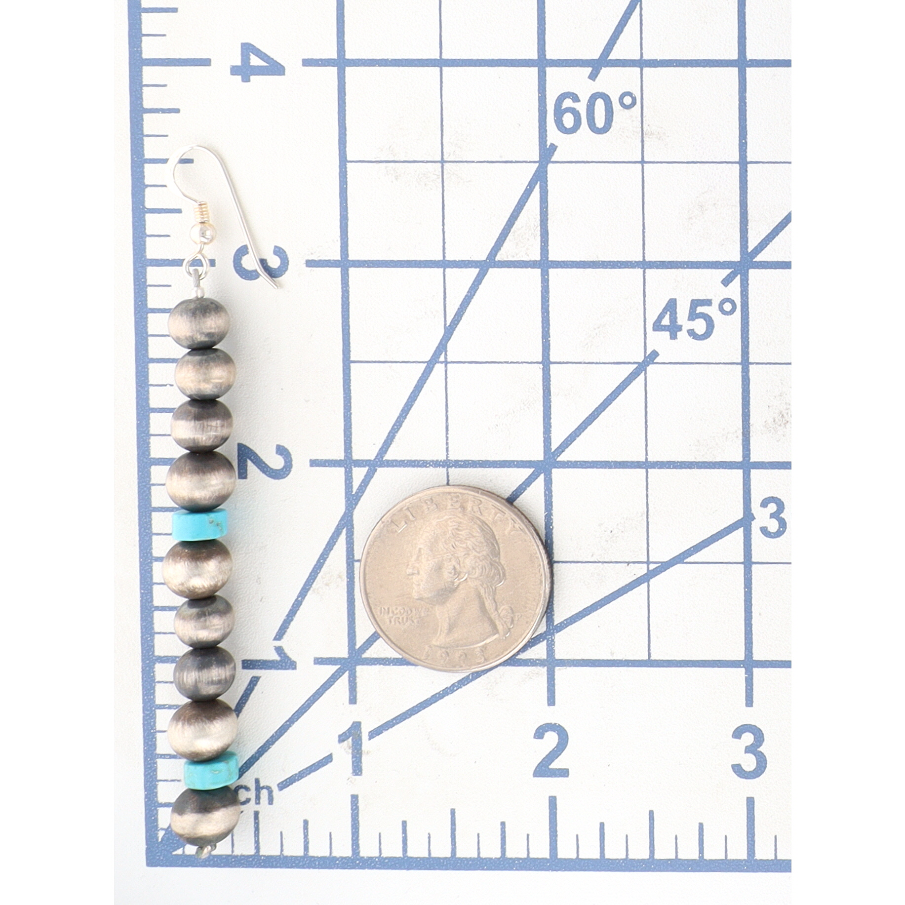 A pair of Vangie Touchine Navajo hand-strung silver pearl and turquoise dangle earrings, weighing 8g and measuring approximately 2.75 inches long.