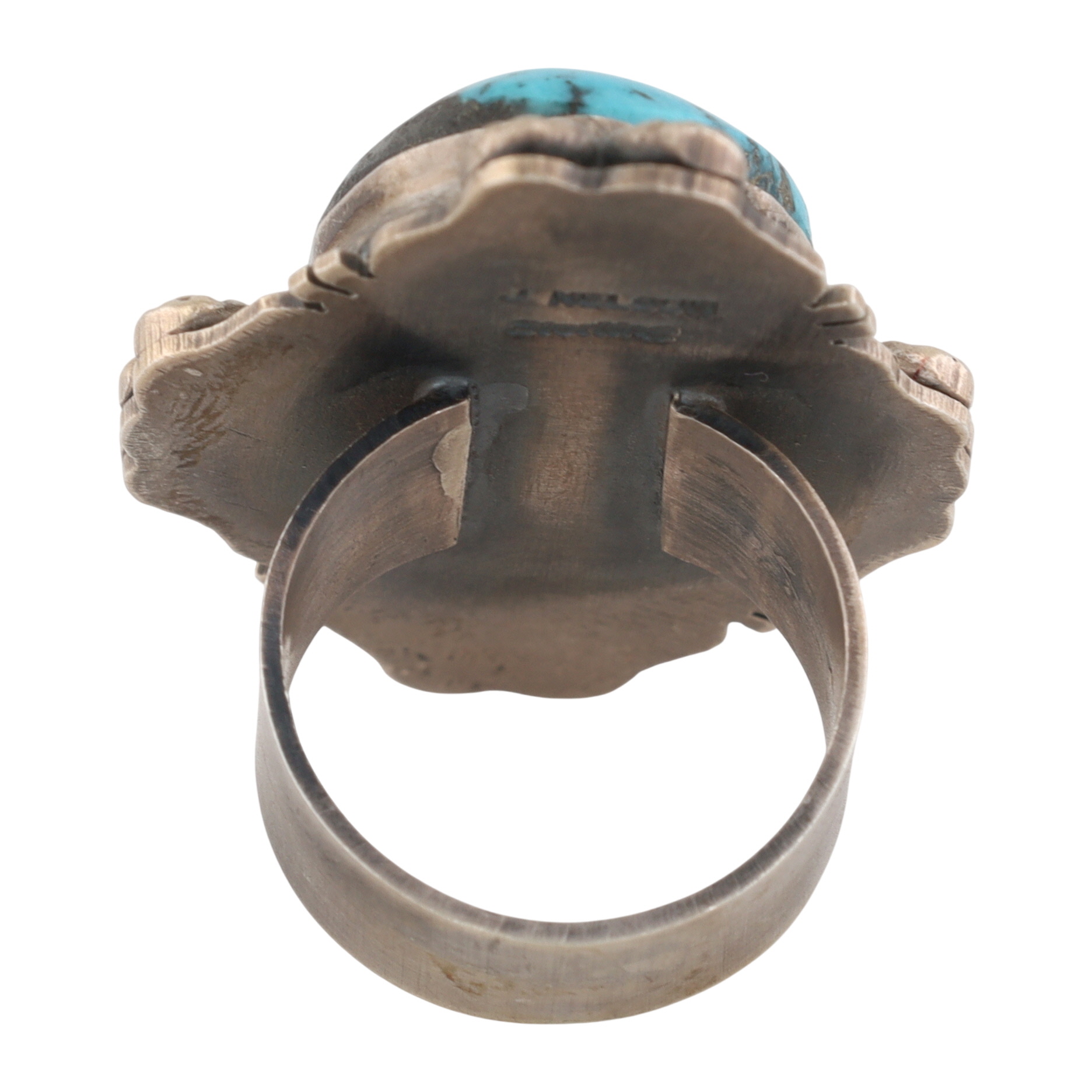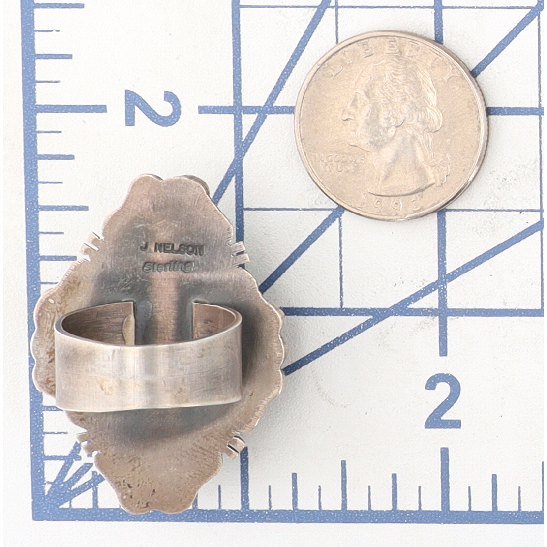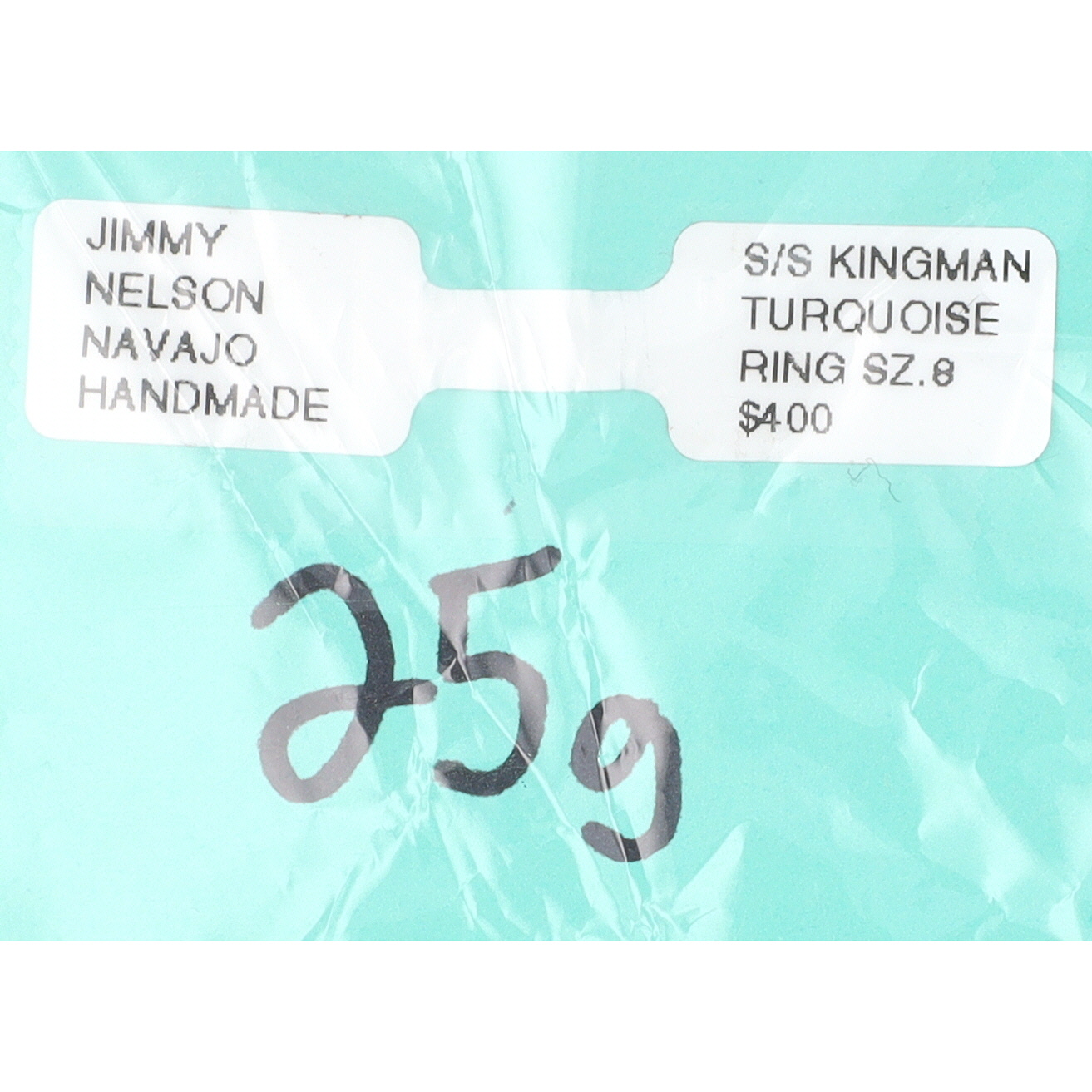 A handmade Jimmy Nelson Navajo sterling silver ring, size 8, 25g, featuring a large oval Kingman turquoise stone with dark matrix, marked “J NELSON Sterling”.
