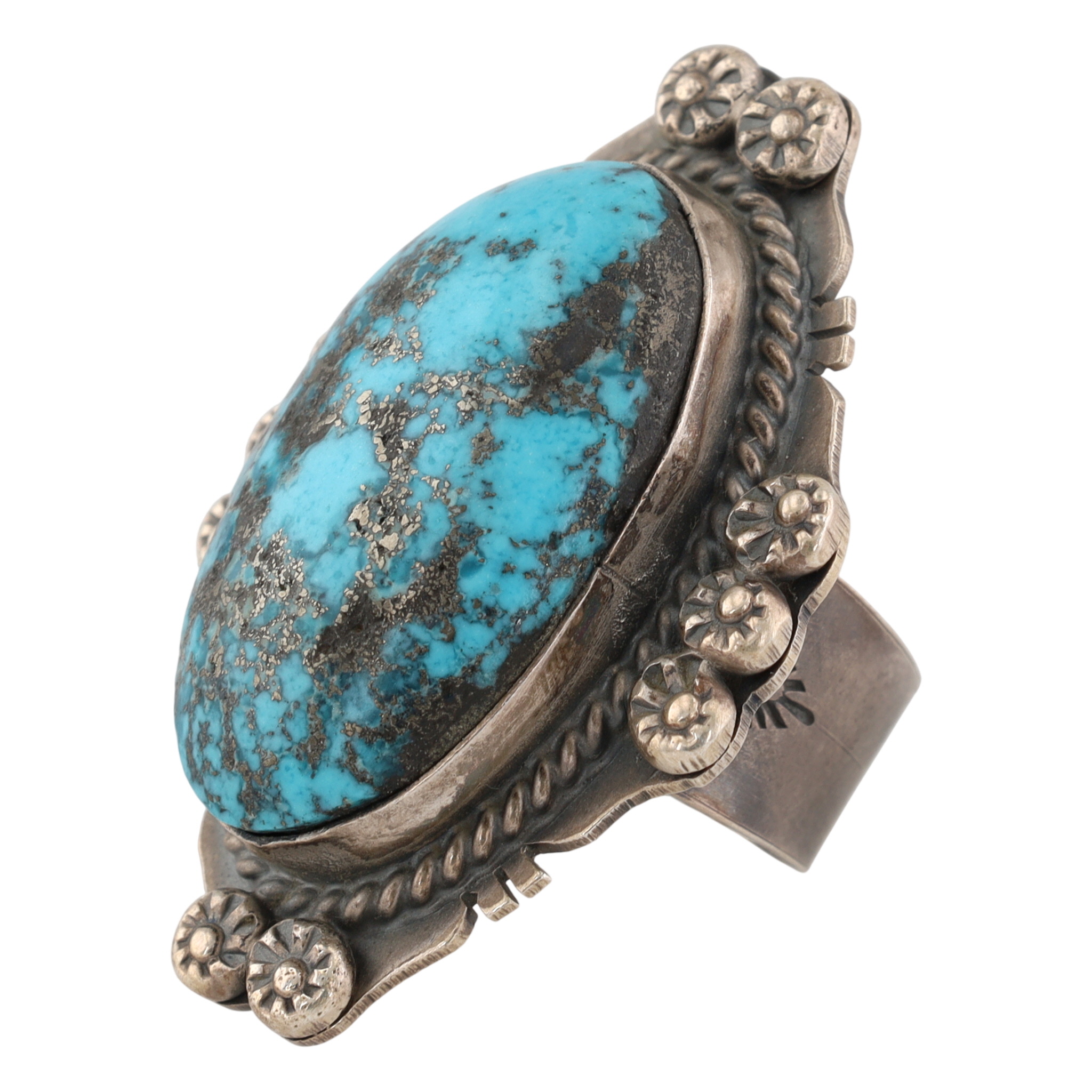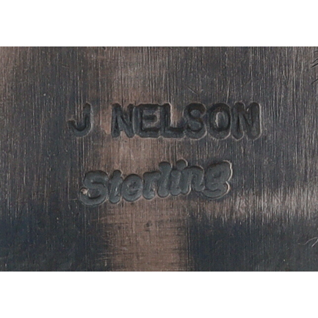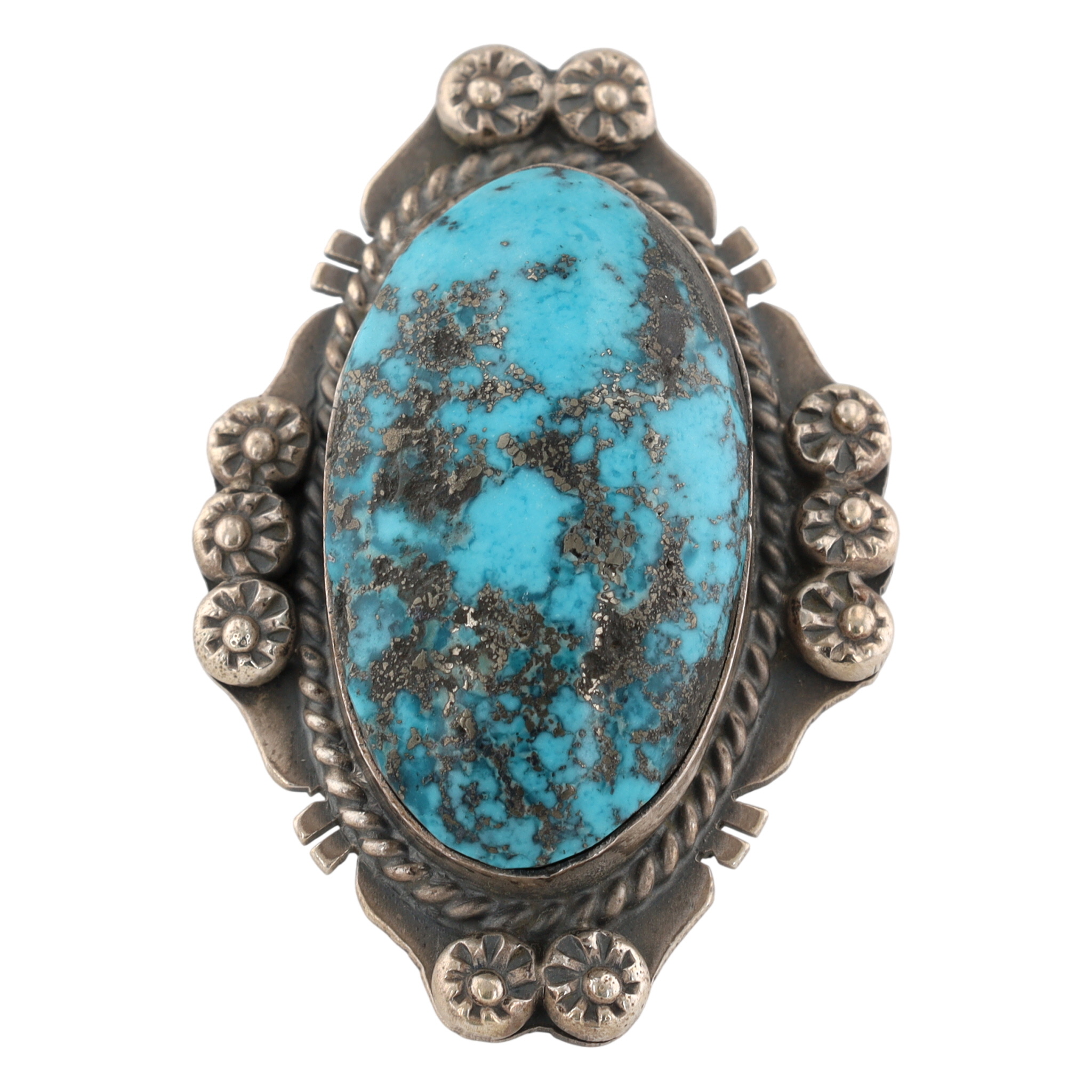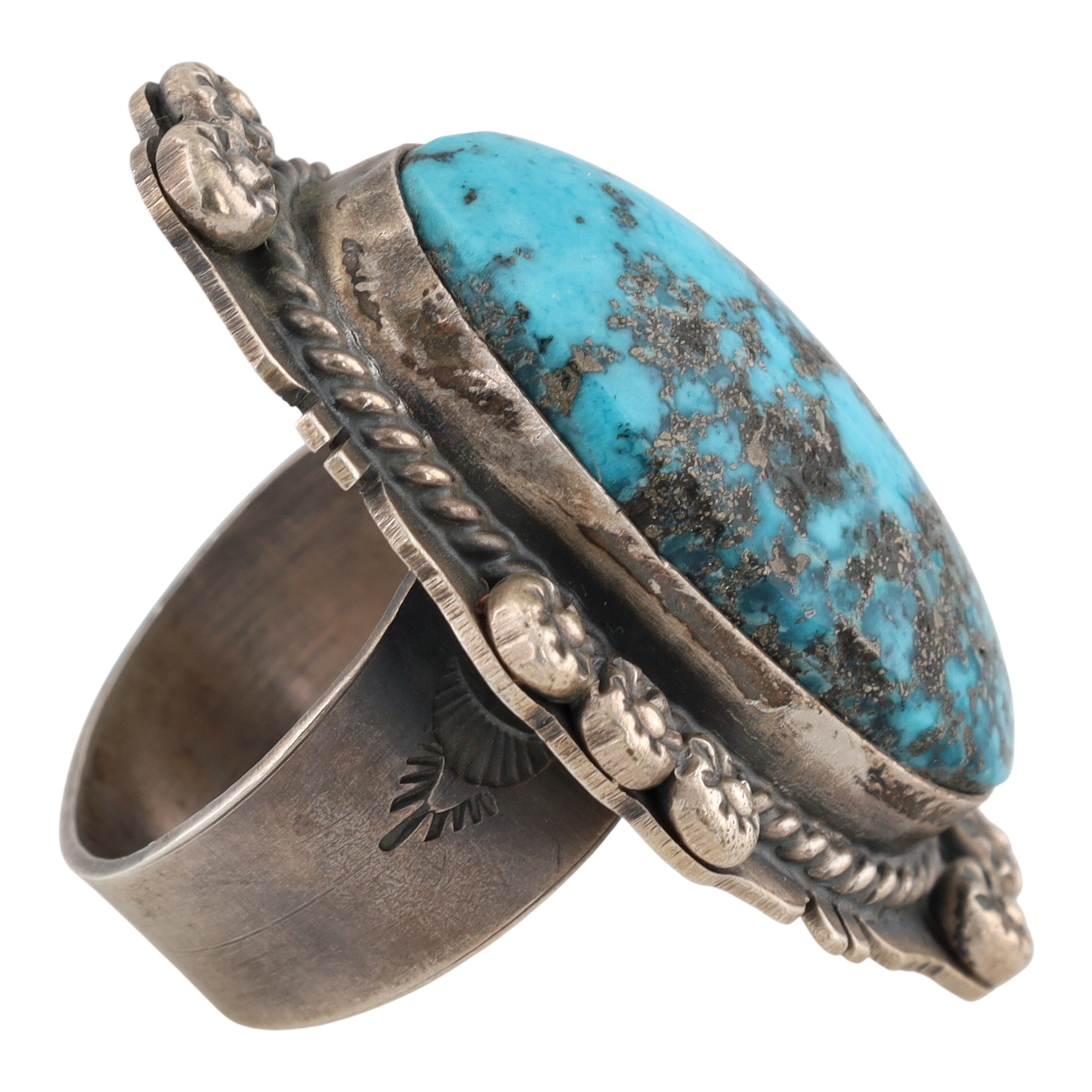 A handmade Jimmy Nelson Navajo sterling silver ring, size 8, 25g, featuring a large oval Kingman turquoise stone with dark matrix, marked “J NELSON Sterling”.