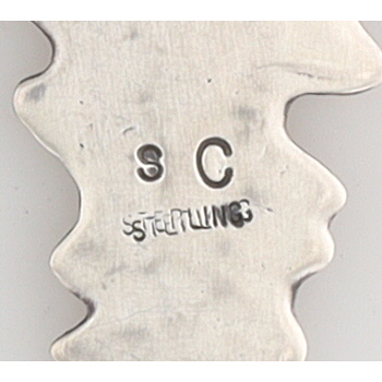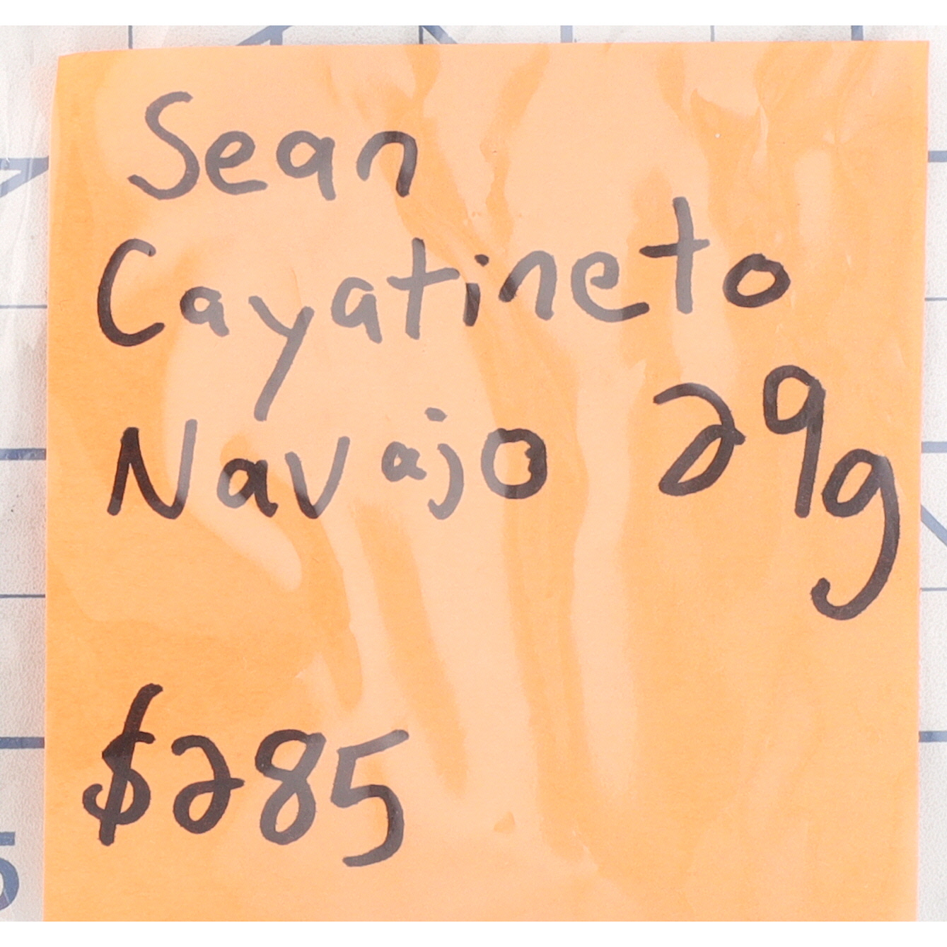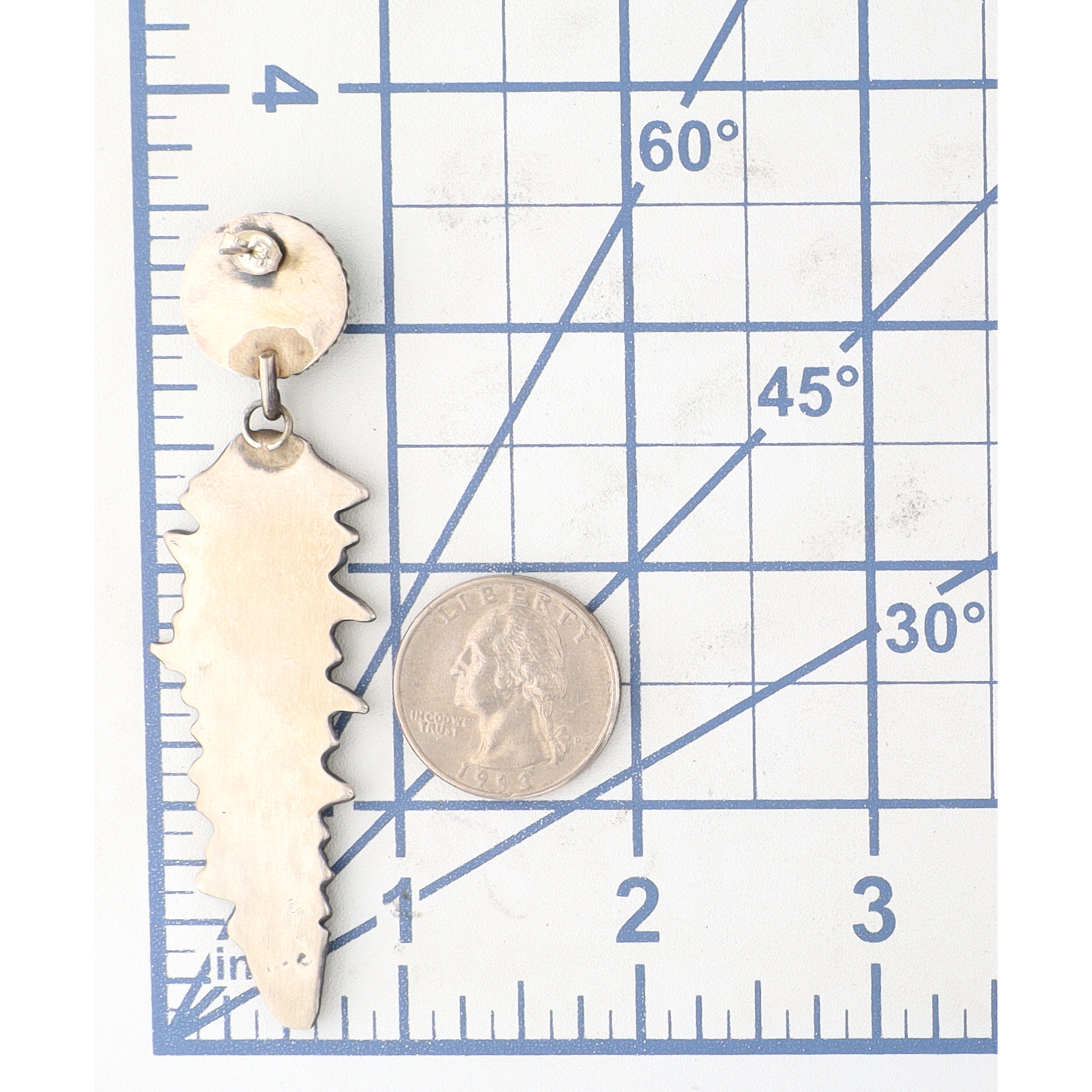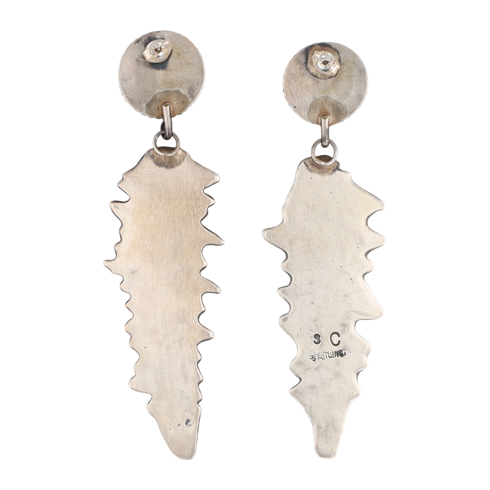 A pair of silver and turquoise earrings, identified as Sean Cayatineto Navajo, featuring feather designs and marked ‘S C’ and ‘STERLING’ on the back, measuring approximately 3 inches long, weighing 29g