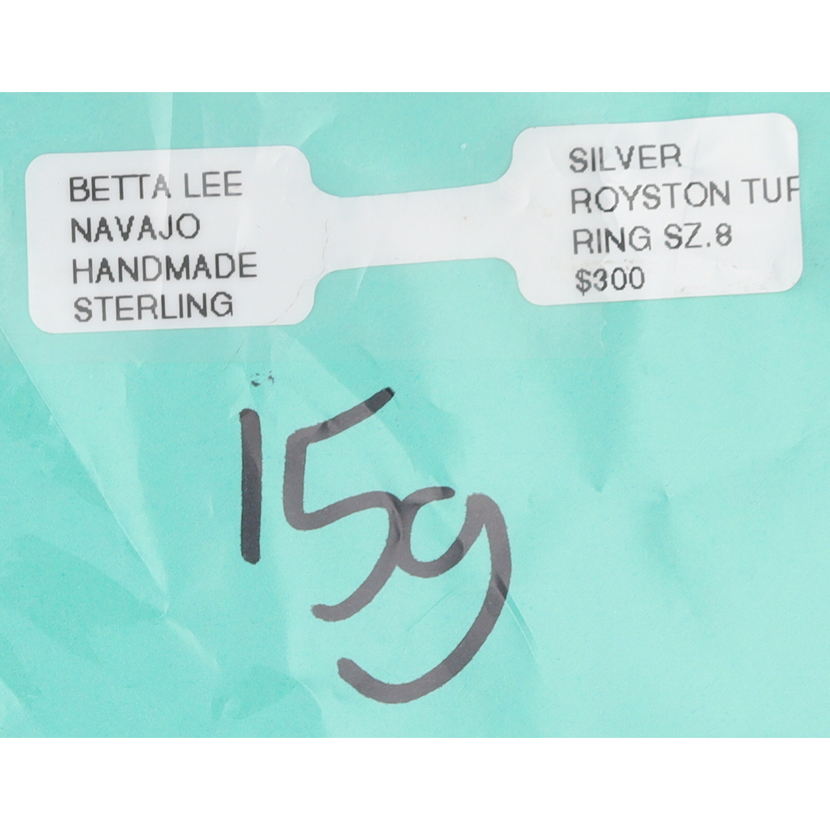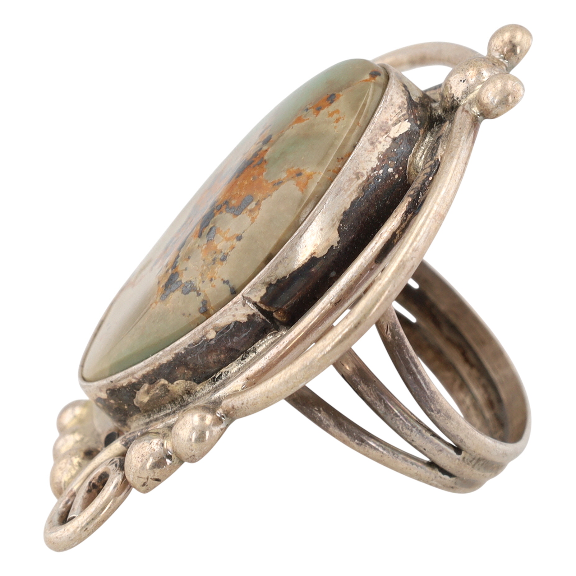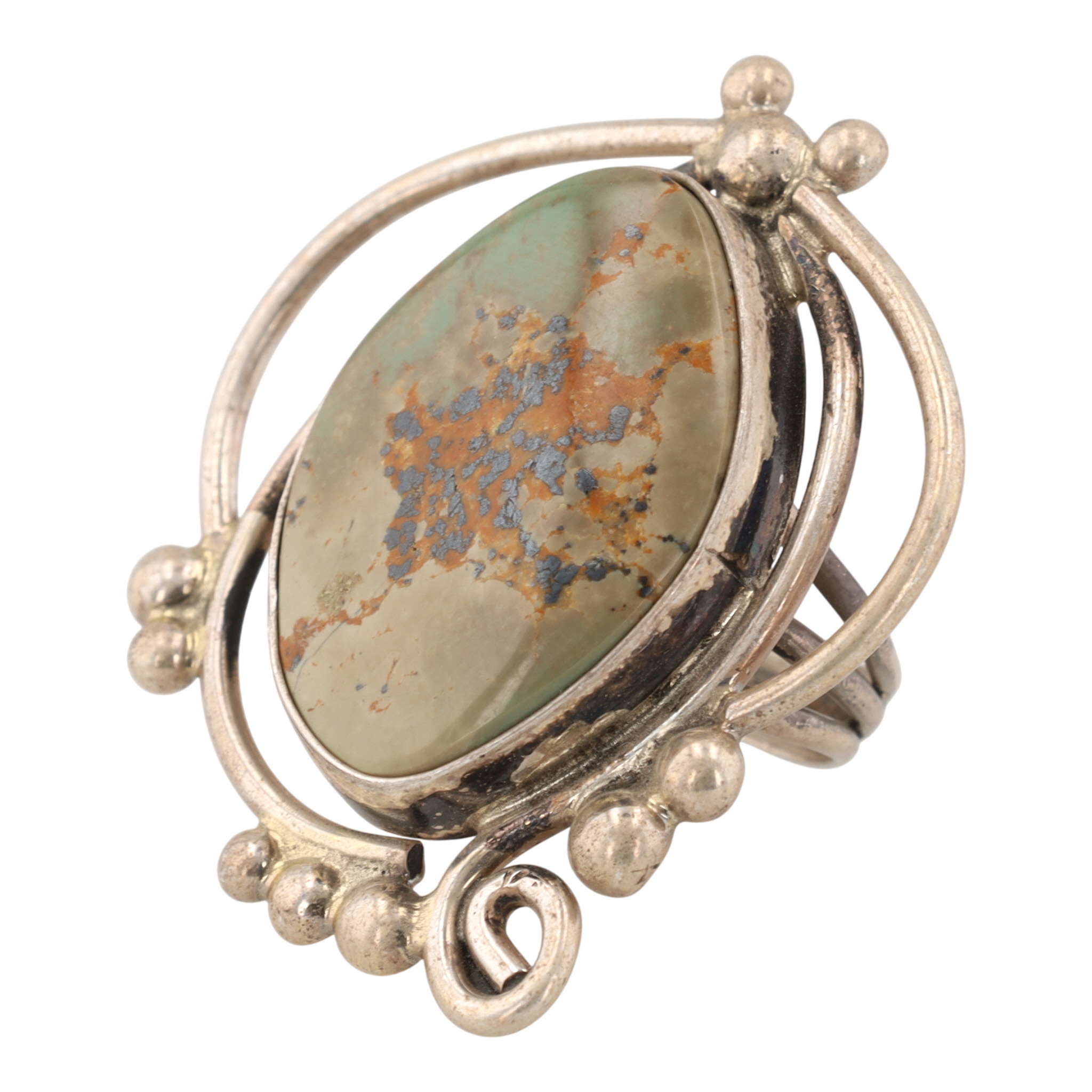 A Betta Lee Navajo handmade sterling silver ring, size 8, featuring an oval greenish-beige Royston turquoise stone with dark inclusions, weighing 15g.