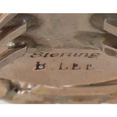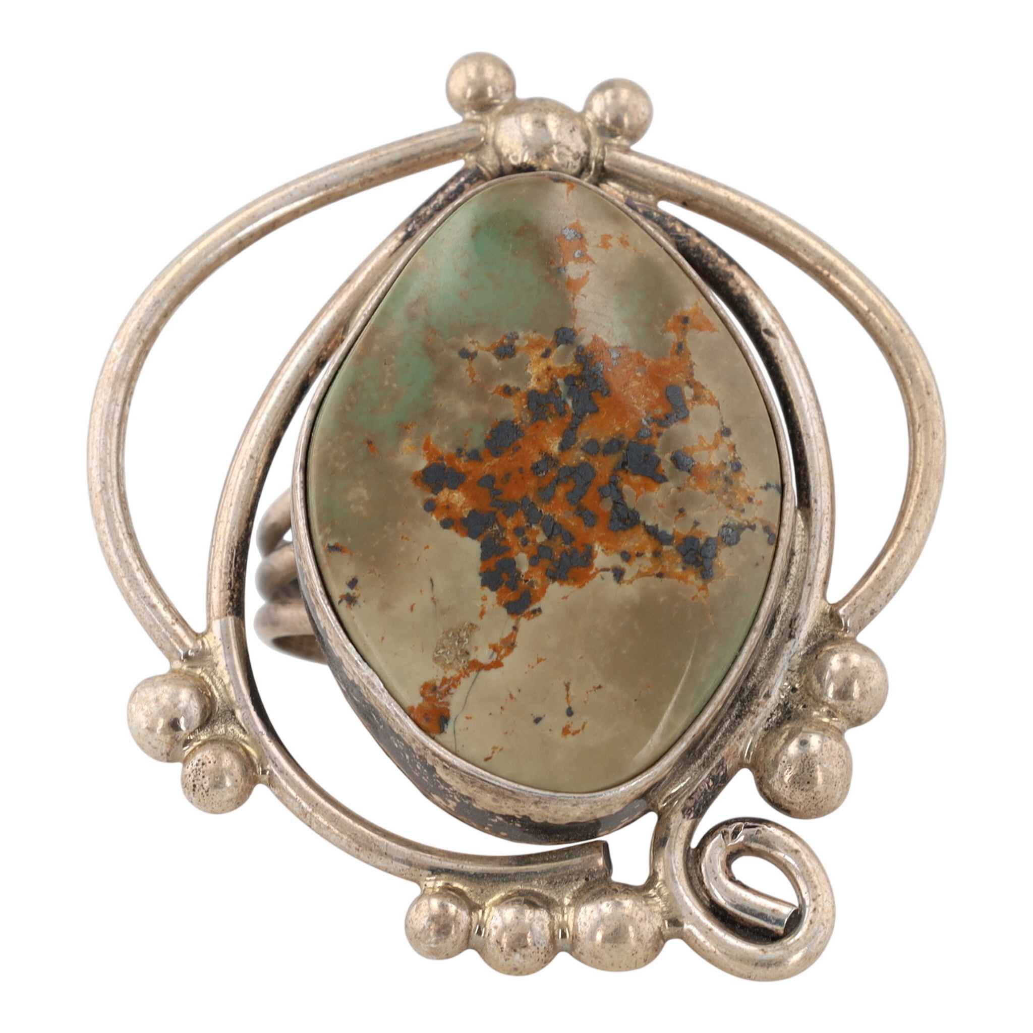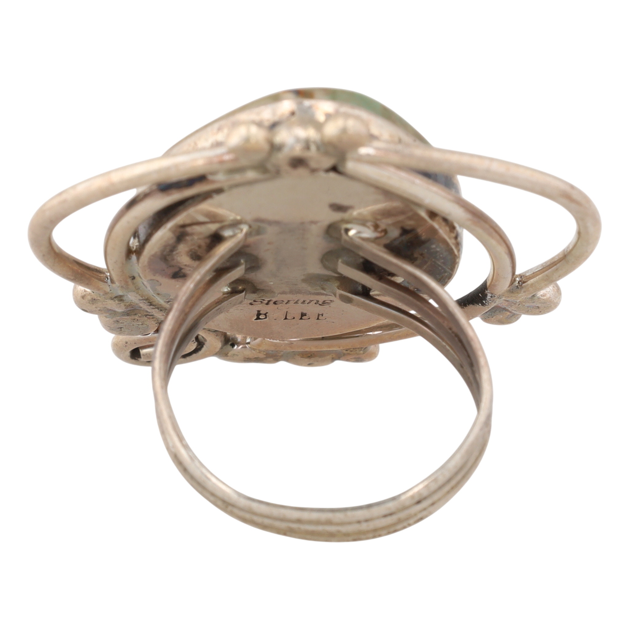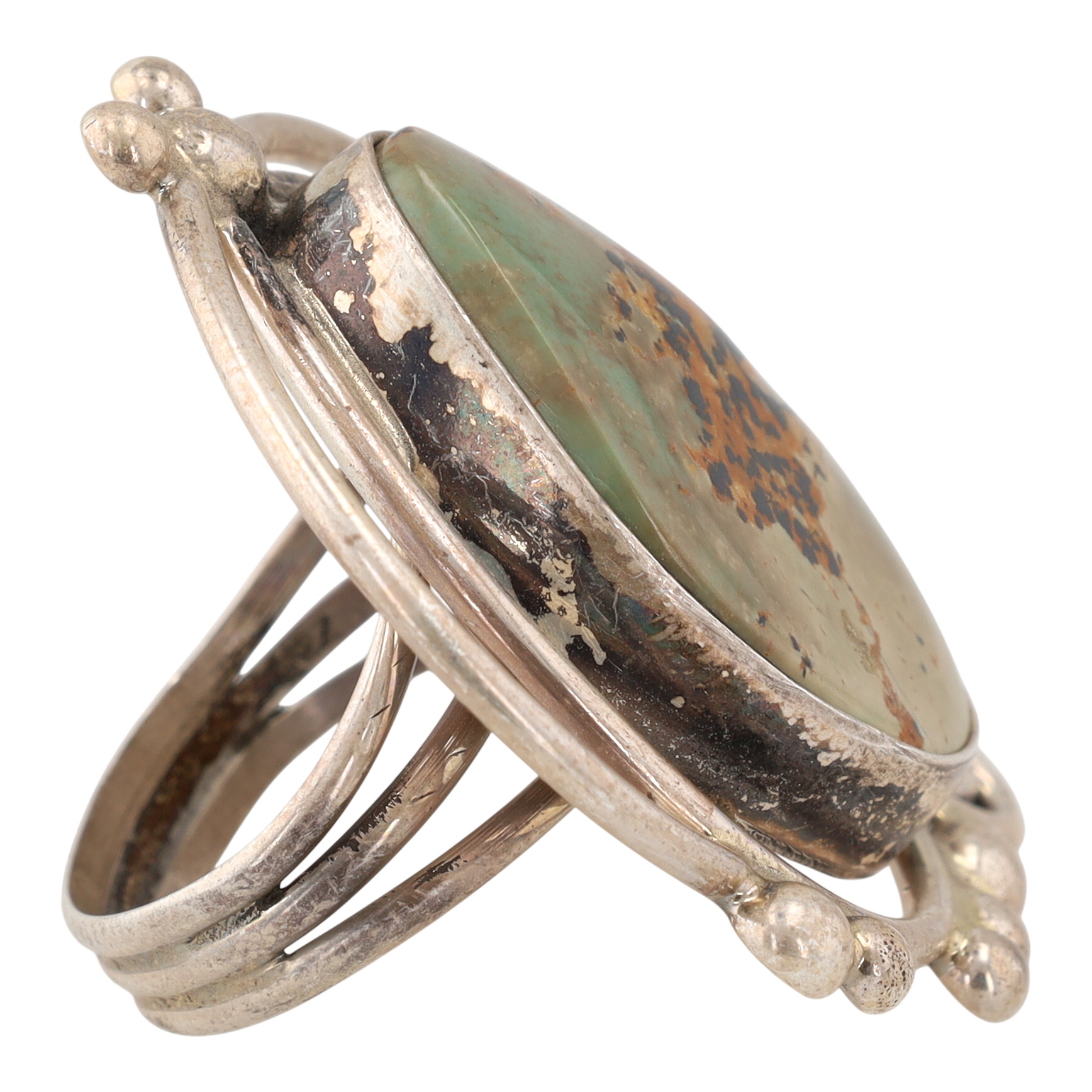A Betta Lee Navajo handmade sterling silver ring, size 8, featuring an oval greenish-beige Royston turquoise stone with dark inclusions, weighing 15g.