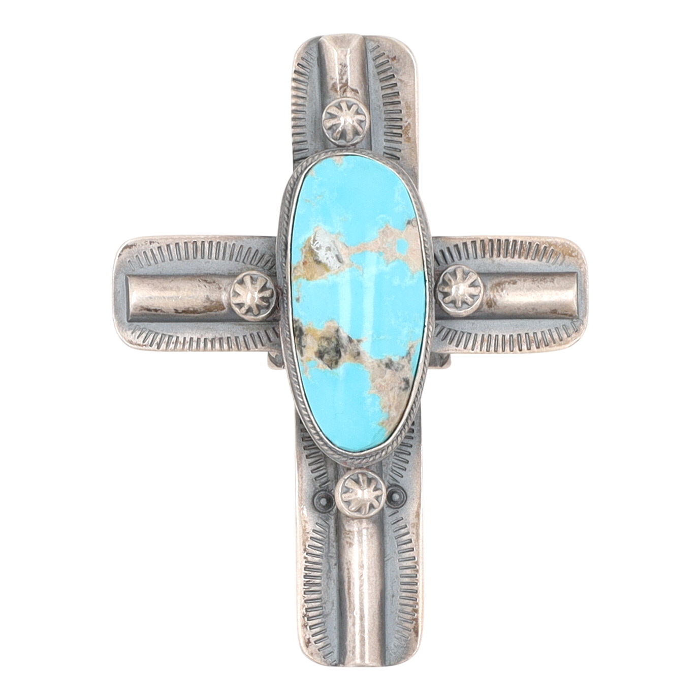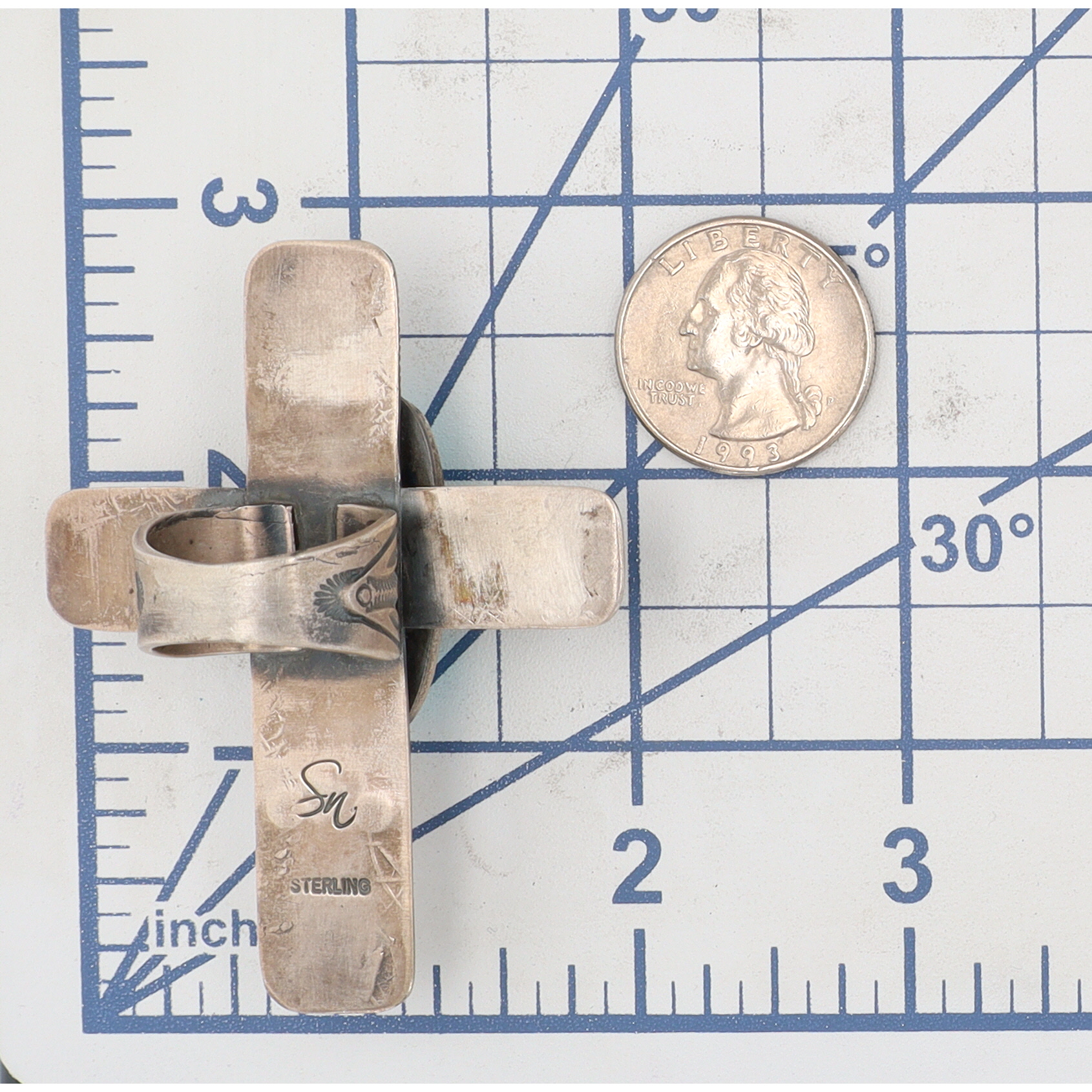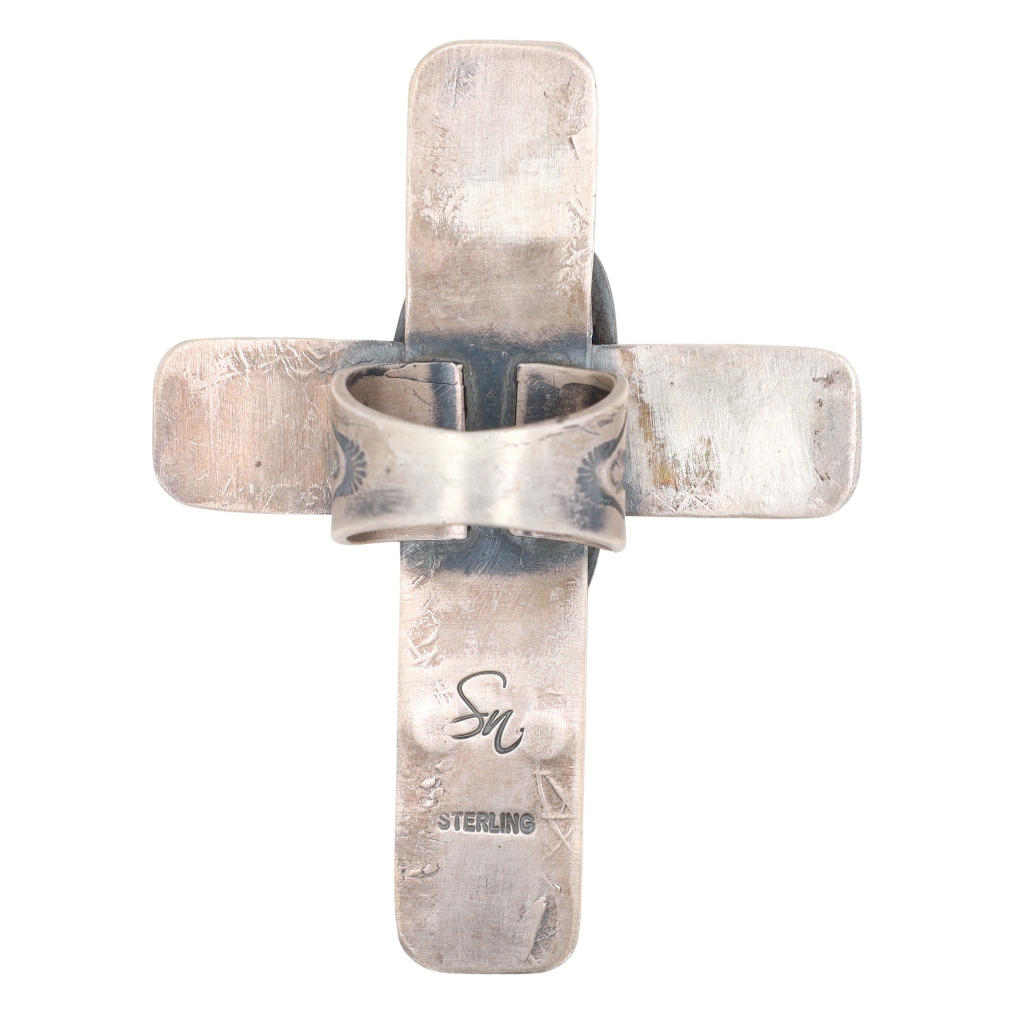 A Sandra Nez Navajo handmade sterling cross-shaped ring, size 8, featuring a central oval Kingman turquoise stone, marked ‘SN’ and ‘STERLING’, weighing 42g, and measuring approximately 2.5 inches long.