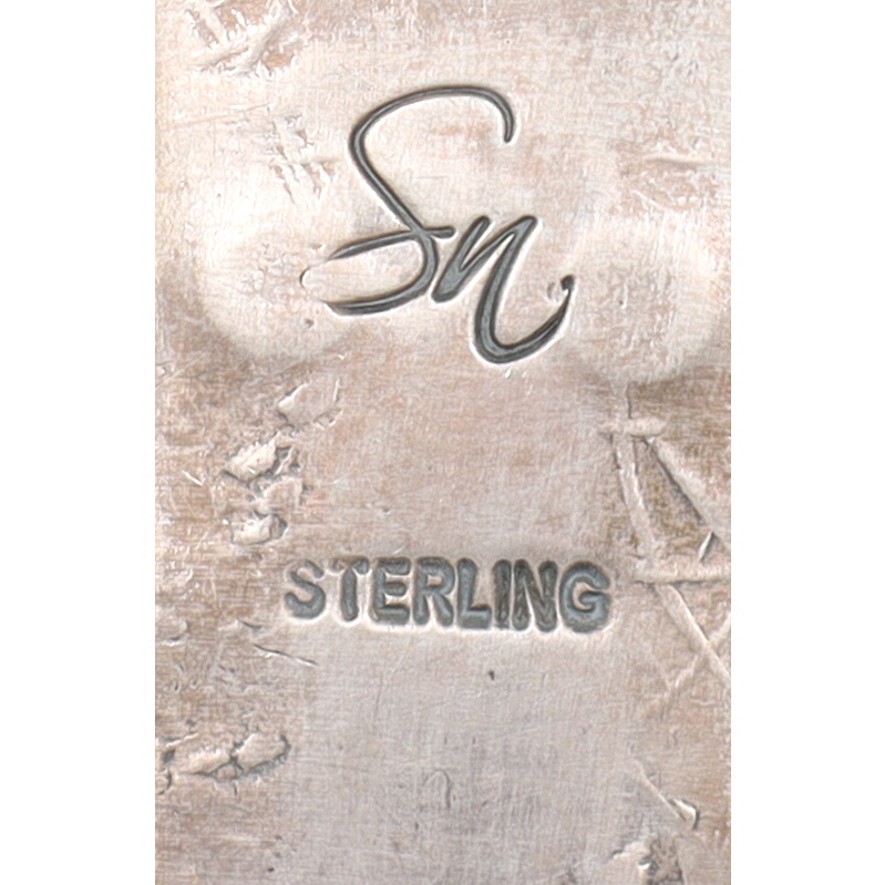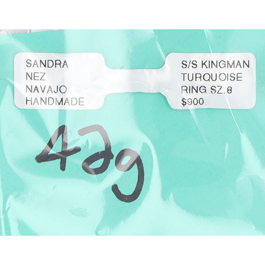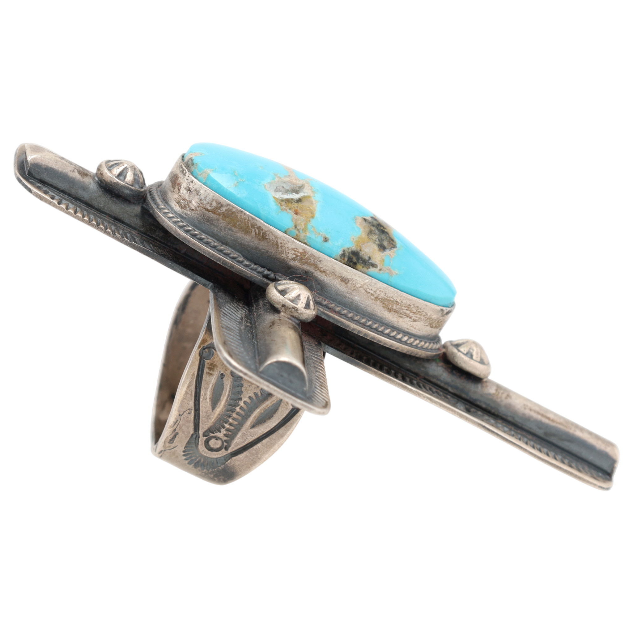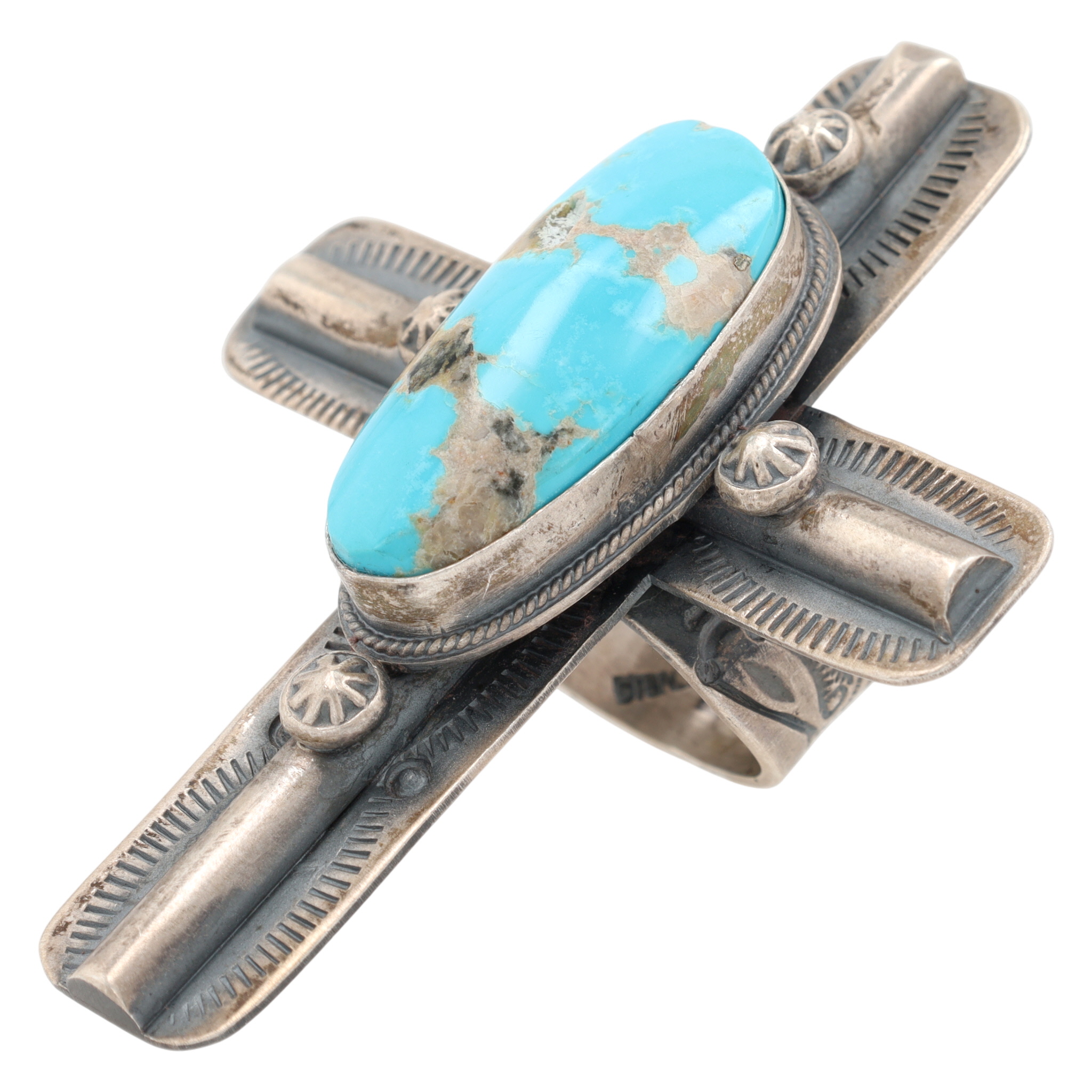 A Sandra Nez Navajo handmade sterling cross-shaped ring, size 8, featuring a central oval Kingman turquoise stone, marked ‘SN’ and ‘STERLING’, weighing 42g, and measuring approximately 2.5 inches long.