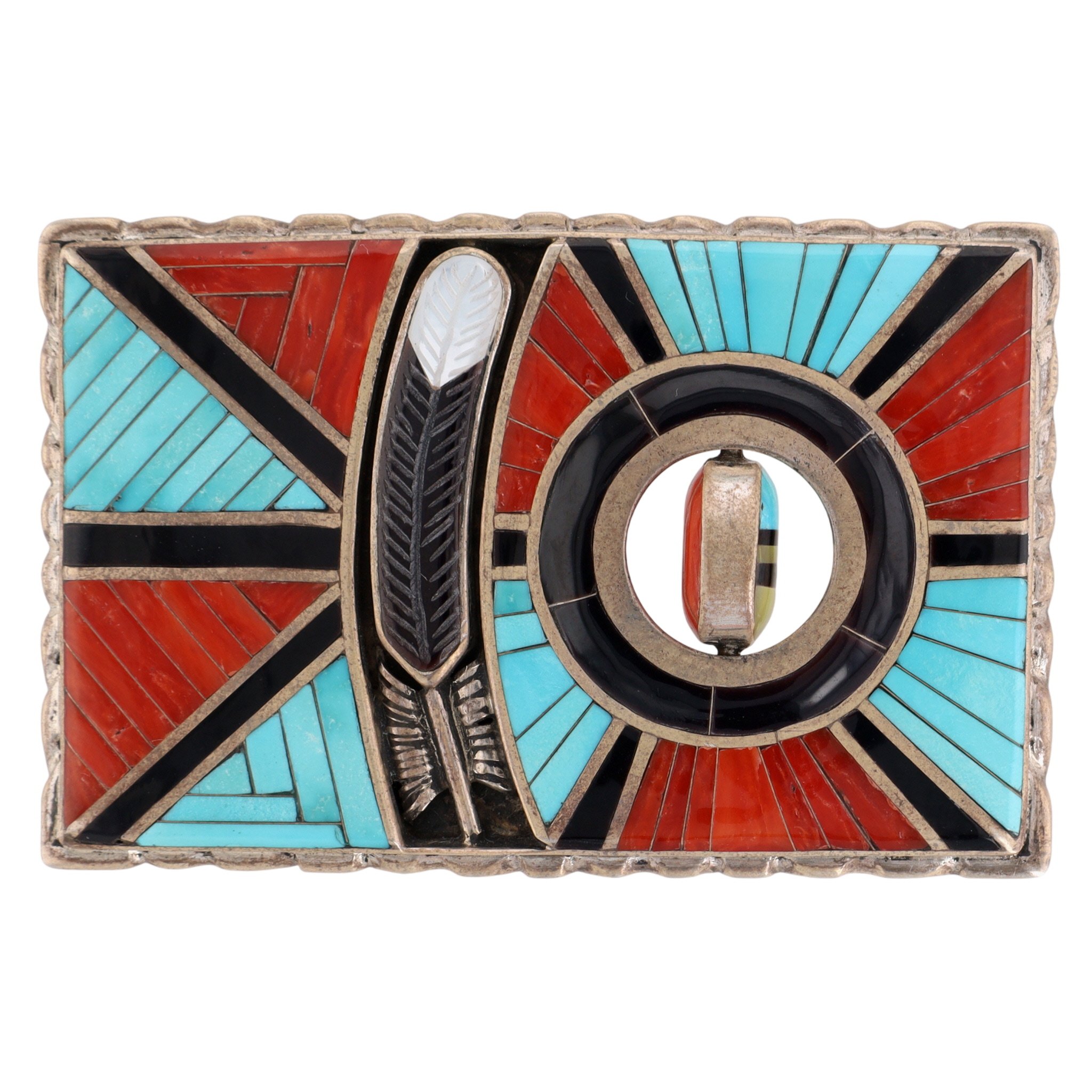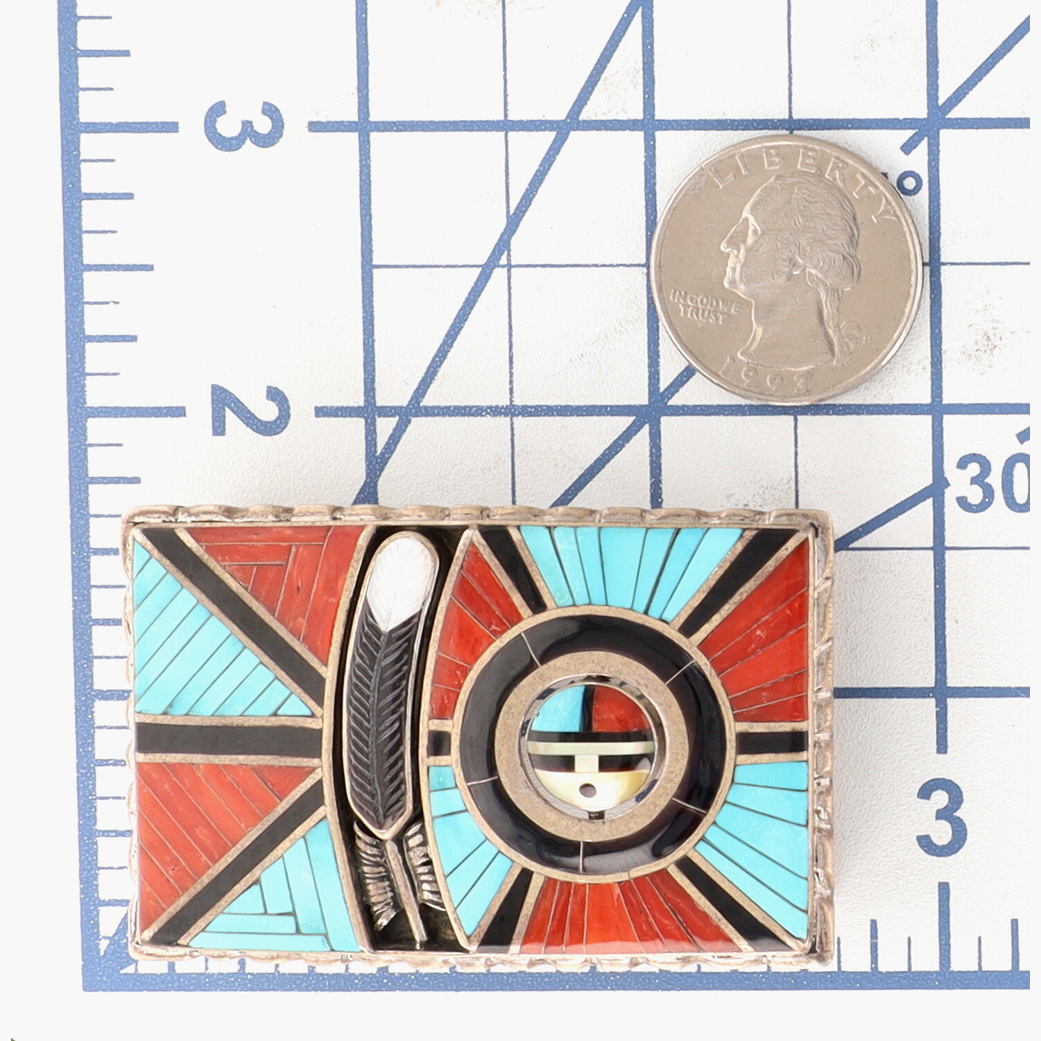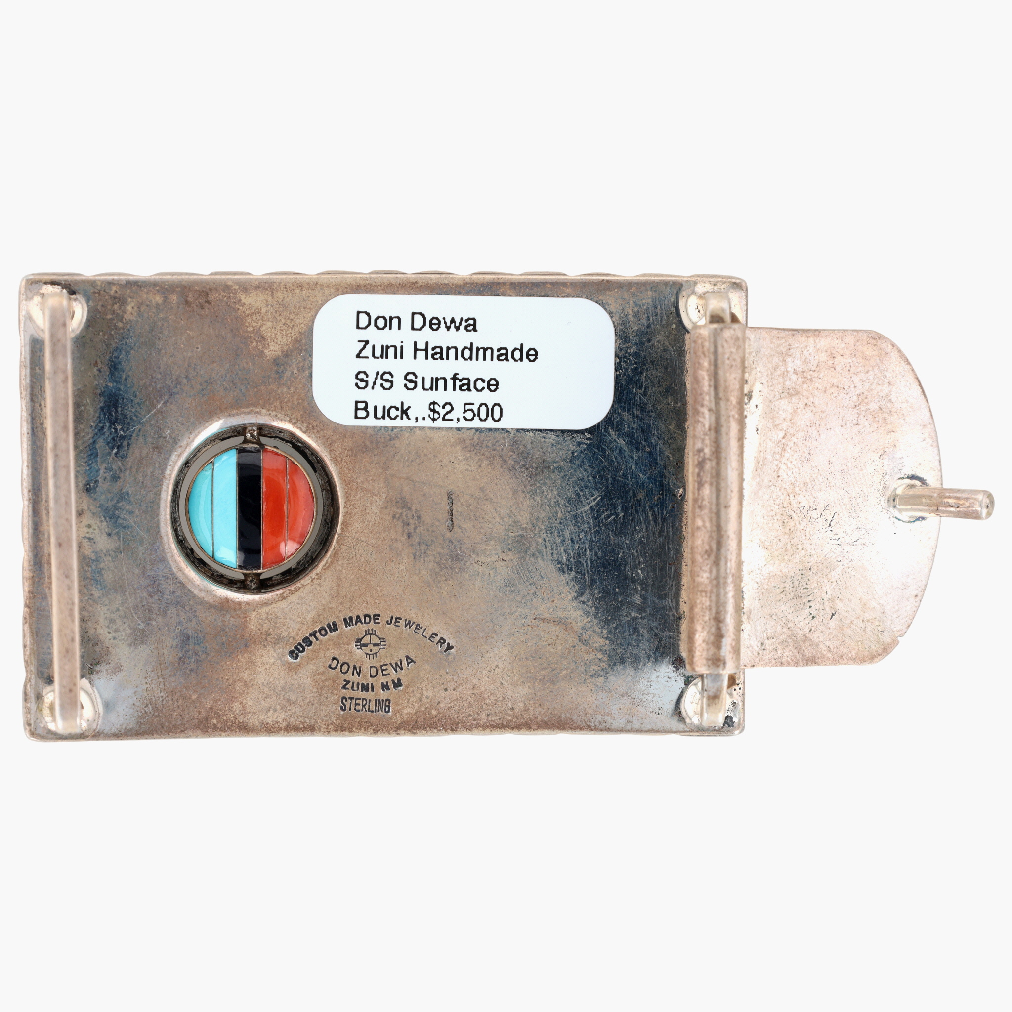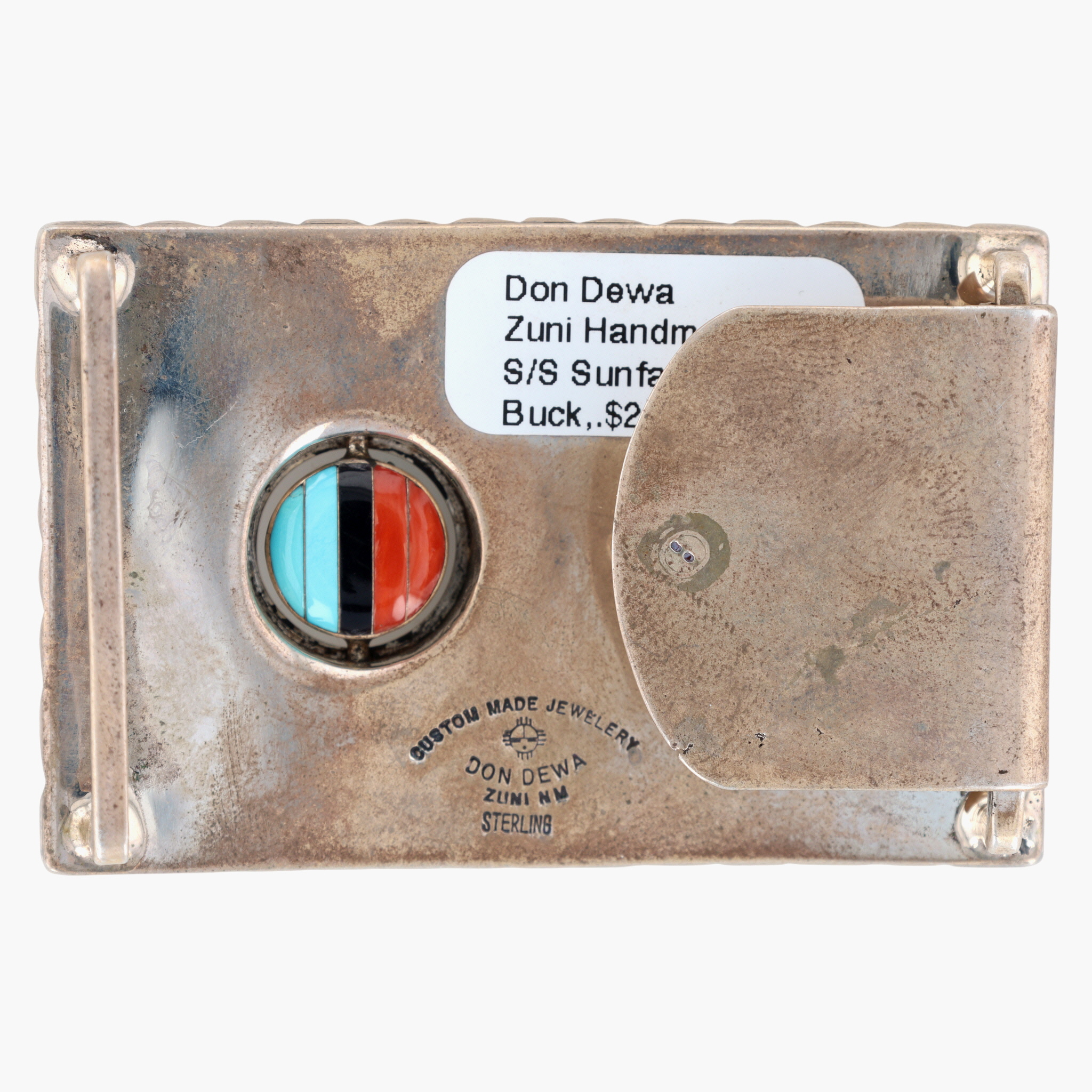 A rectangular sterling silver Zuni handmade belt buckle by Don Dewa, featuring a spinning coral, turquoise, onyx, jet, mother-of-pearl inlay in a Sunface and feather design, measuring approximately 2.75 x 1.75 inches and weighing 56.5 grams.