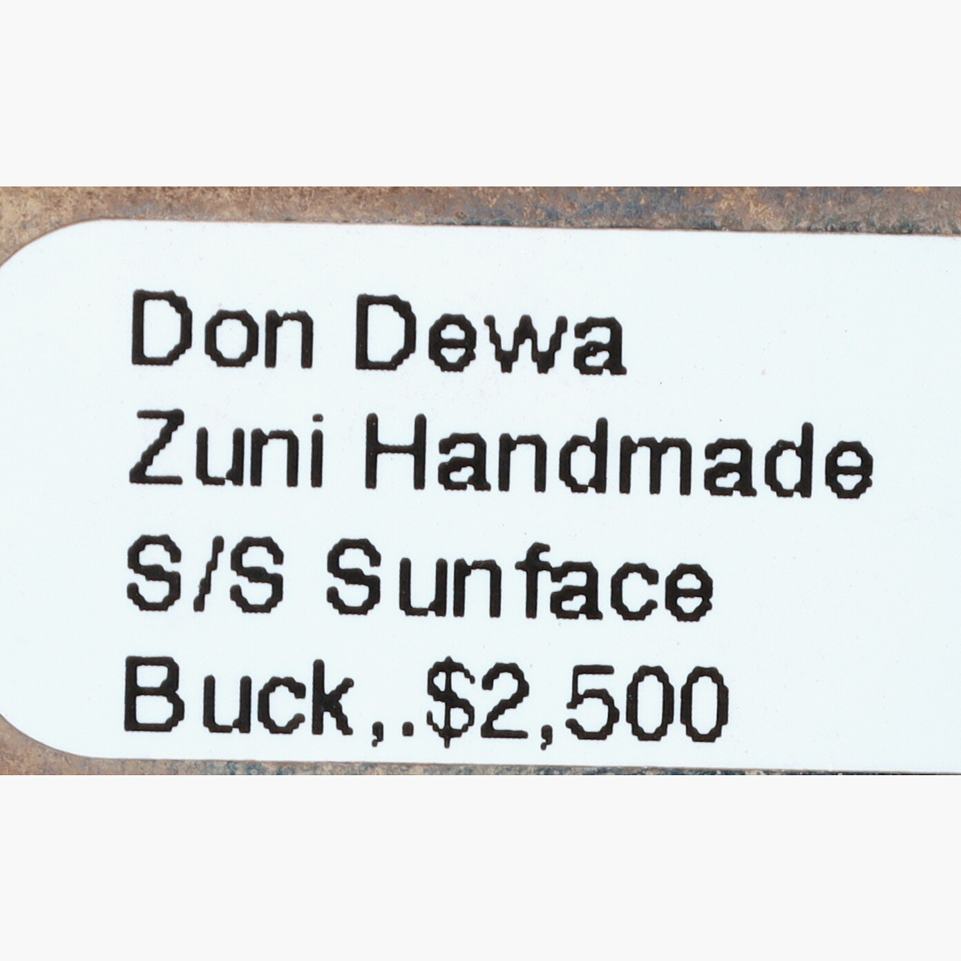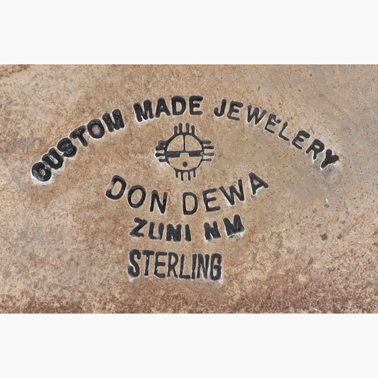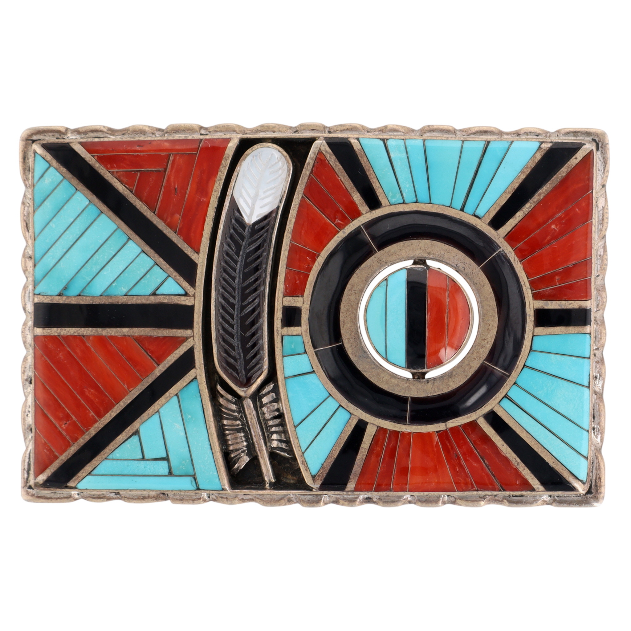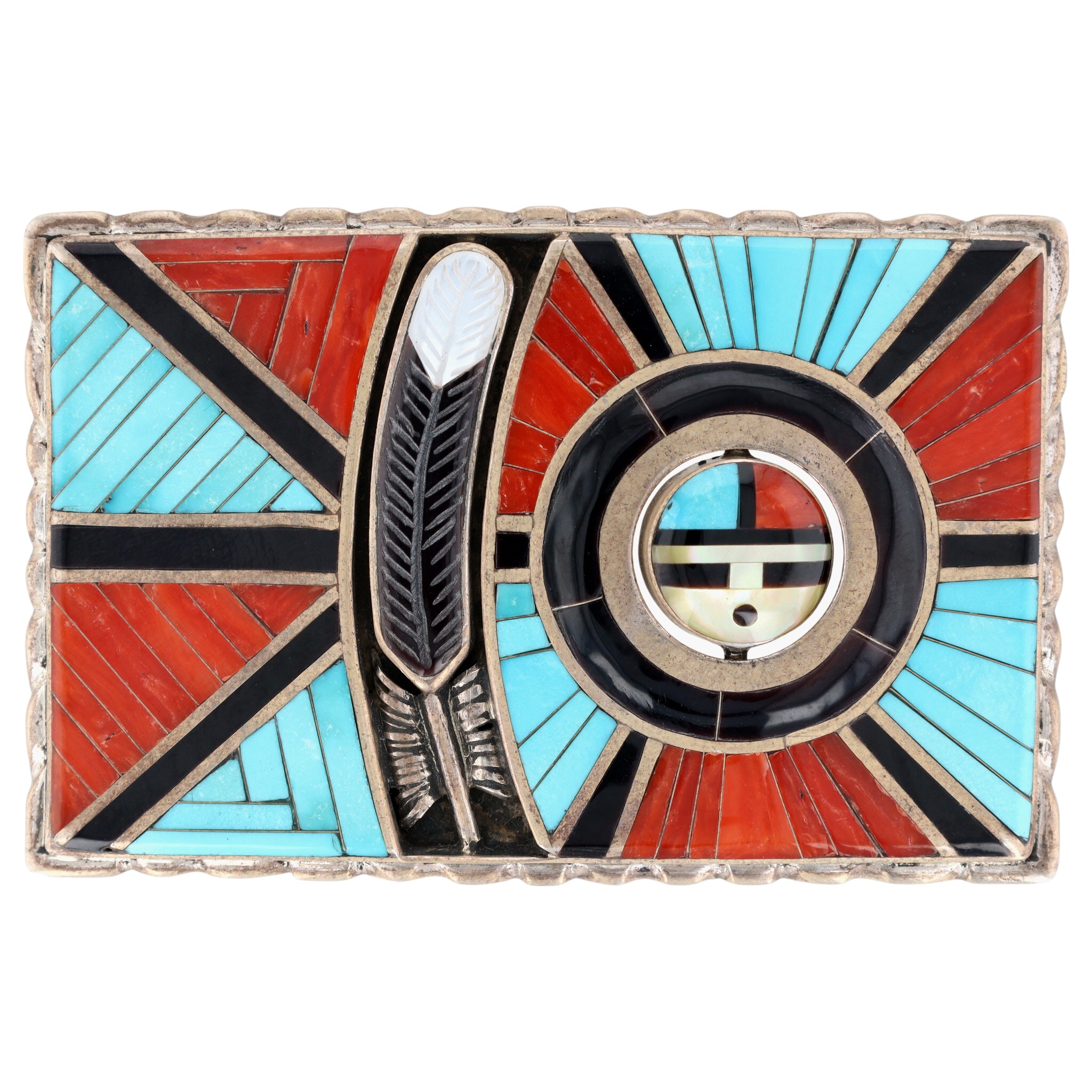 A rectangular sterling silver Zuni handmade belt buckle by Don Dewa, featuring a spinning coral, turquoise, onyx, jet, mother-of-pearl inlay in a Sunface and feather design, measuring approximately 2.75 x 1.75 inches and weighing 56.5 grams.