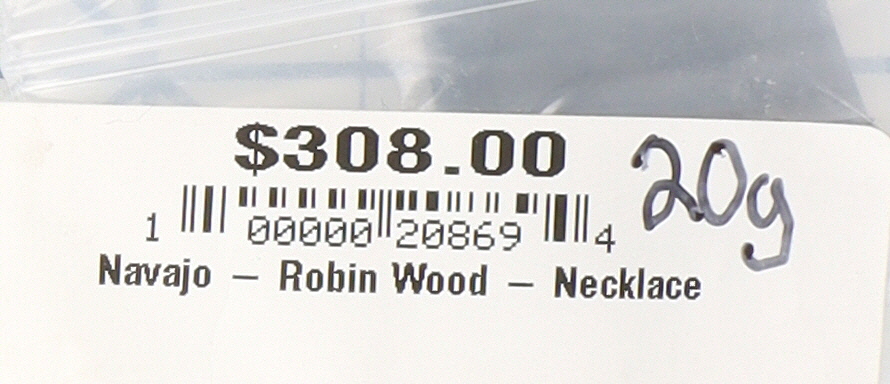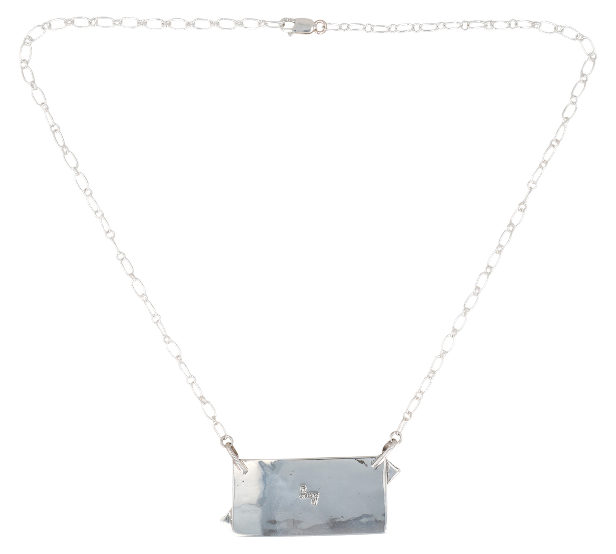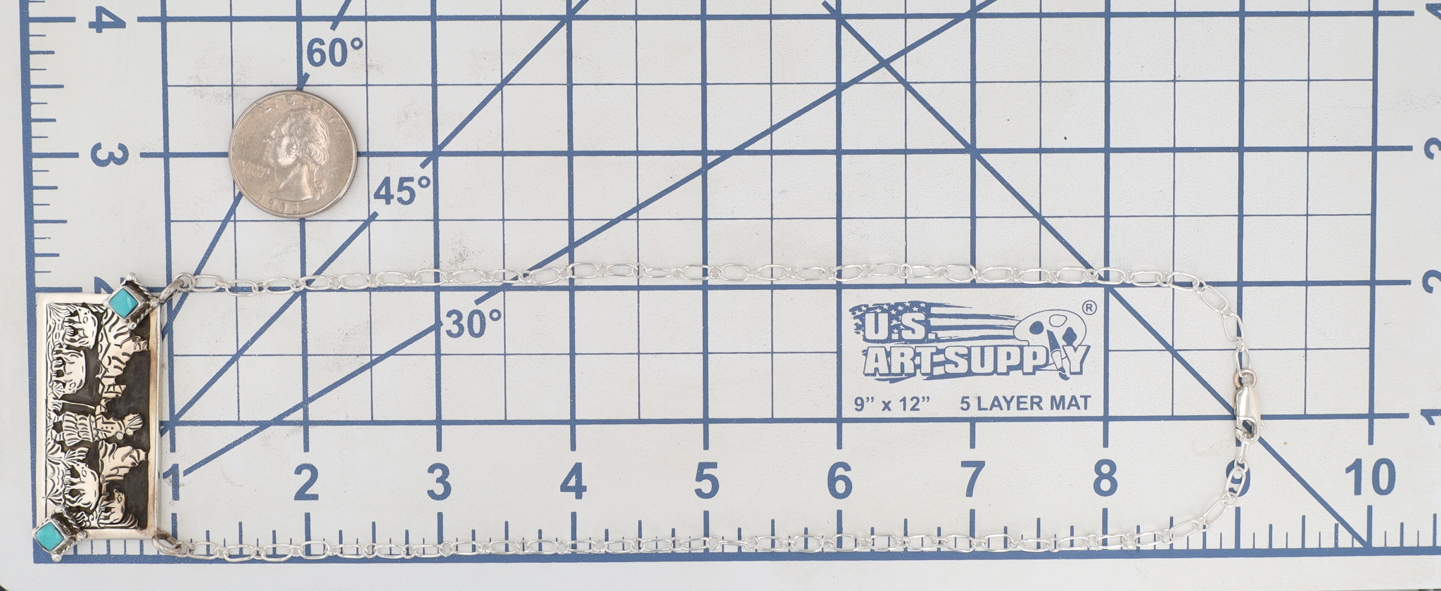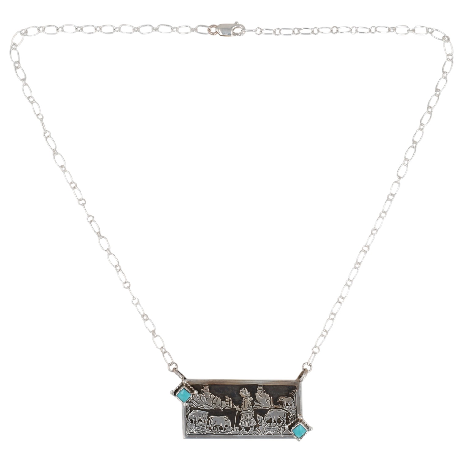 A Navajo Robin Wood sterling silver and black rectangular storyteller necklace, weighing 20g, features two turquoise stones and an etched scene, with a ‘R Sterling W’ maker’s mark.