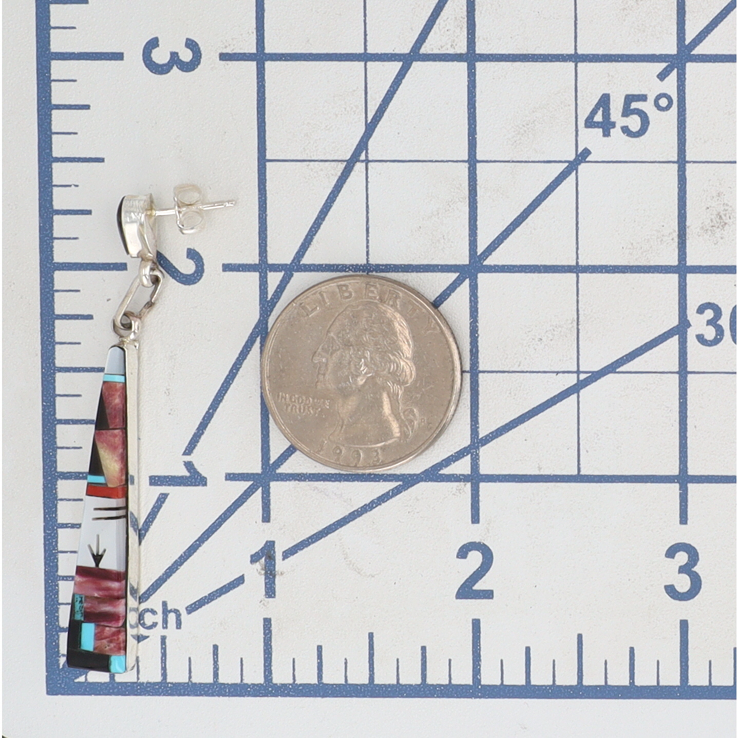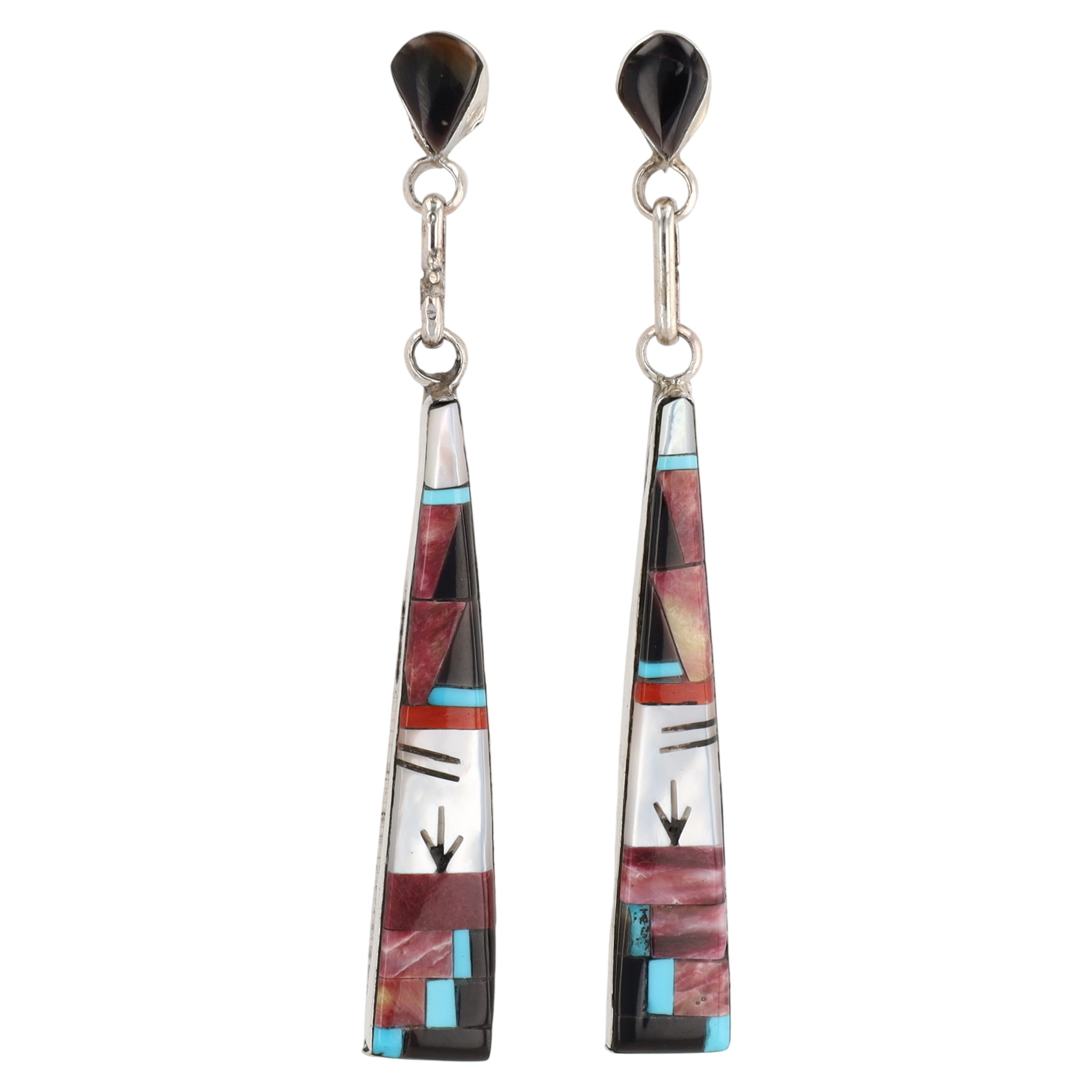 A pair of Jason Bobelu Zuni handmade sterling silver drop earrings with multi-stone inlay in onyx, mother of pearl, coral, purple spiny oyster, and turquoise measuring approximately 2.5 inches long, weighing 6g.