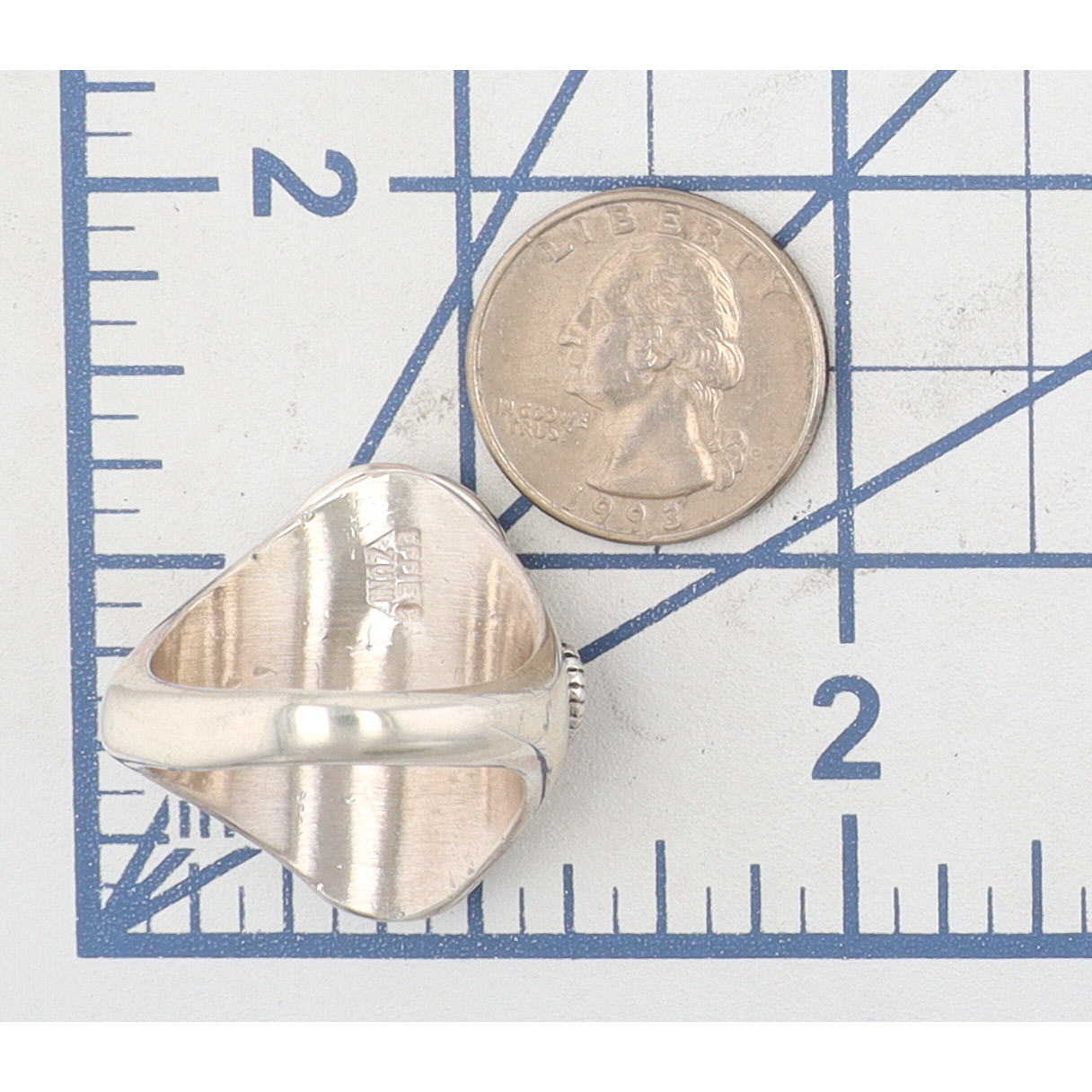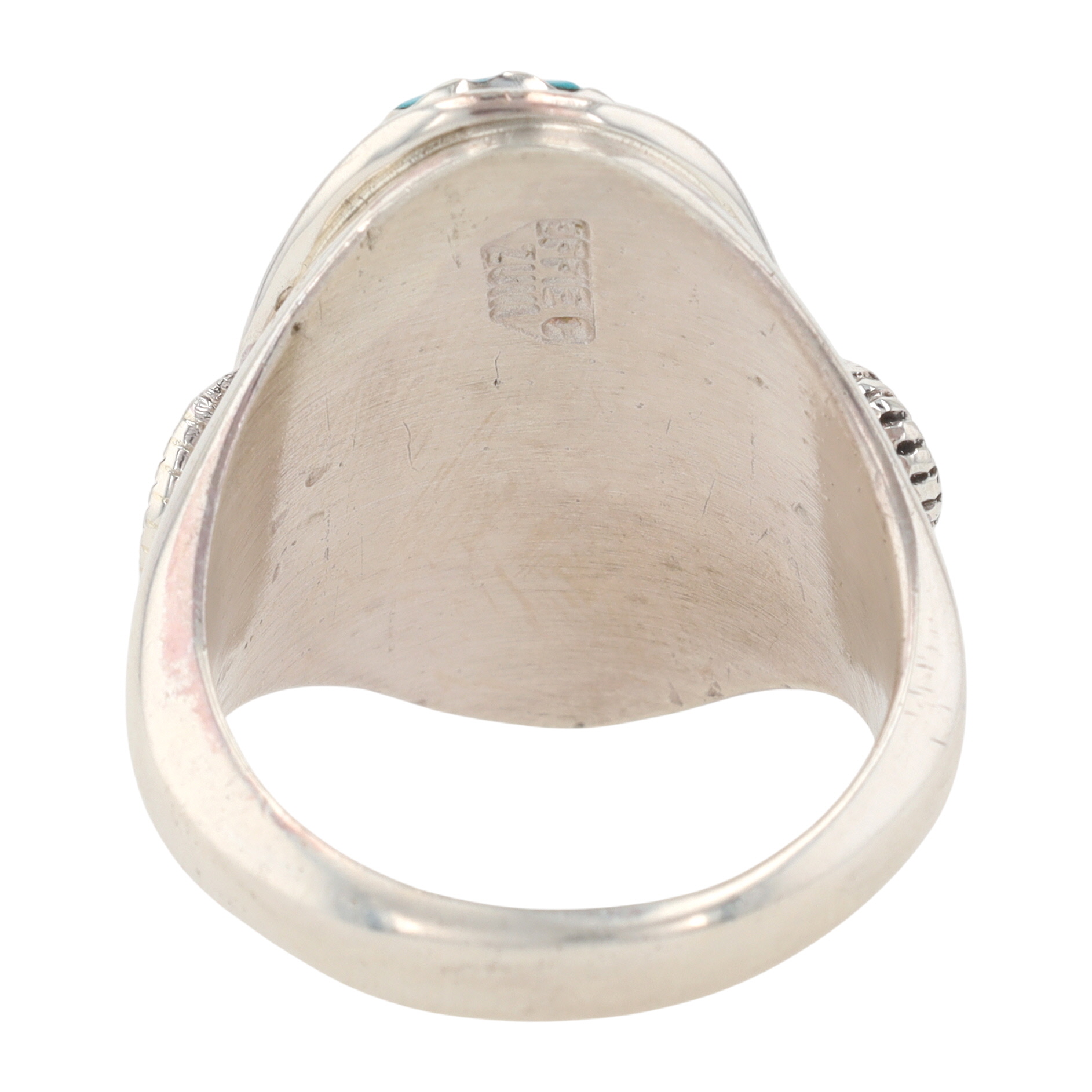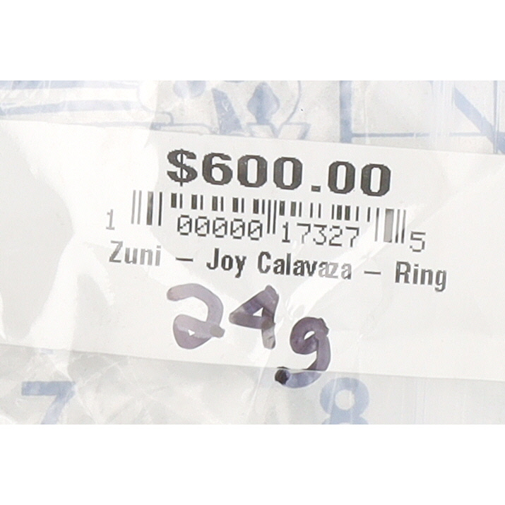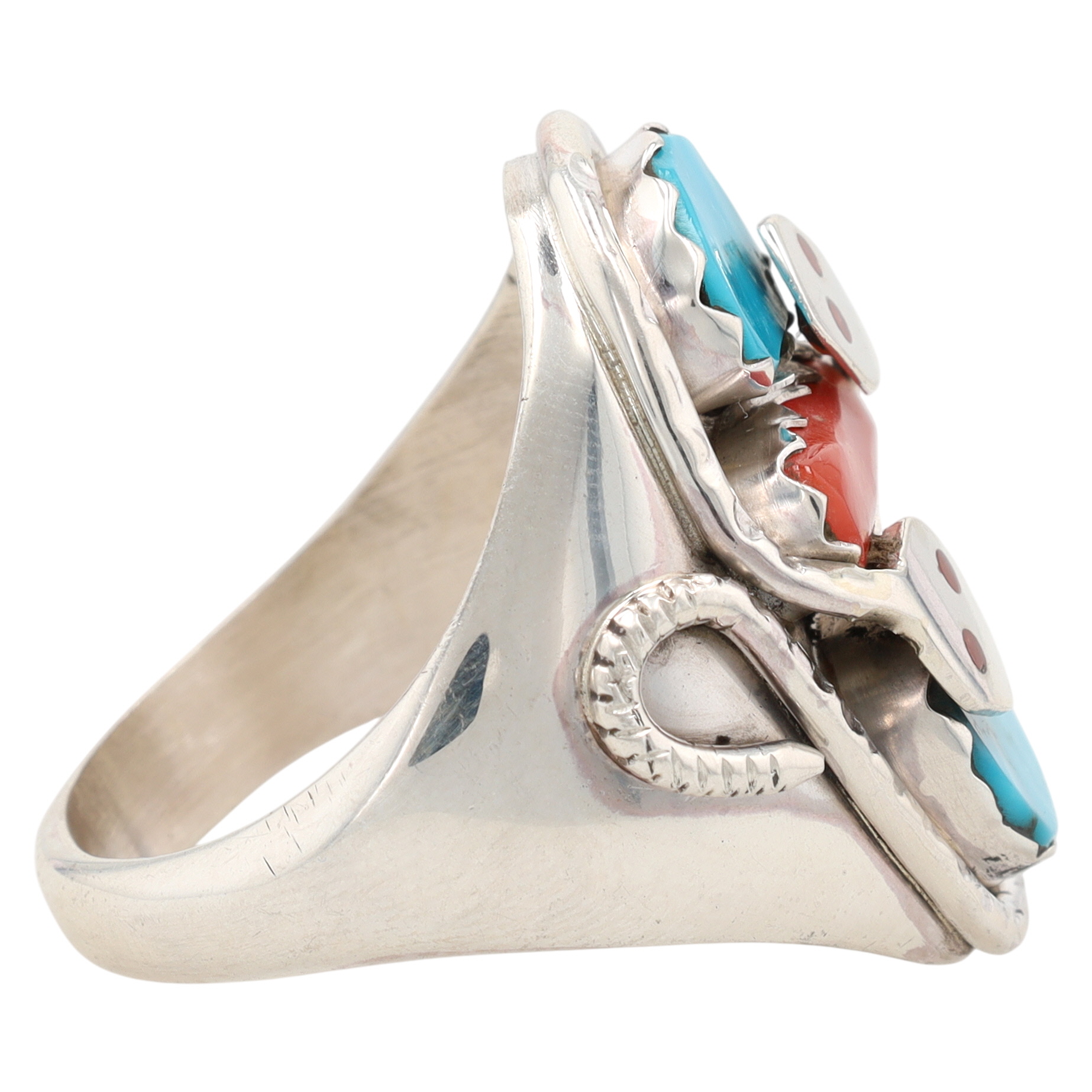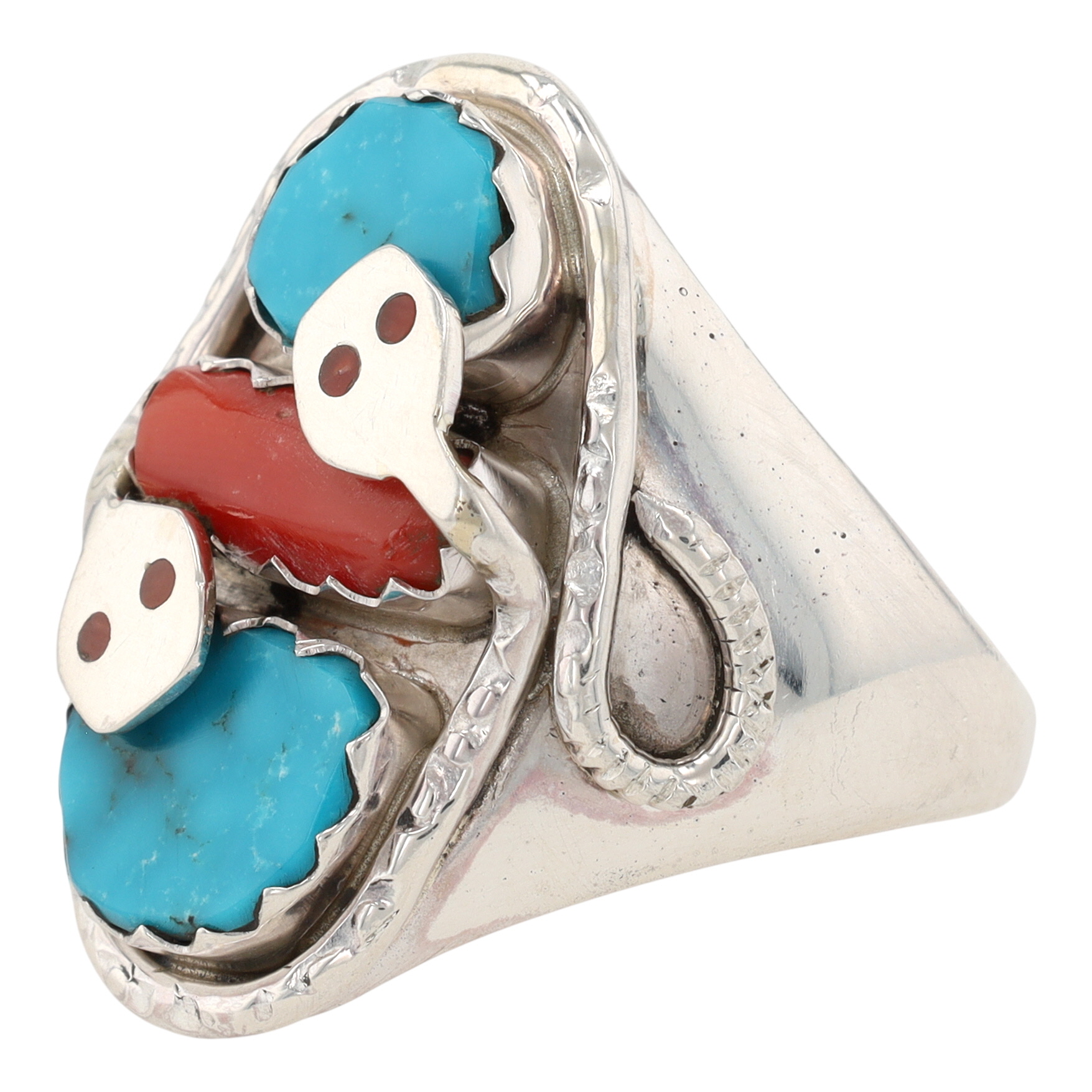 A single silver ring featuring a snake design with two turquoise stones and one red coral stone, with a visible maker’s mark “EFFIE C ZUNI” inside the band, and a label stating “Zuni – Joy Calavaza – Ring”. US size 13, weighing 24g.