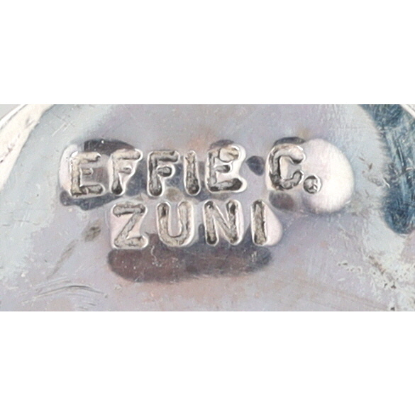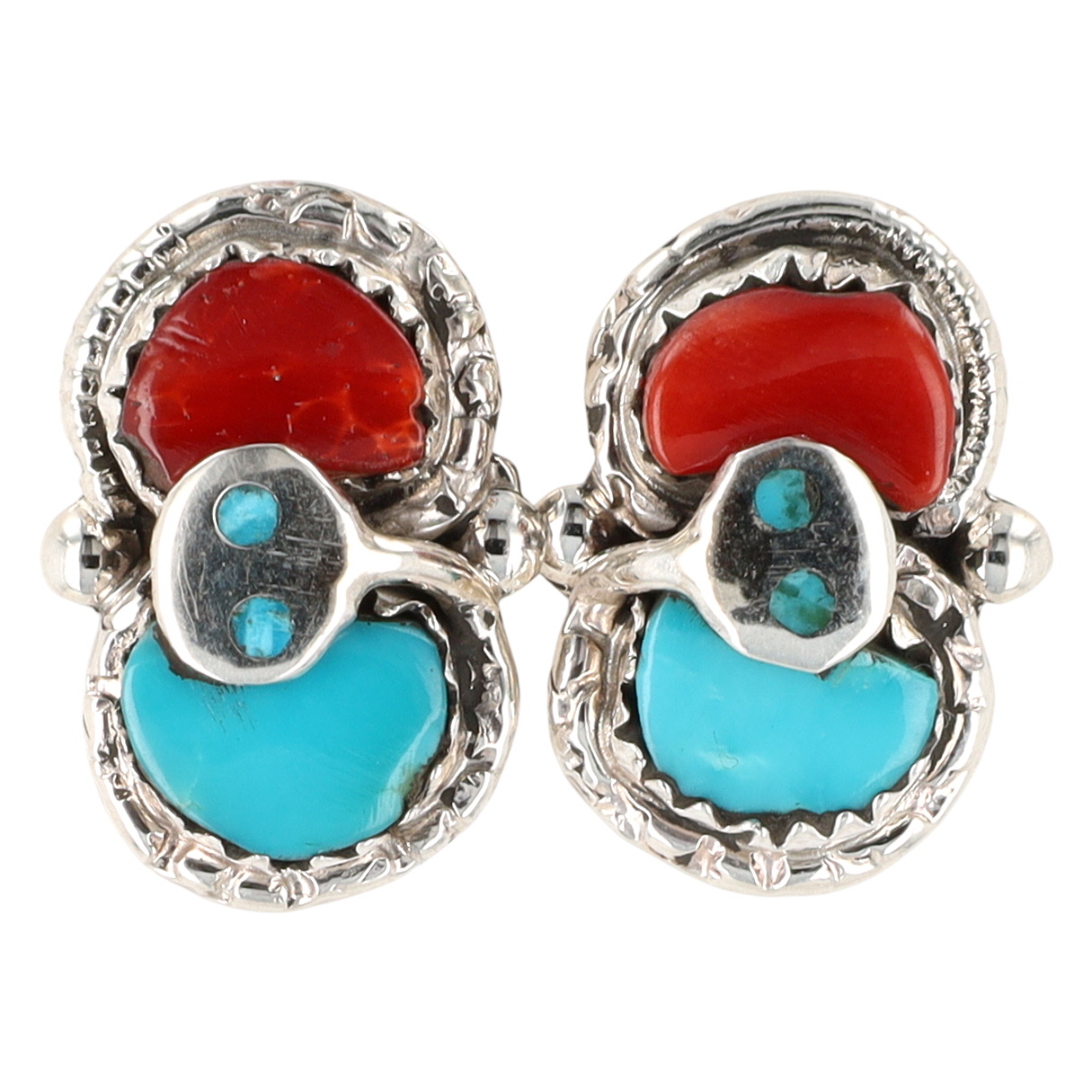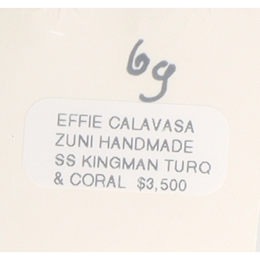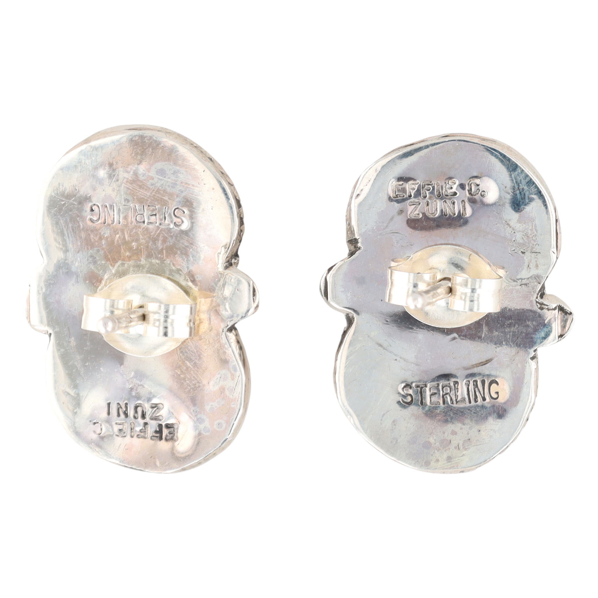 A pair of silver snake earrings, each featuring red coral and blue turquoise stones, marked “EFFIE C. ZUNI” and “STERLING”, accompanied by a label identifying them as “EFFIE CALAVASA ZUNI HANDMADE SS KINGMAN TURQ & CORAL”, measuring approximately 1 inch tall, weighing 6g